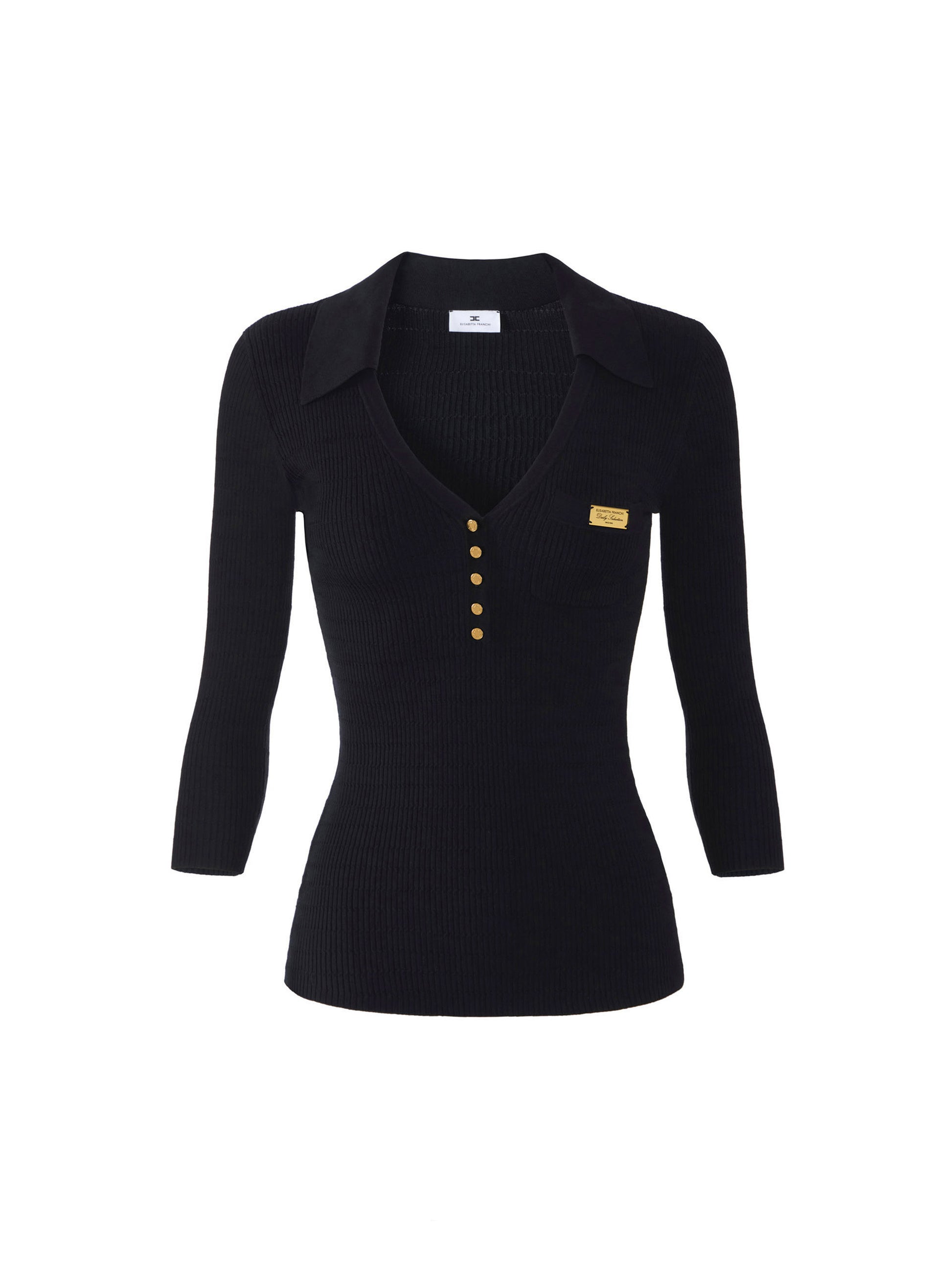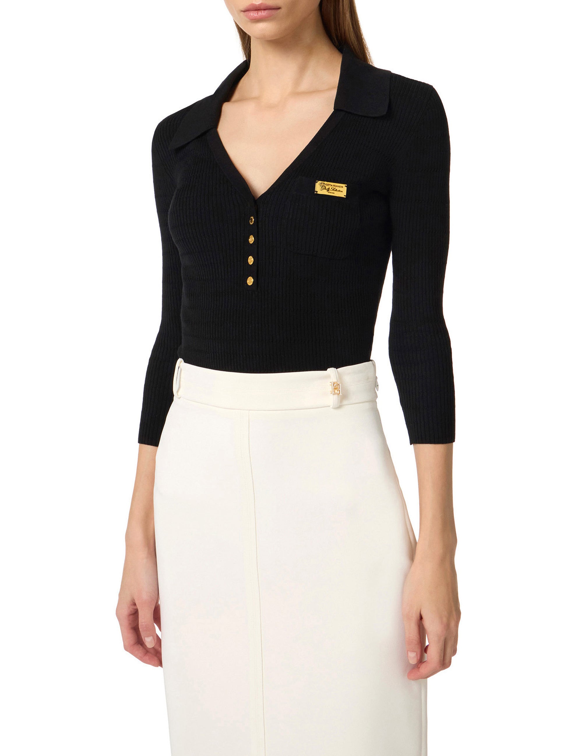 Long-sleeved knit polo shirt. It features elaborate workmanship, with the weave enlivened by micro-braided ribs along its entire length, creating a dynamic tactile pattern. The golden metal buttons and the plaque with logo and lettering on the breast pocket brighten up the garment with luminous stylish details. Slim fit.