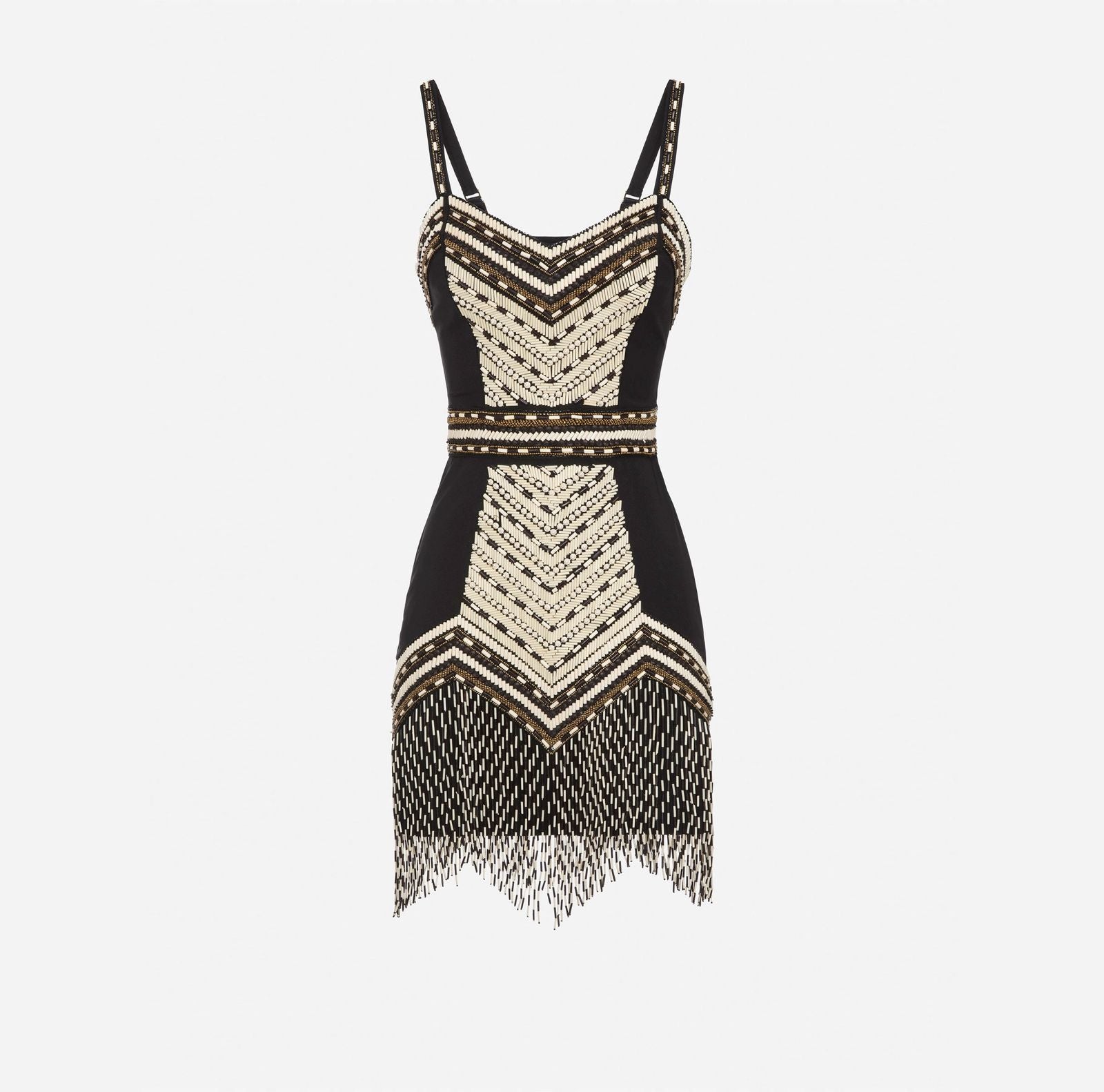 Mini dress in technical fabric with cups and straps. The embroidery with a chevron design highlights the neckline, the waistline and the skirt that ends with two-tone matte-like fringes.