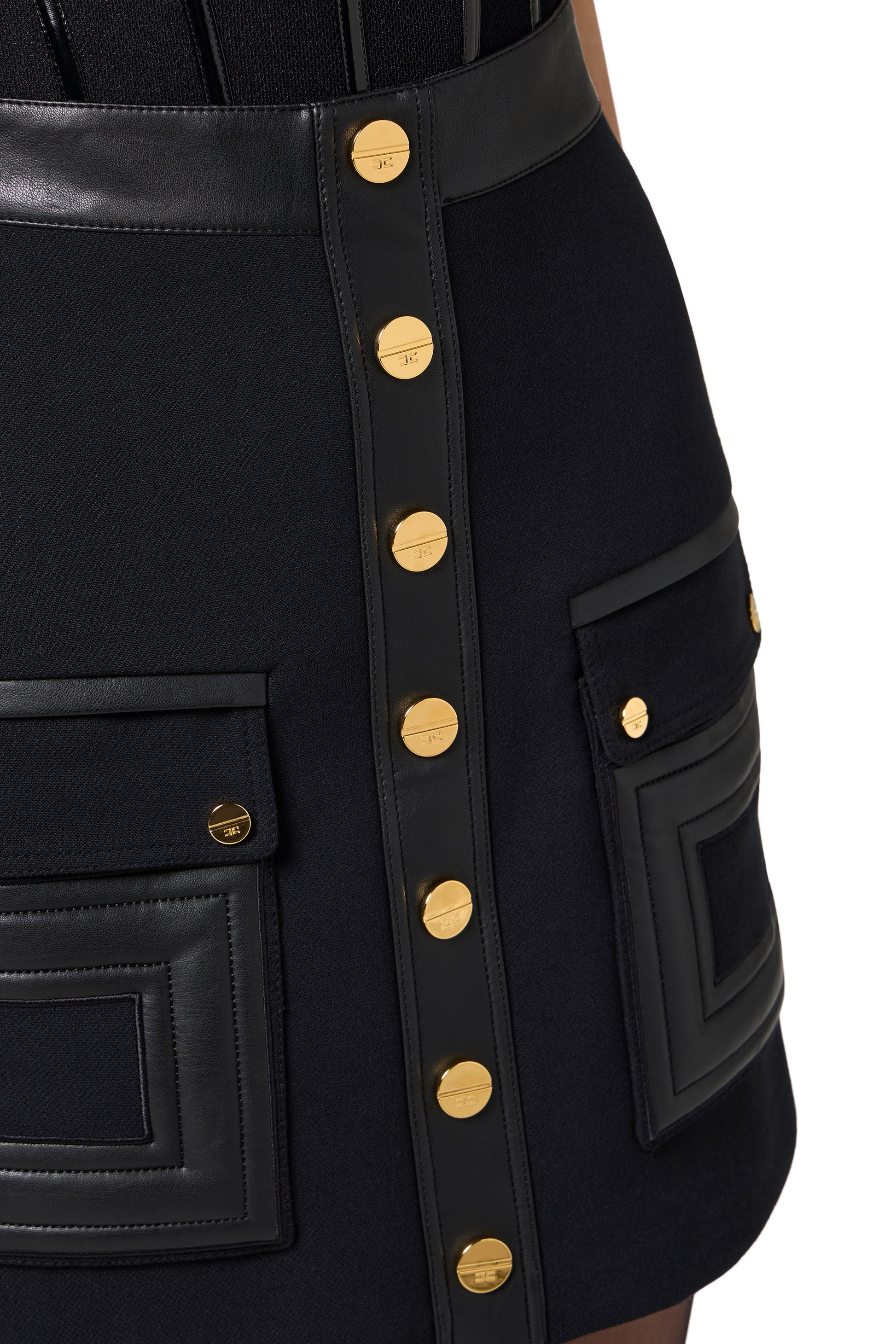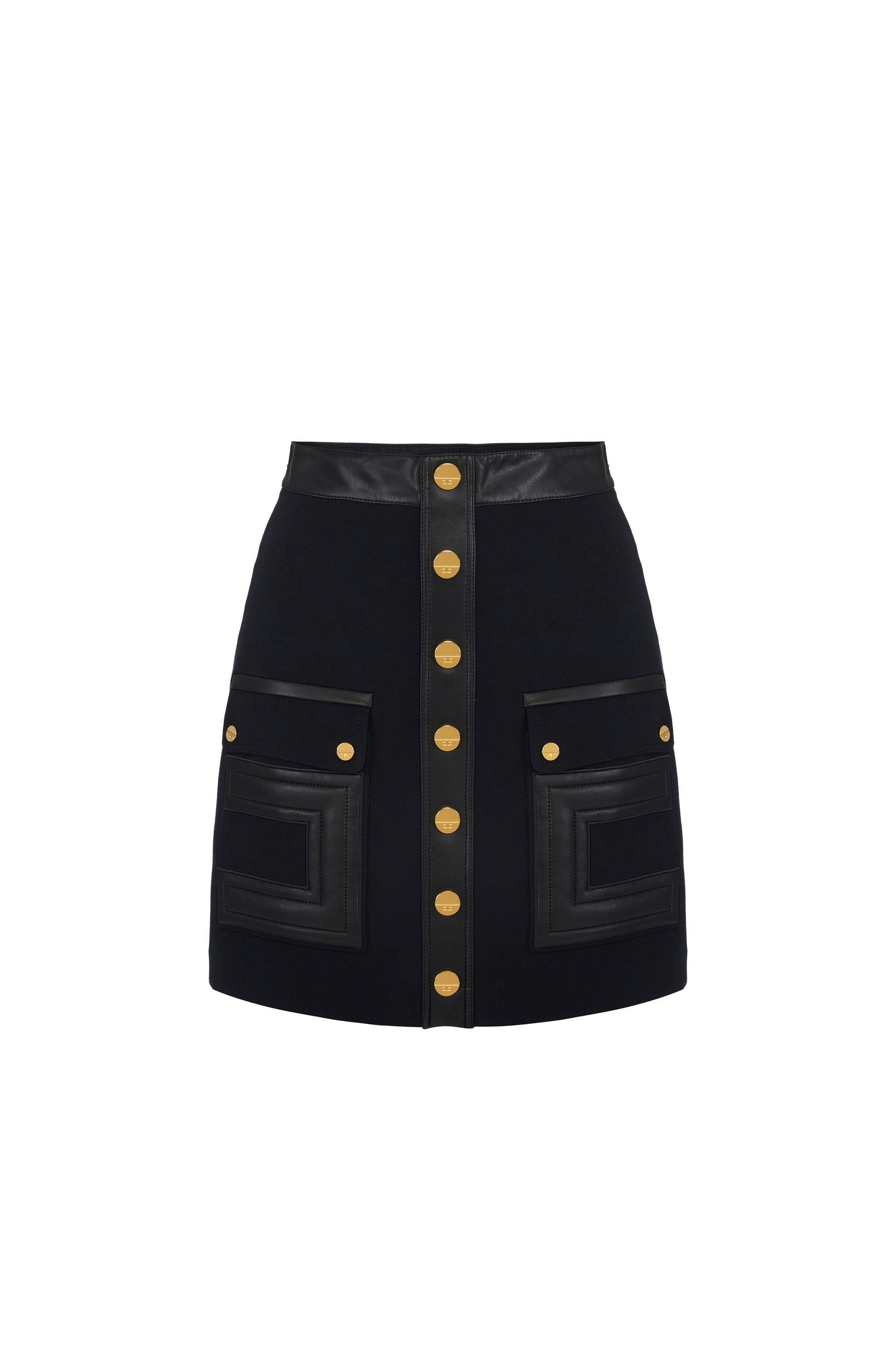 Regular fit mini skirt in double-layer crêpe fabric. It stands out for its matching details that add shine and its patch pockets embellished with embossed logos. Golden metal logo buttons illuminate the garment.
