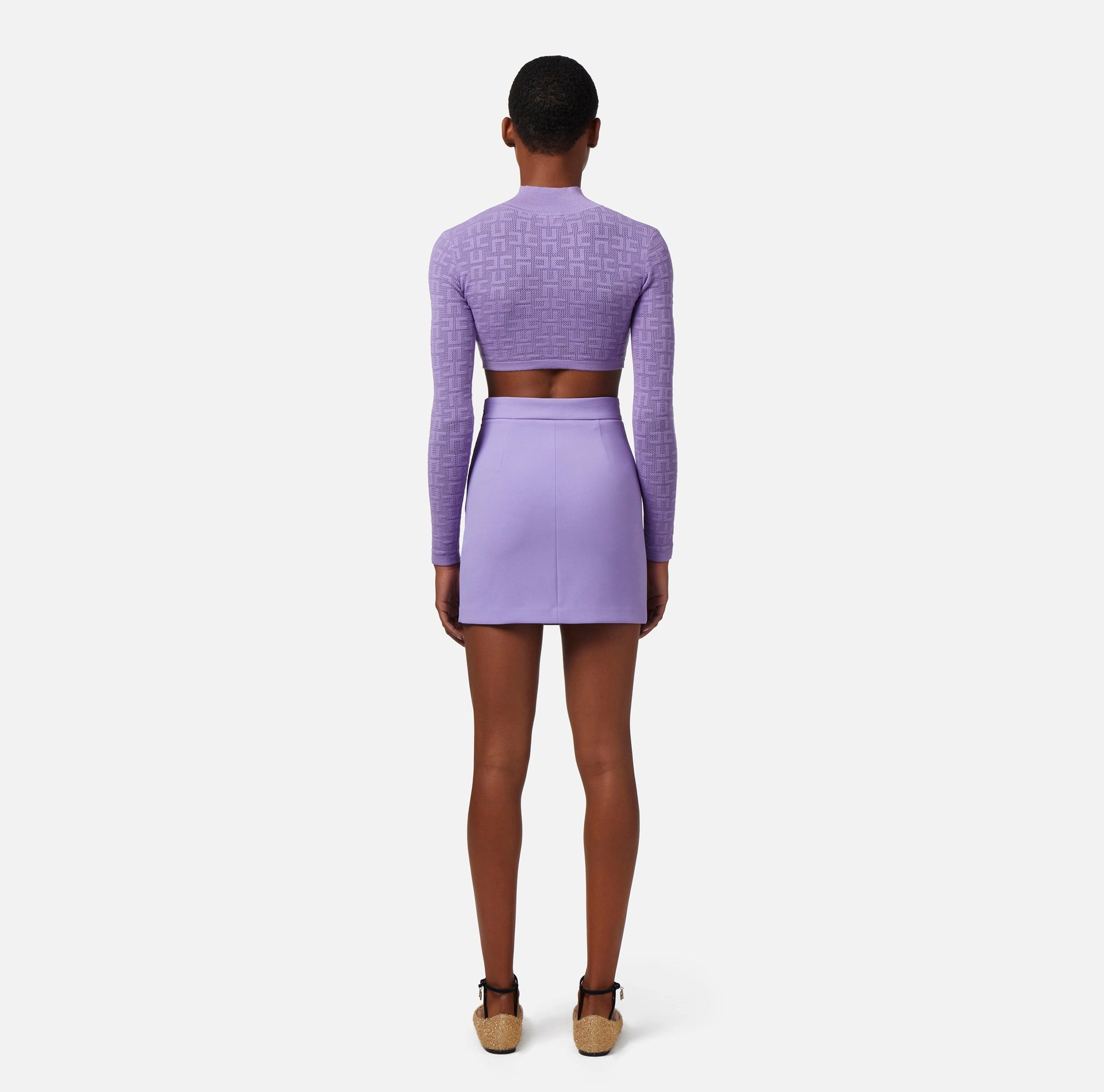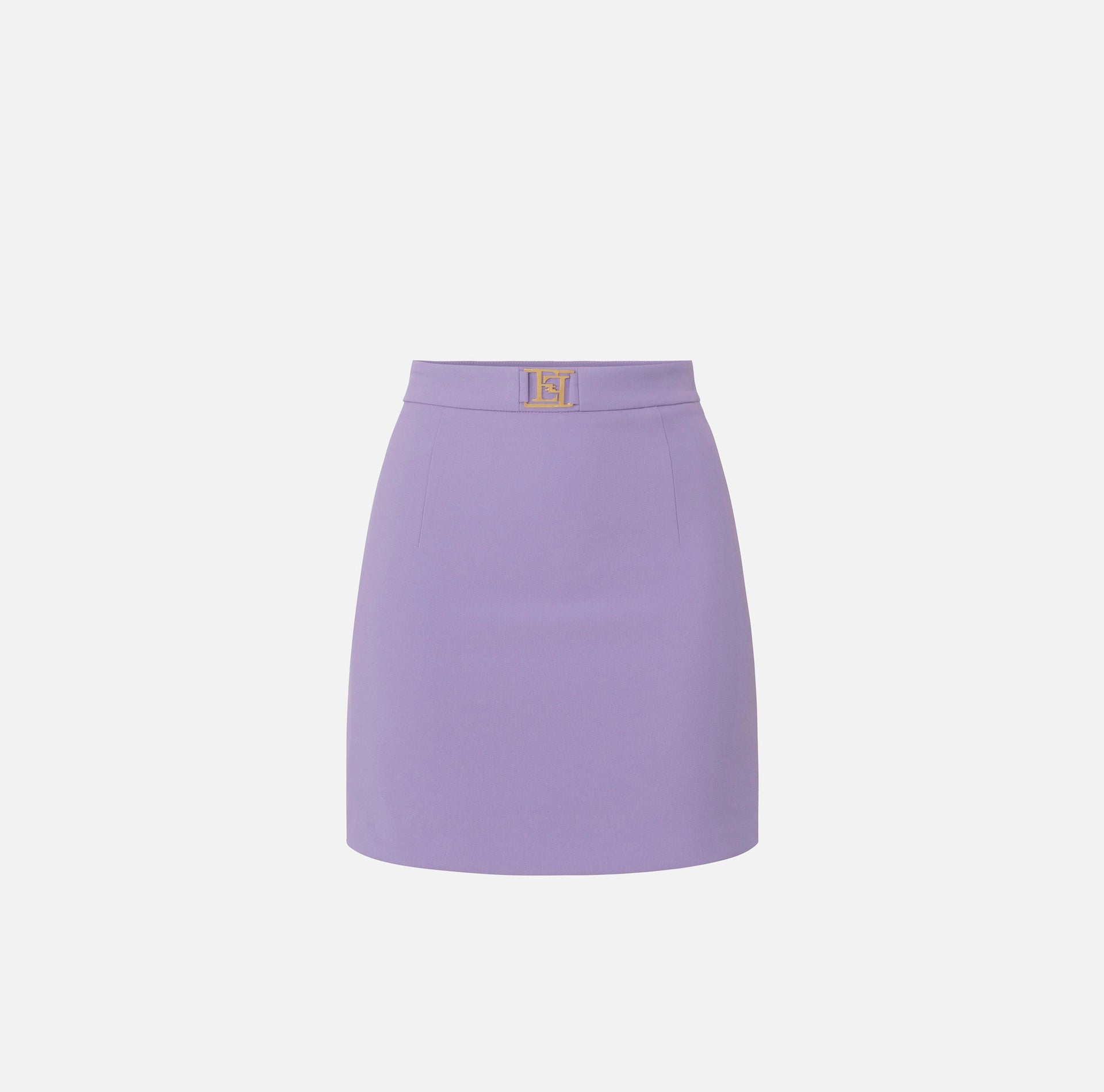 Miniskirt in double layer stretch crêpe. It features a waistband with a golden metal logo plaque.