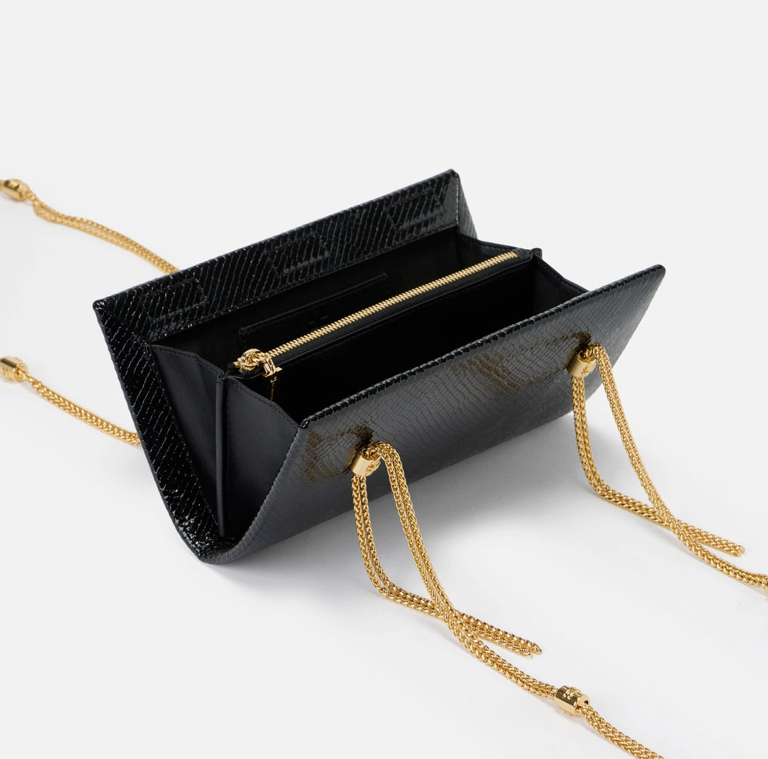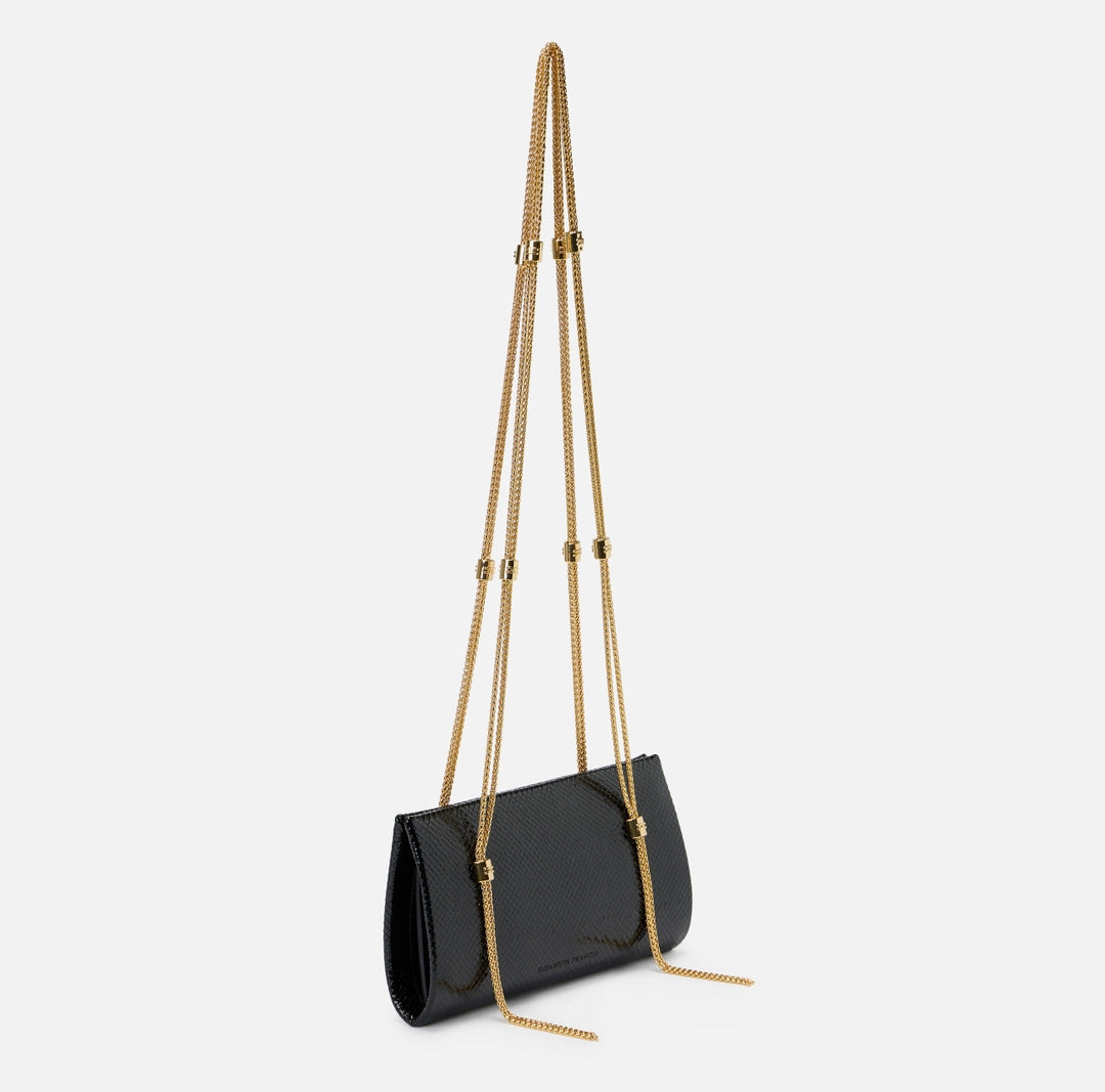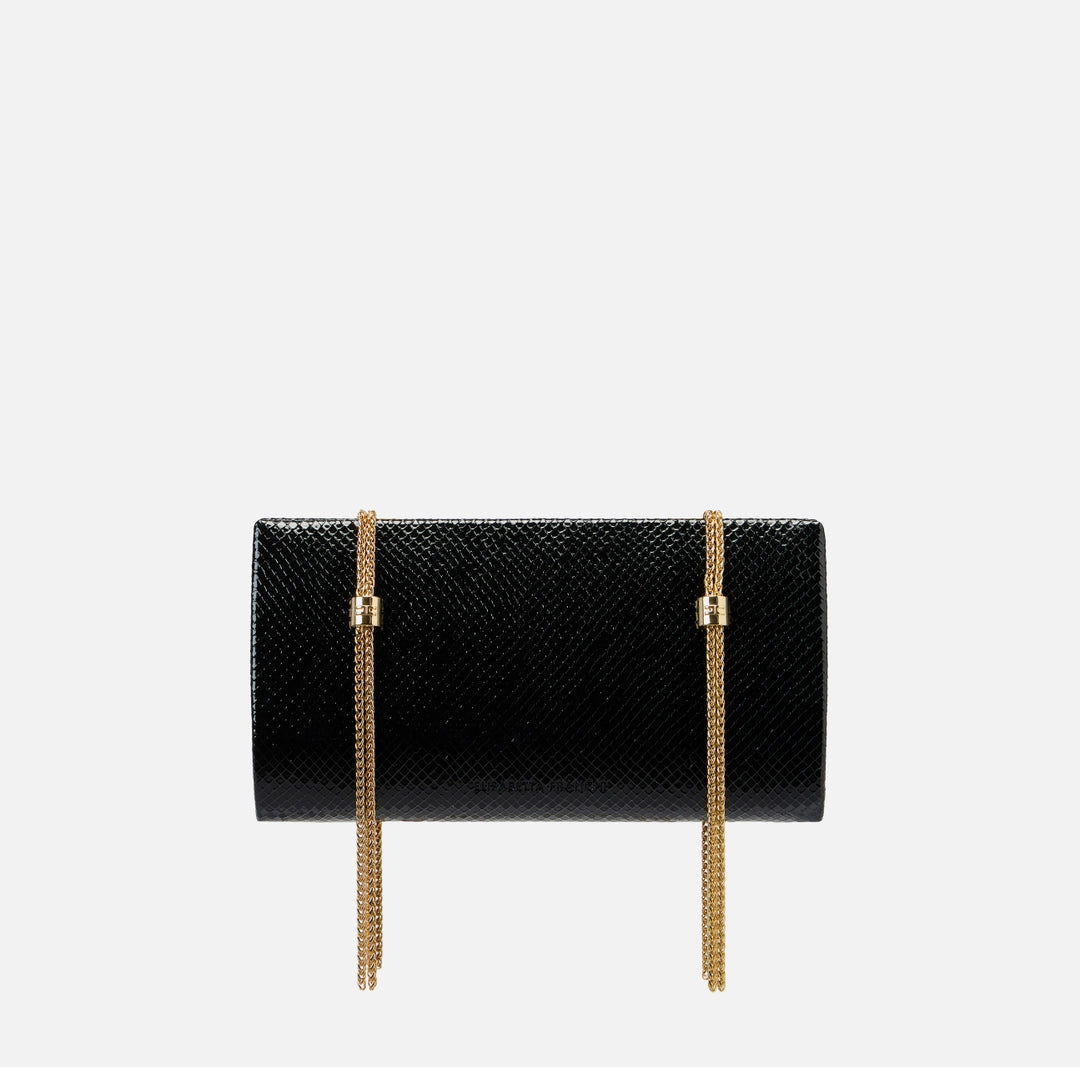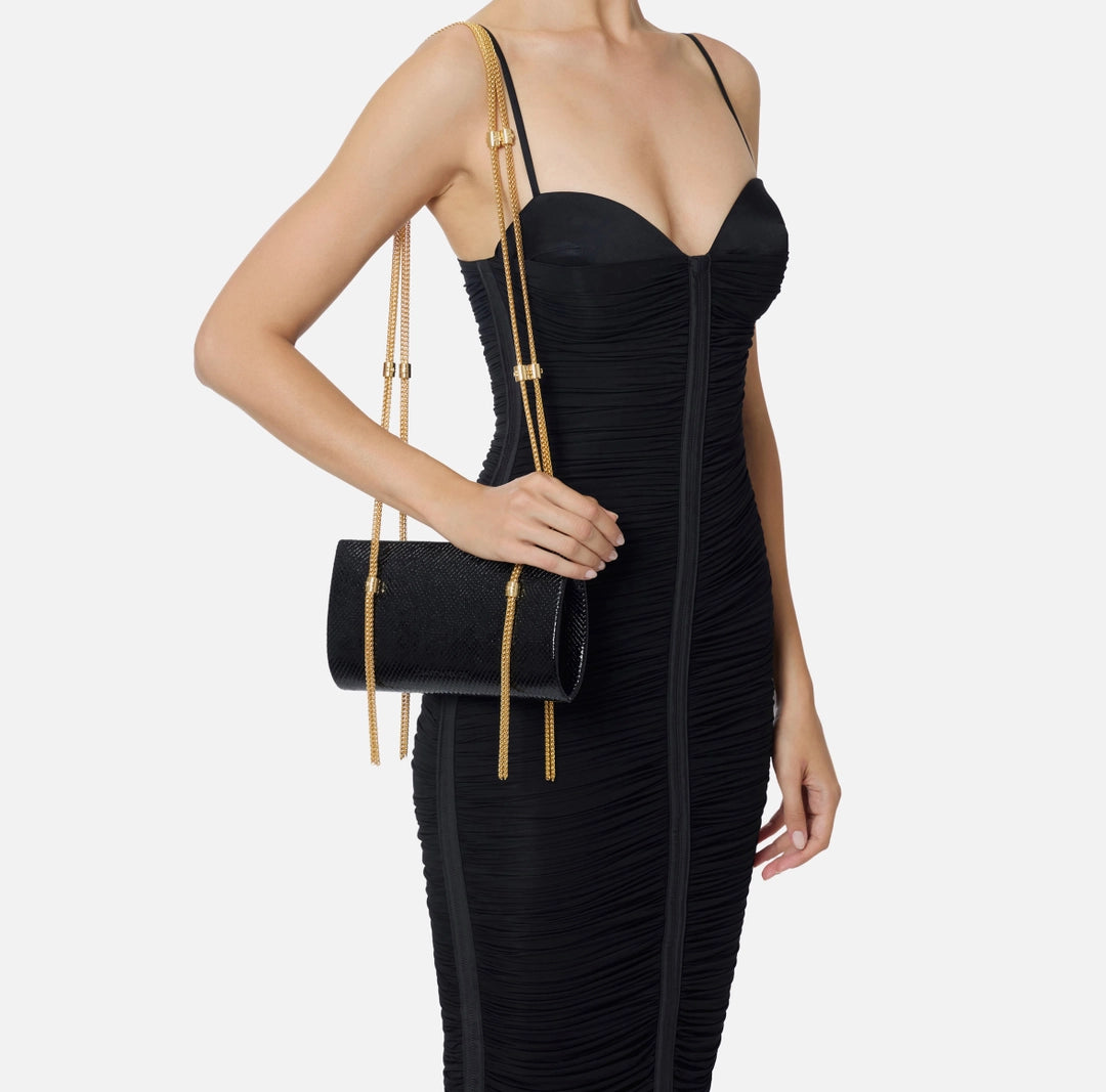 Bag made of synthetic material with python effect texture. Distinguished by a double-chain shoulder strap with gold finish, embellished with logo details. Personalized with hot-stamped central logo.