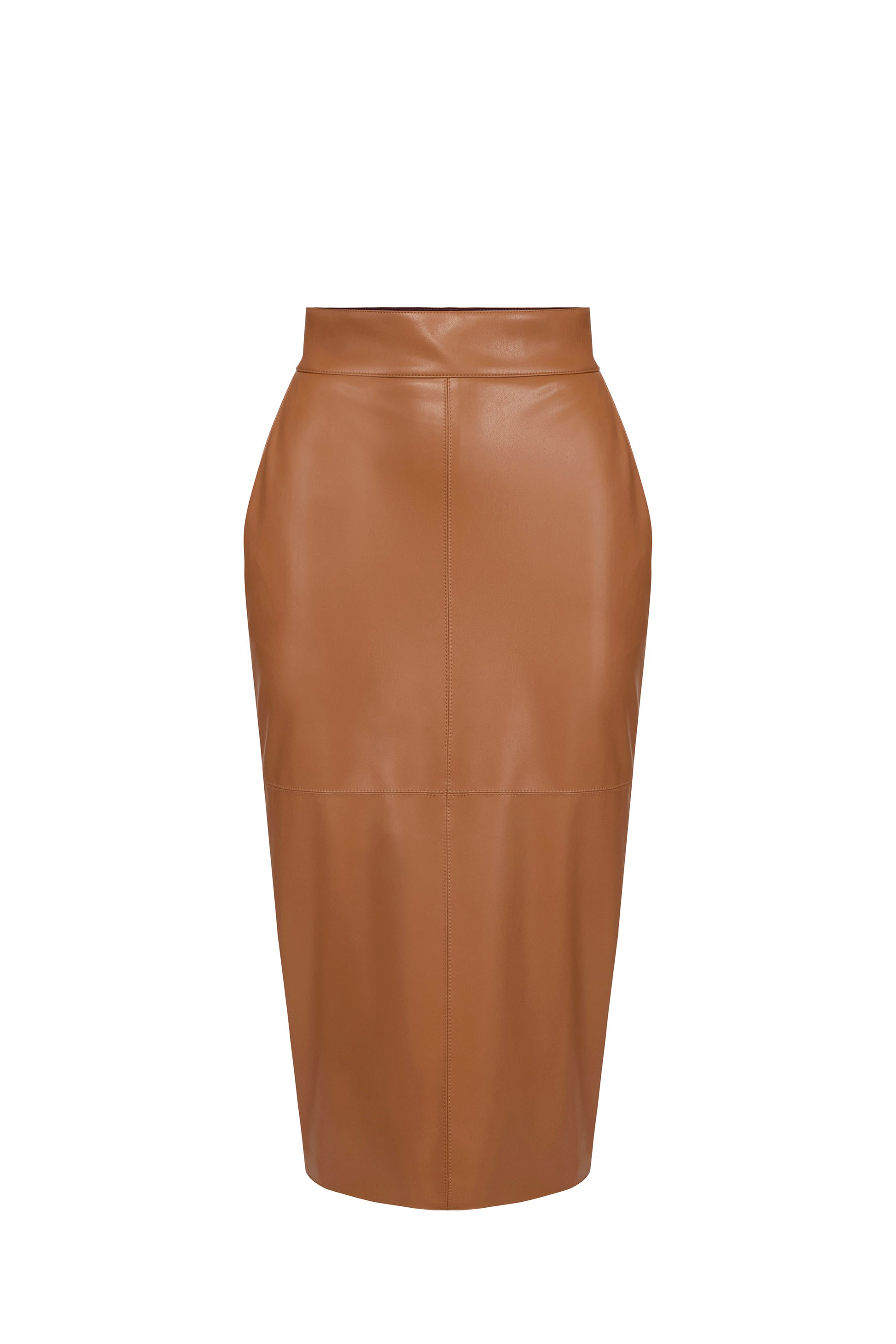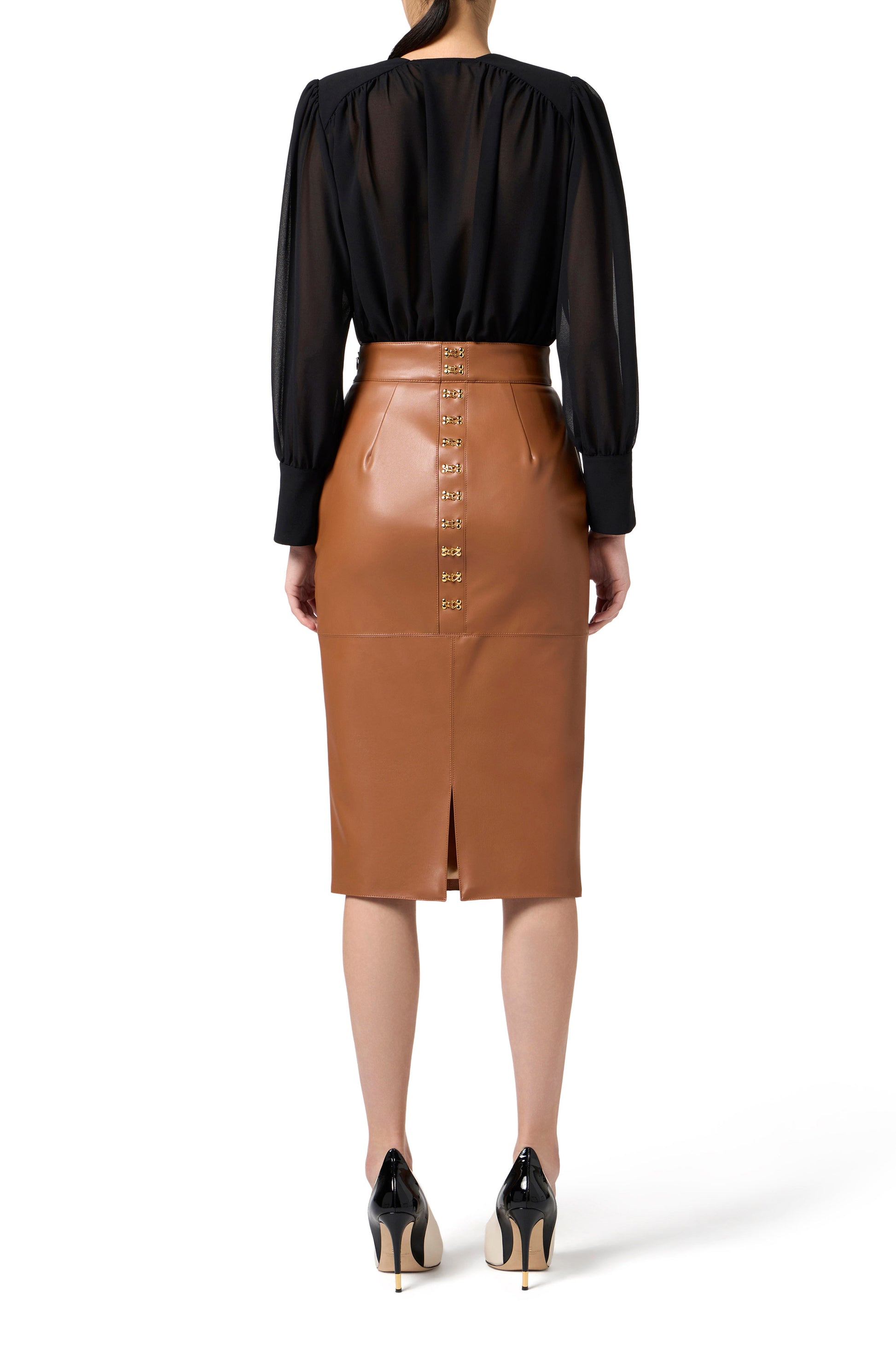 Pencil skirt made in nappa leather-effect synthetic material. It stands apart for its cuts with topstitchings that bestow structure to the garment. The back with golden metal jewel clasps is inspired by the world of corsetry, giving a striking effect. Slim fit.