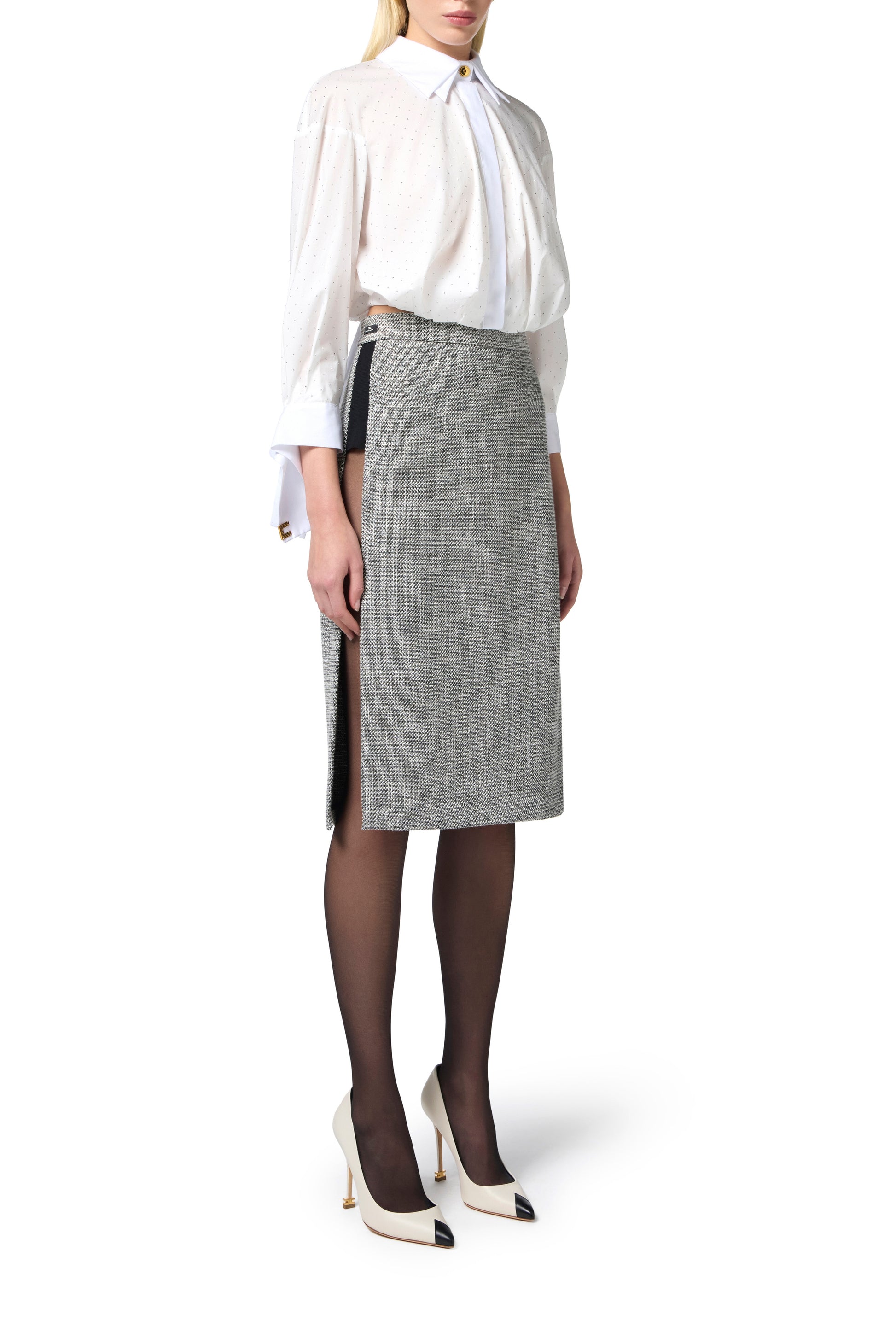 Poplin shirt with double collar and ¾ sleeves with ribbon, embellished with a visible button and golden metal logo appliqués. The all-over metal rhinestones are the protagonist. The back opening knotted at the bottom gives a striking effect. Regular fit.
