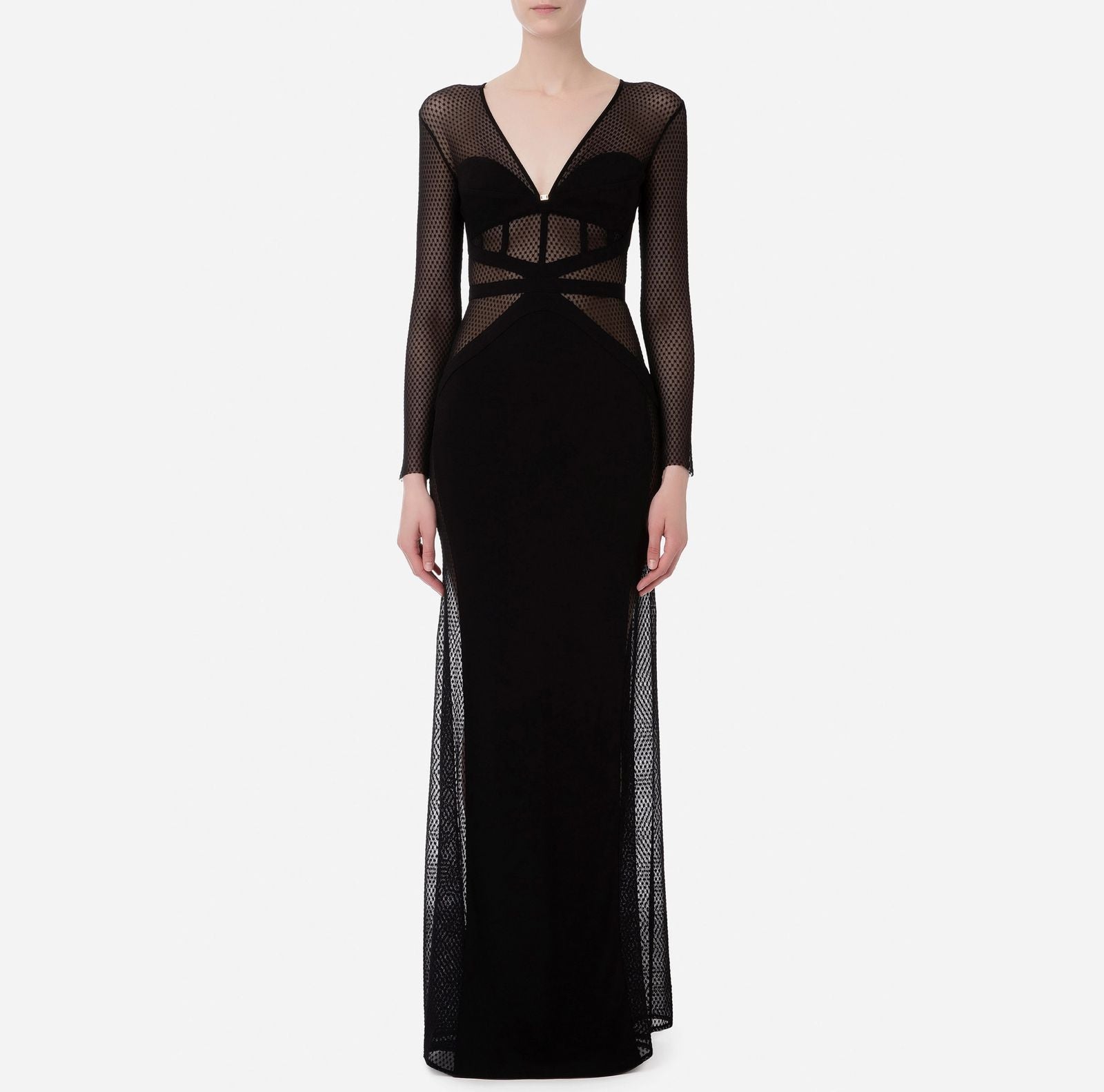 Long dress, in flowing jersey, with tulle cut-outs that intersect at the front creating a see-through effect.