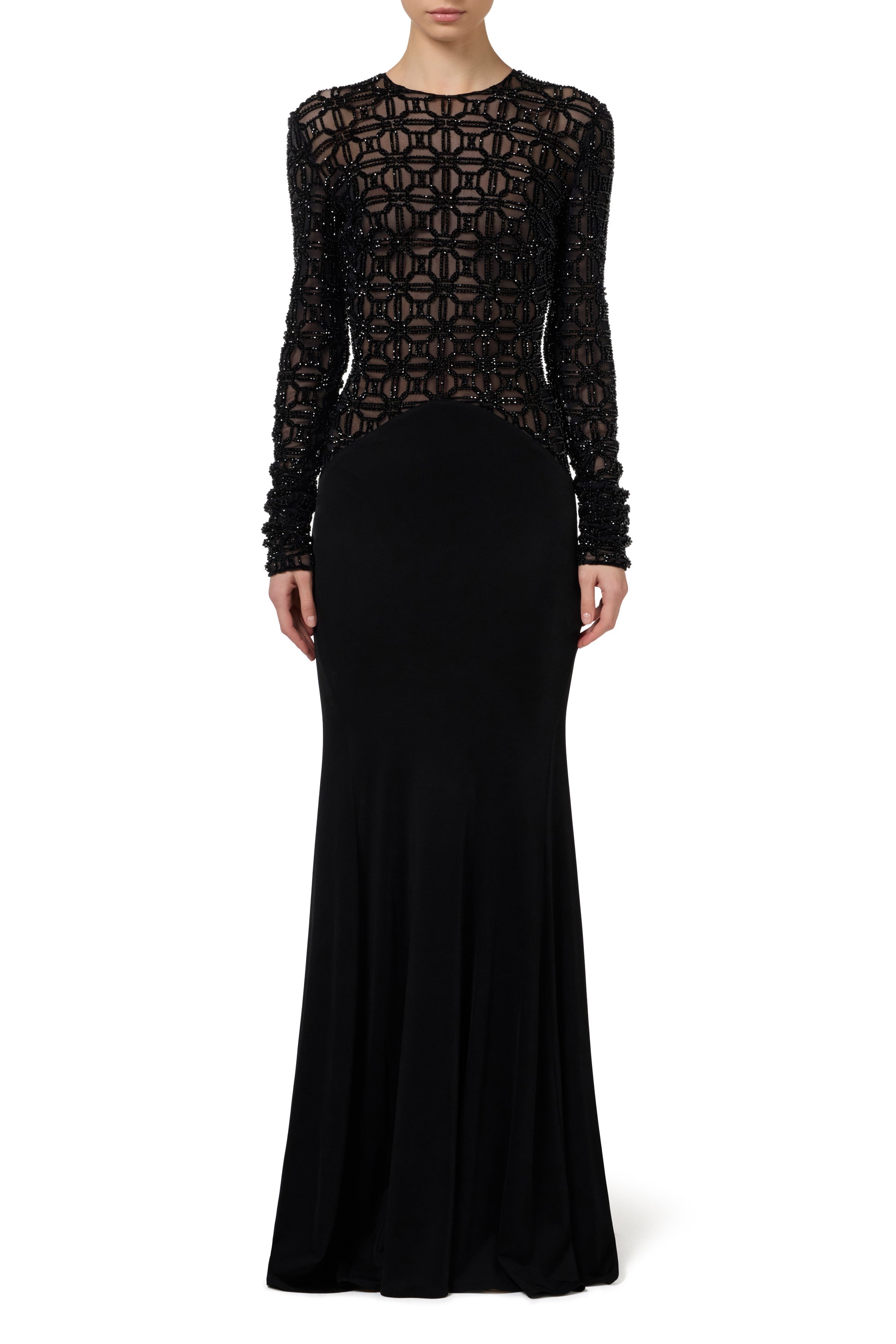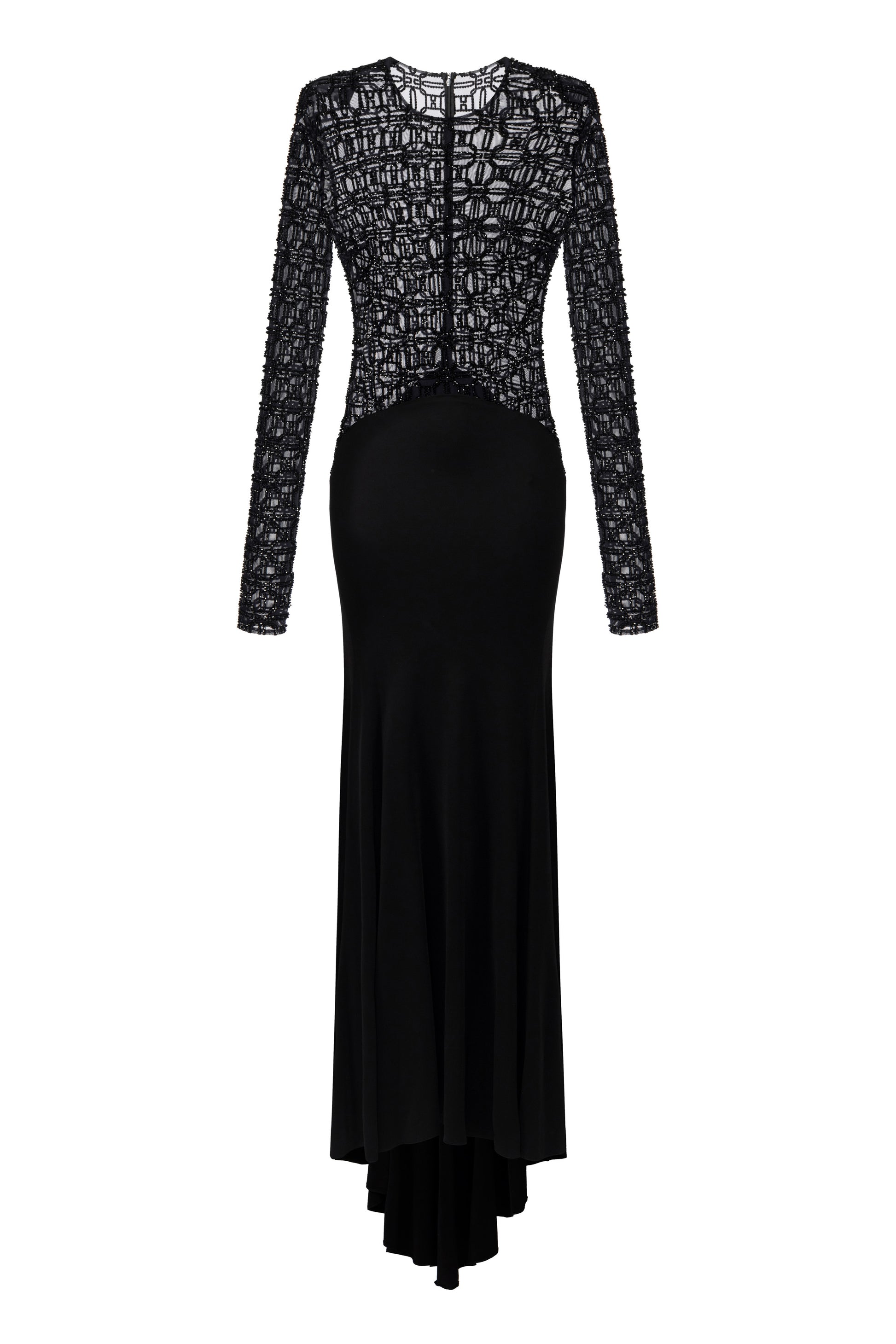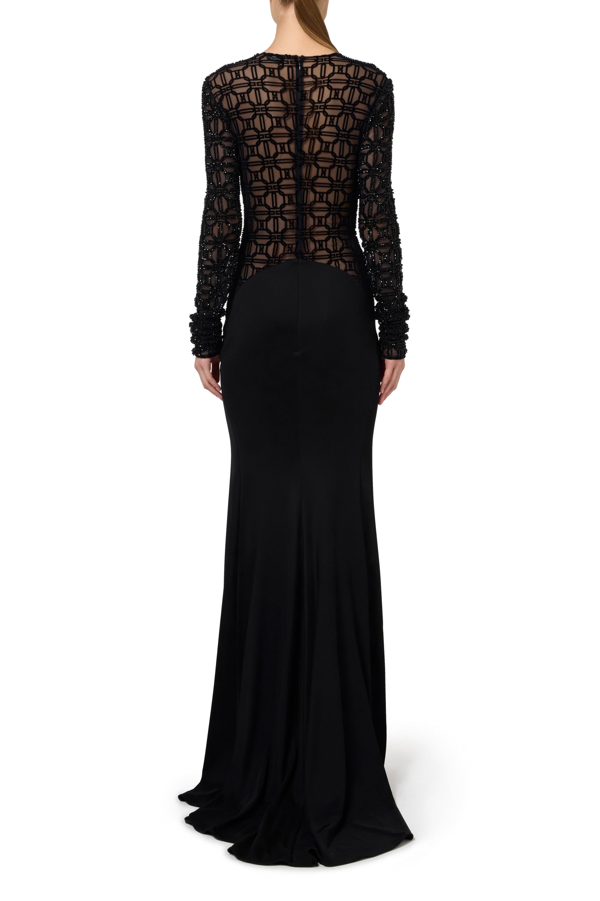 Red carpet crêpe jersey dress with long sleeves and crew neck. It features a fitted tulle bodice embroidered with micro-rhinestones with a rounded cut at the bottom.
