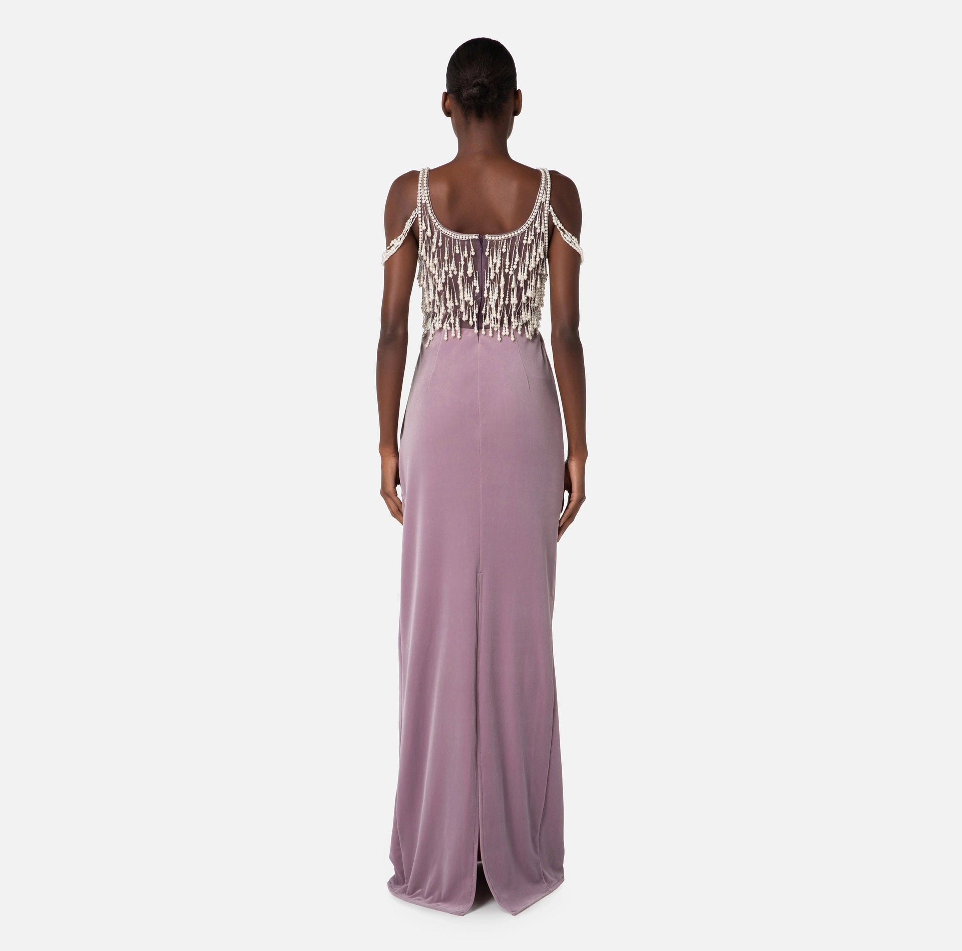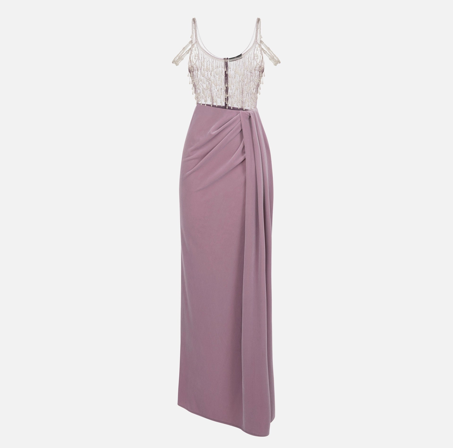 Red Carpet tulle dress with fluid velvet draped skirt. It features a pearl-embroidered bodice and dropped shoulder detail