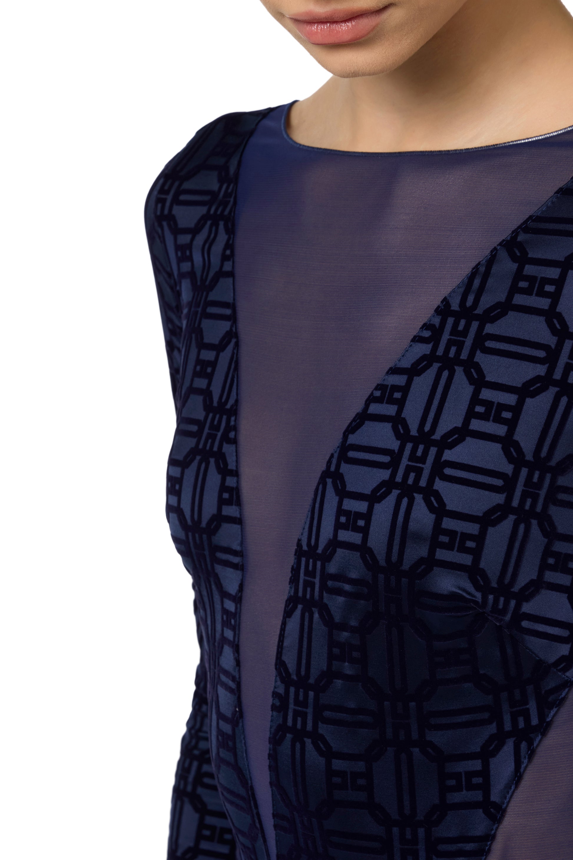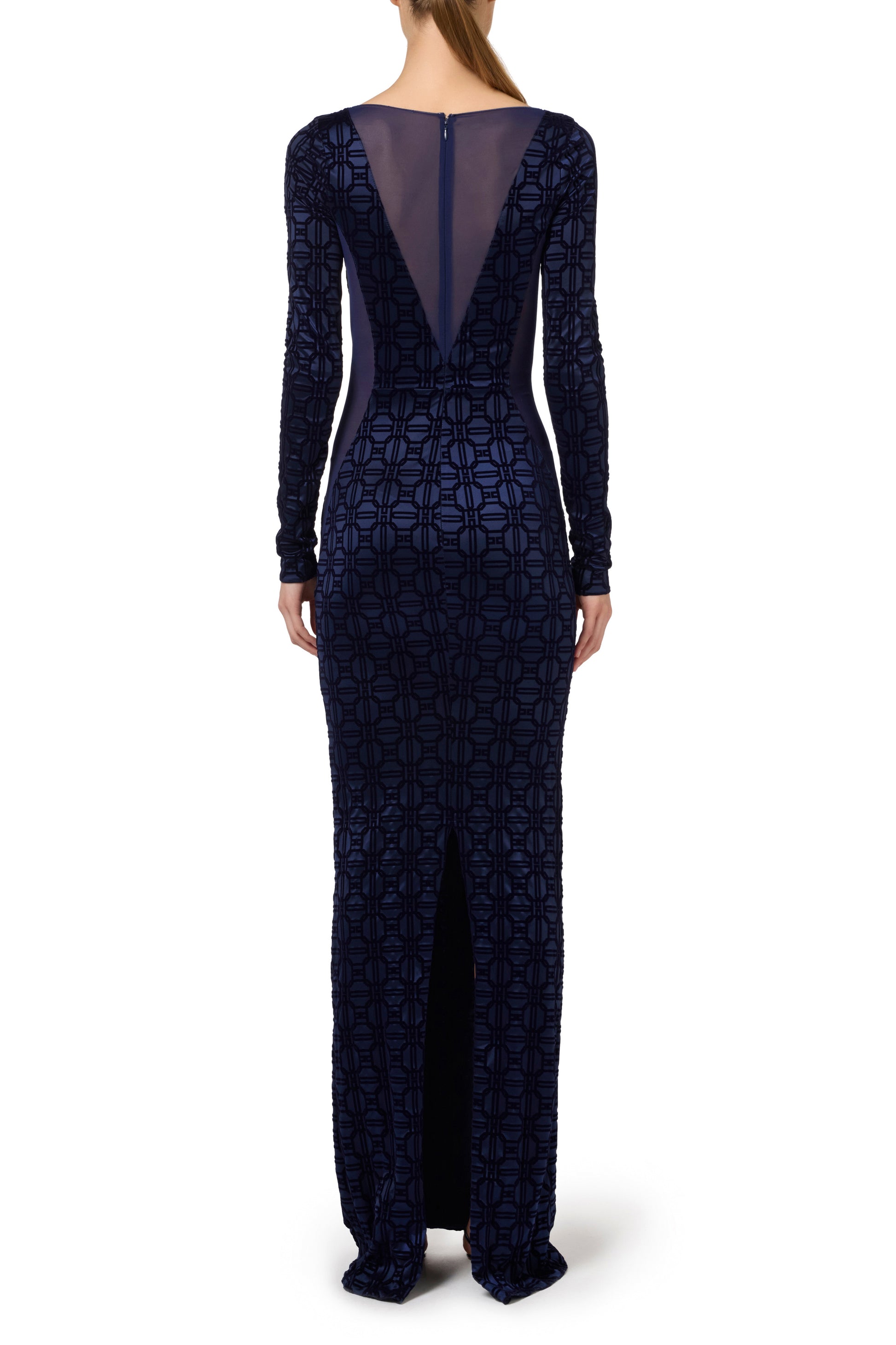 Red carpet dress made of all-over flock Lycra fabric with long glove sleeves and boat neck. It features stretch tulle inserts that create see-through details on the hips and the décolletage with a plunging neckline.