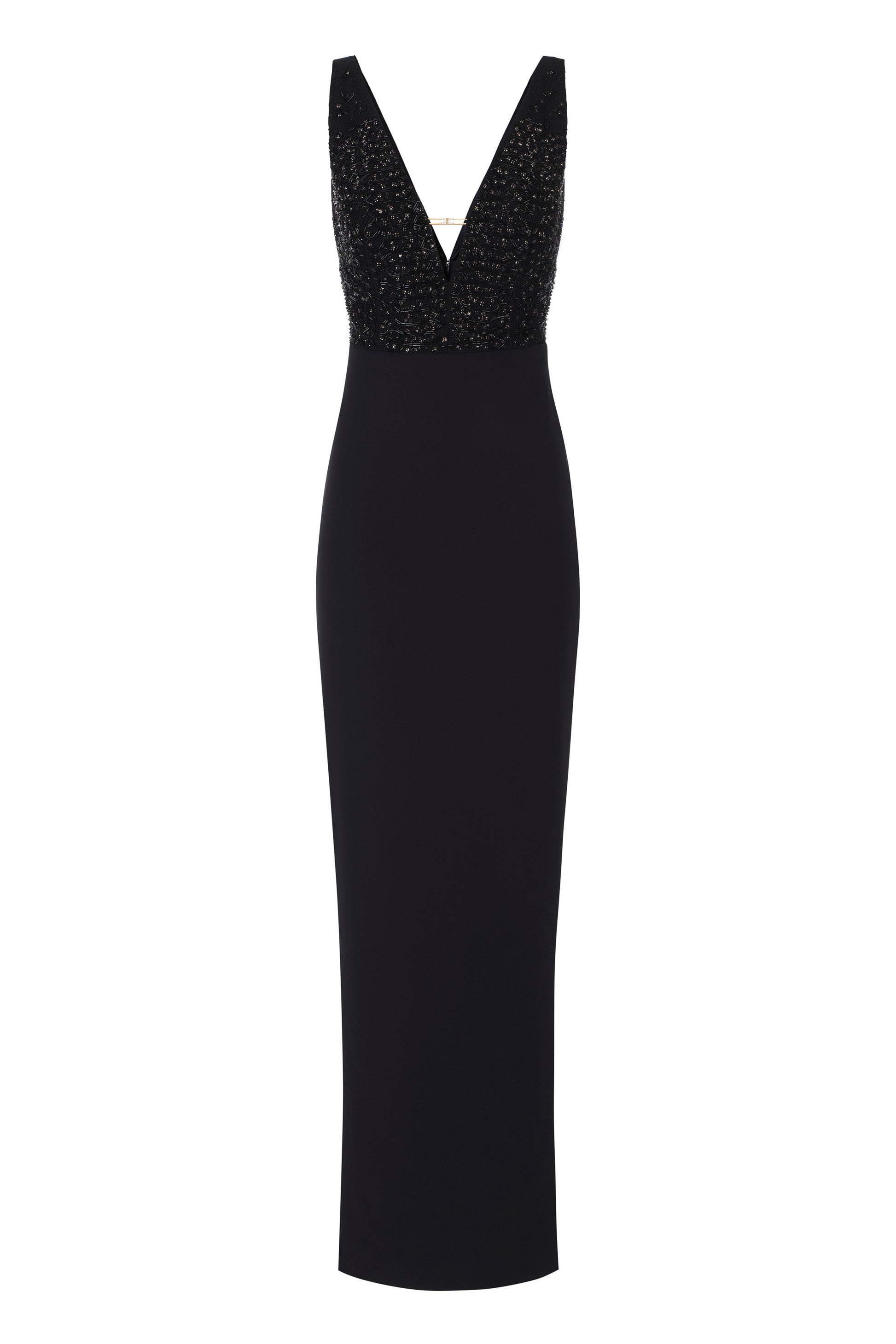 Evening dress in georgette fabric with slim fit. The dress is sleeveless with a plunging neckline and is embellished with a logo jewel detail. The top is decorated with embroidered crystals for a sparkling touch, while the skirt in crêpe fabric has a column line and a deep side slit for a bold silhouette.