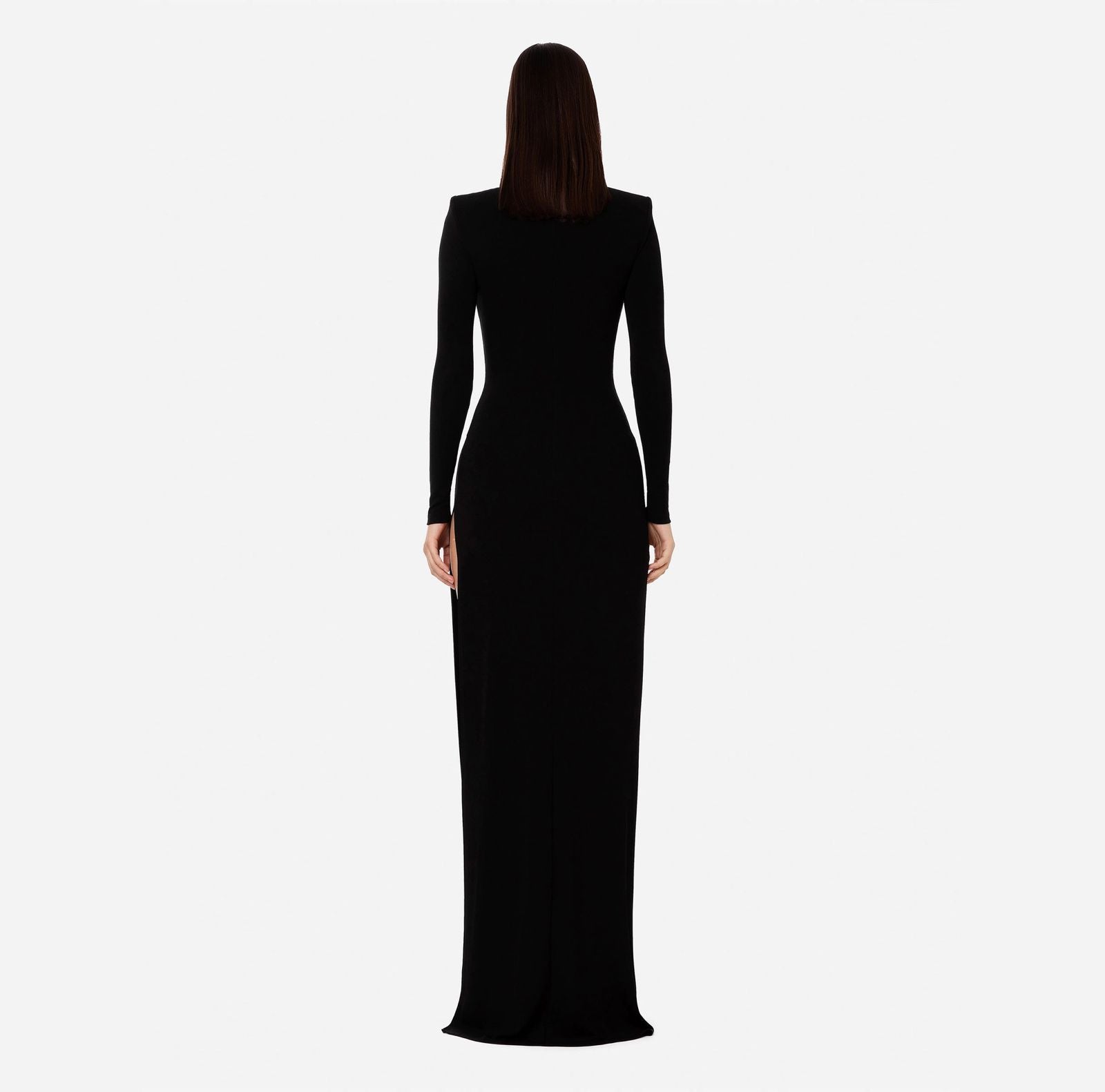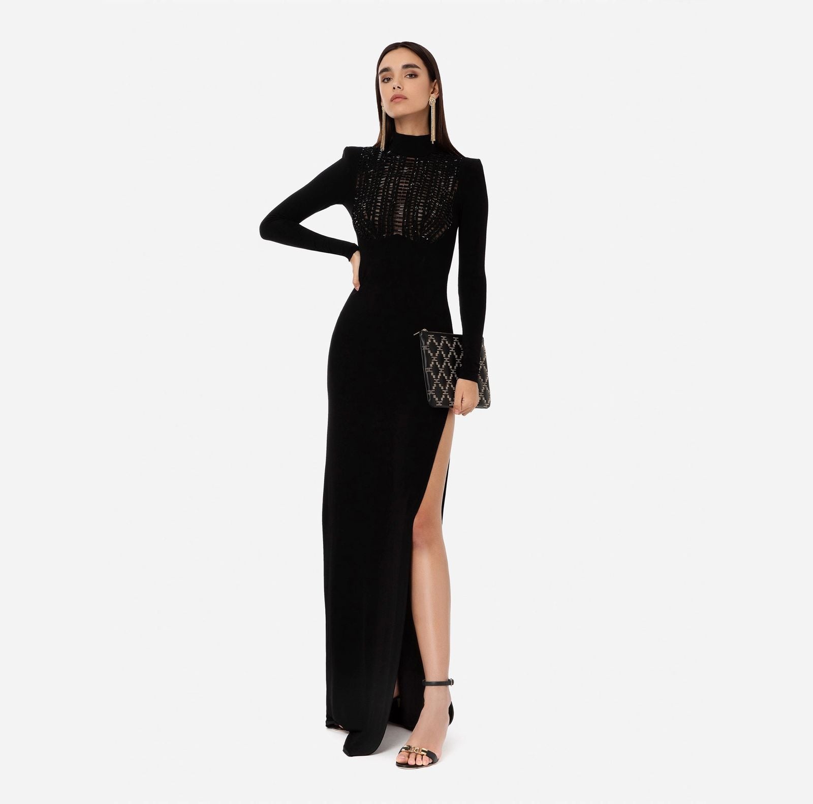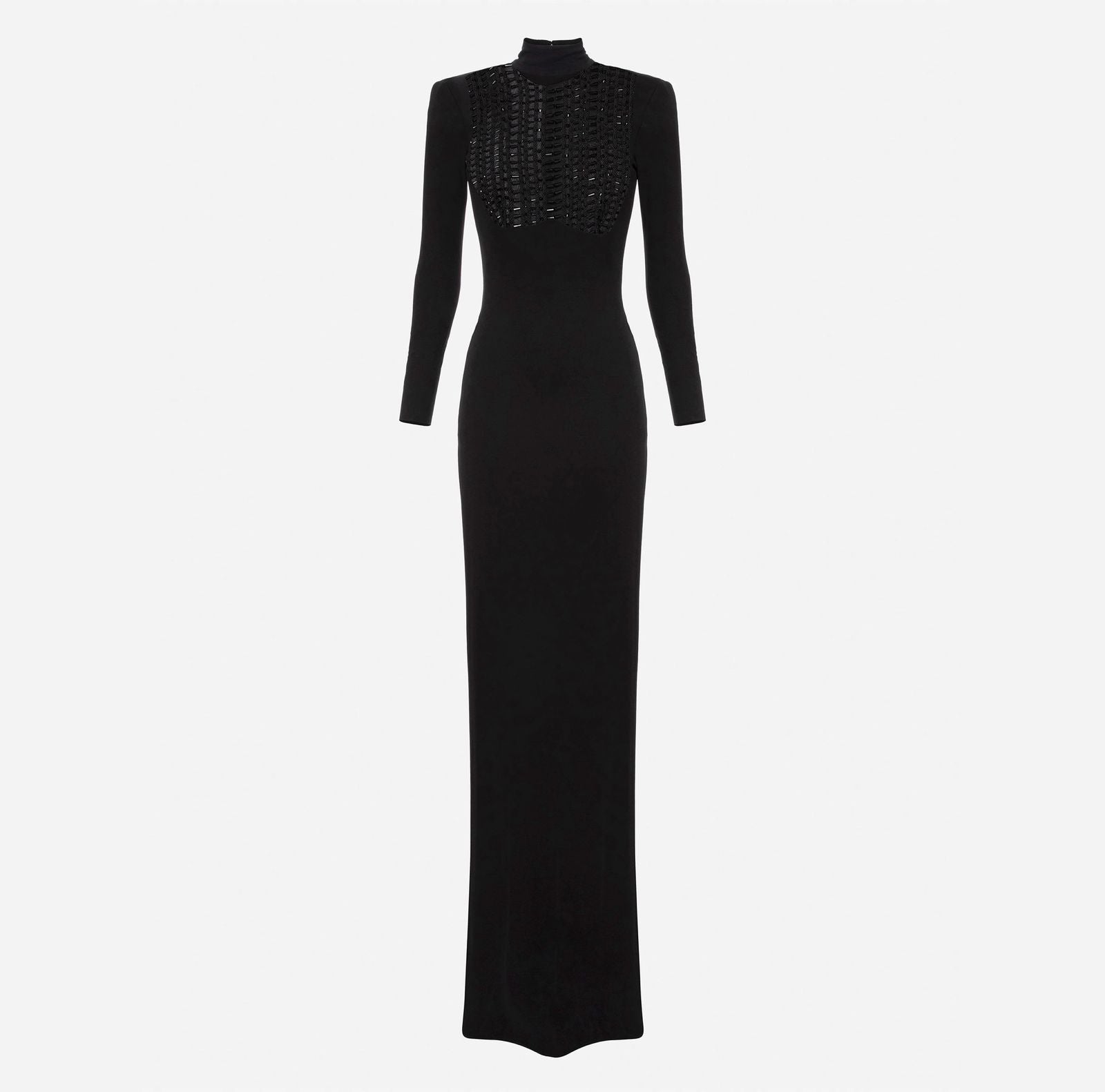 Long jersey dress with high neck and embroidered ascot tie which highlights the silhouette of the neckline.