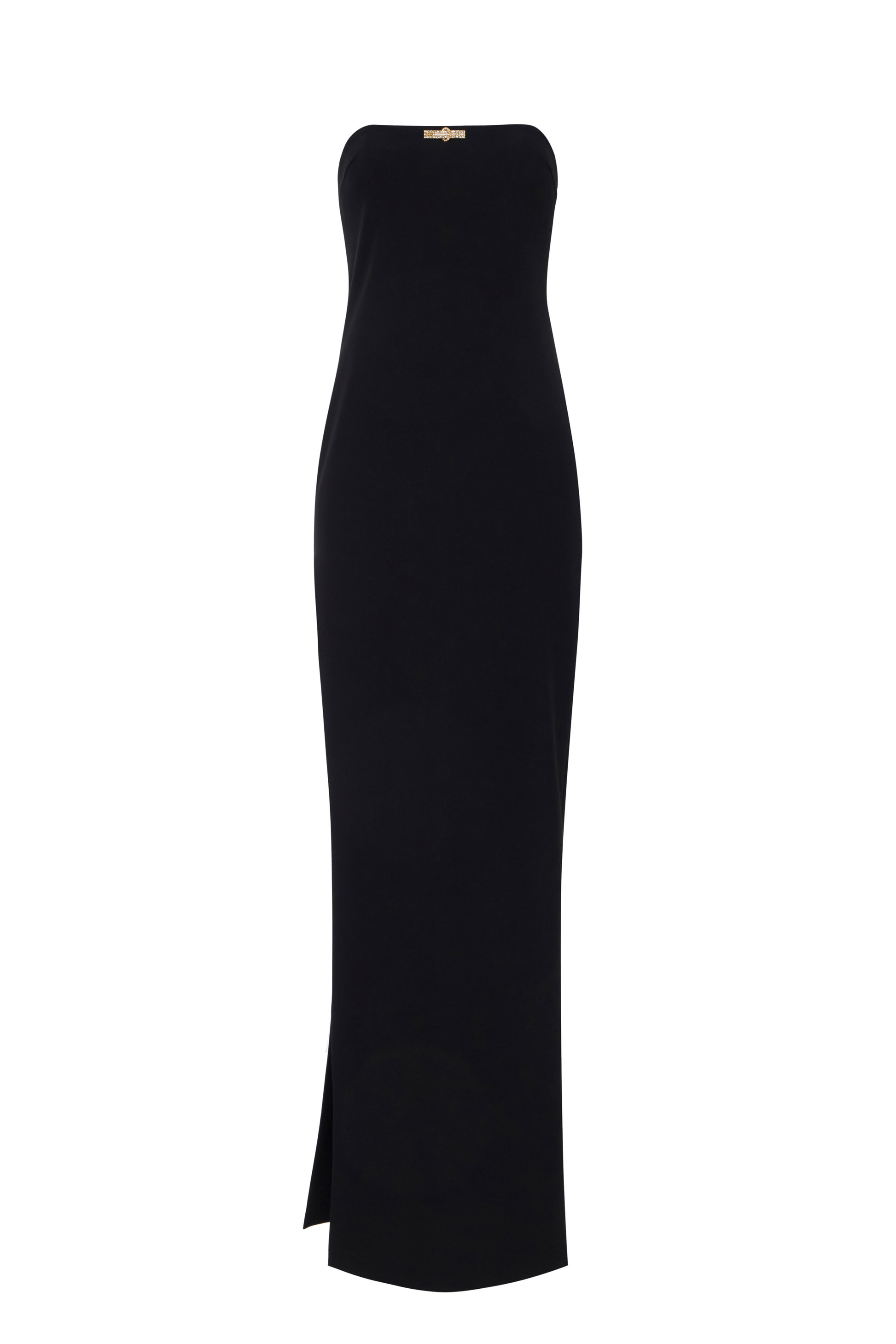 Evening dress with lightweight double layer crêpe fabric. The dress features bare shoulders and stands out for its essential construction, embellished by the rhinestones appliqué on the top. The skirt has a side slit, being perfect for slimming the silhouette. Slim fit.