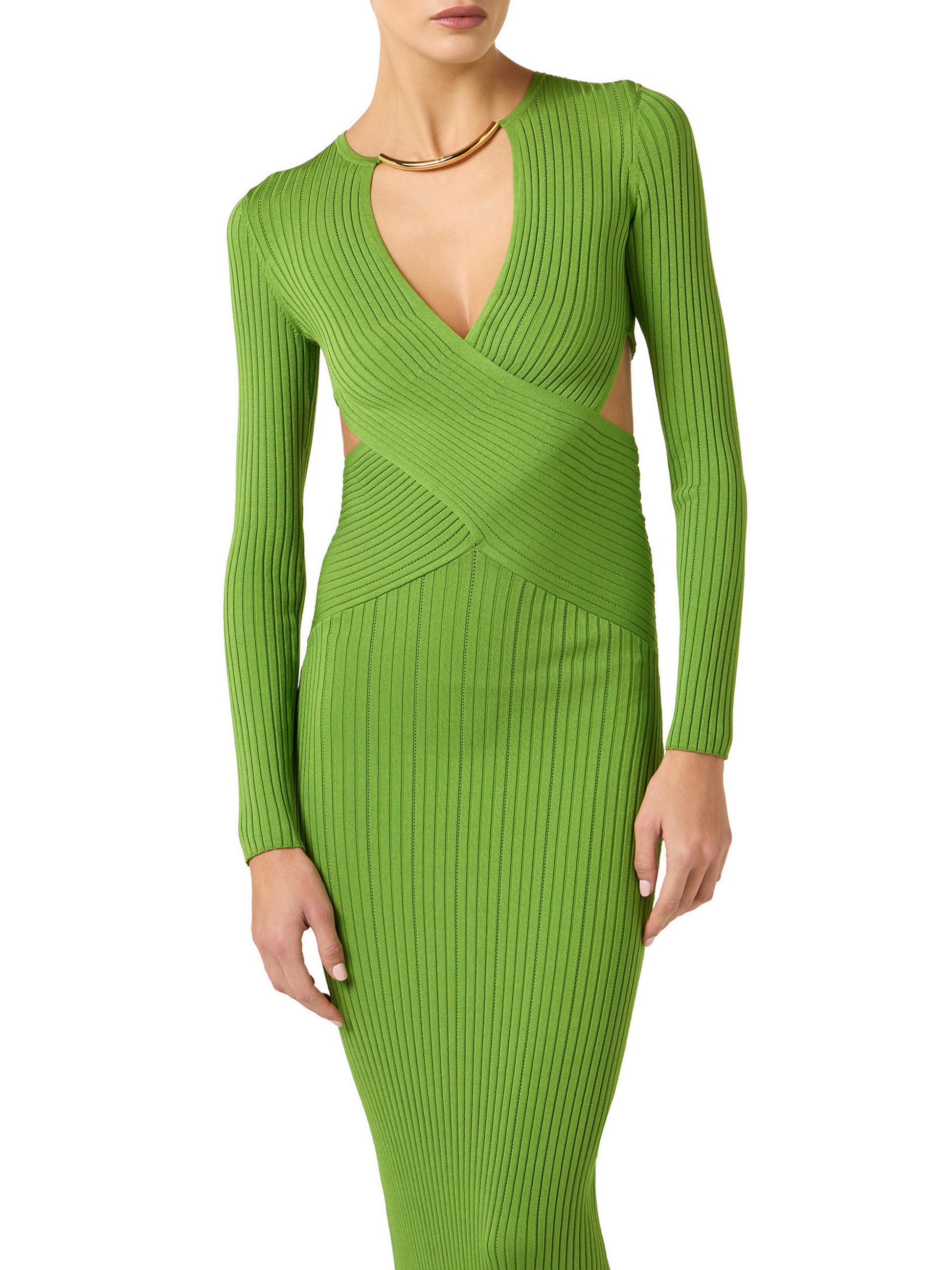 Evening dress in knit fabric with slim fit. The long-sleeved dress is characterised by the neckline held in place by the sparking golden metal tubular necklace. The focal point is the crossover at the bust, which leaves the hips exposed. Focus on the workmanship: the smooth ribbed weave alternates with an openwork pattern, creating a balanced visual rhythm.