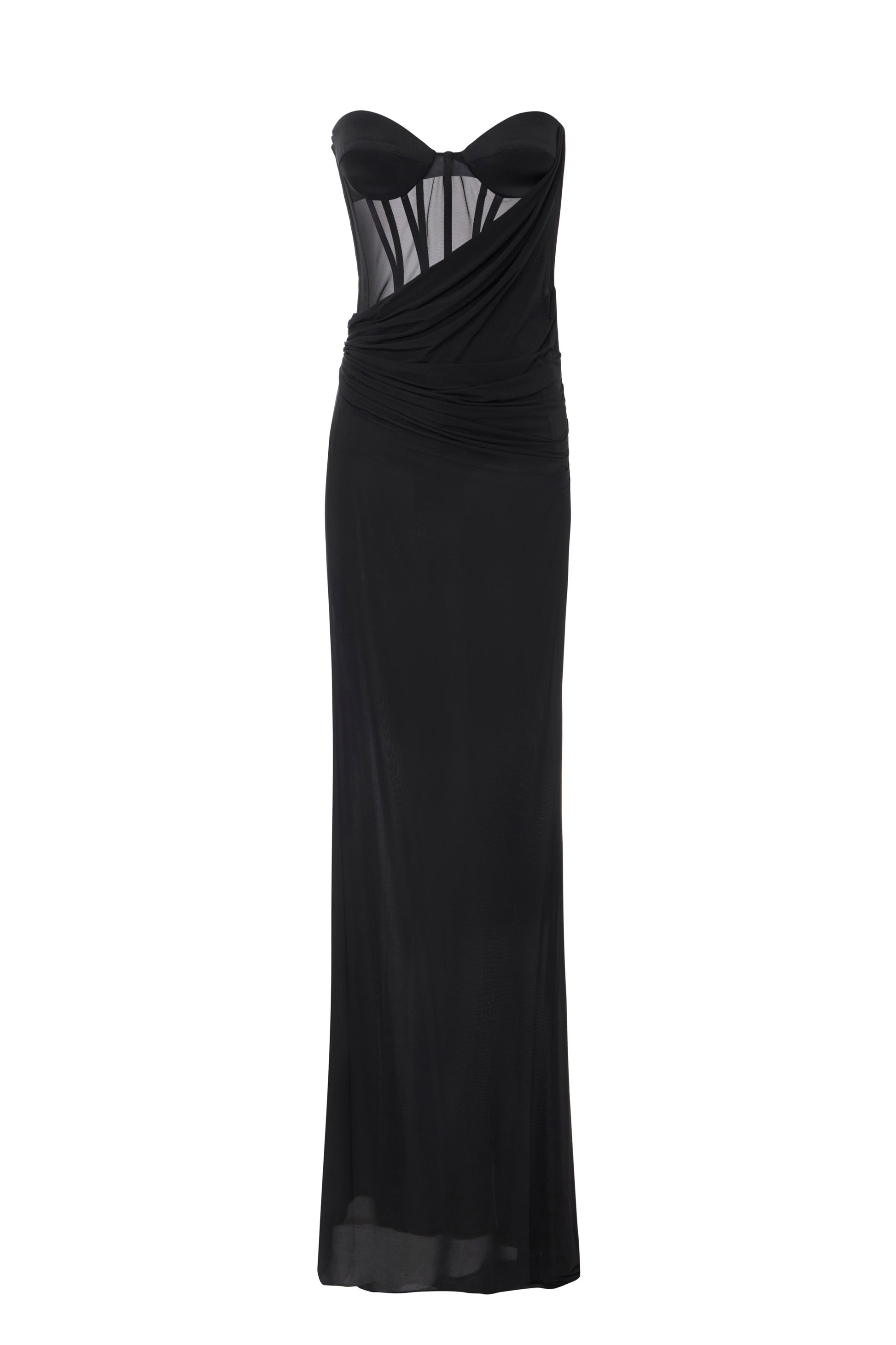 Evening dress in organza and tulle fabric. The dress stands out for the bustier-inspired top that leaves the legs bare and the side draping that extends from the bust to the bottom of the skirt, in a sensual layering play. Slim fit.