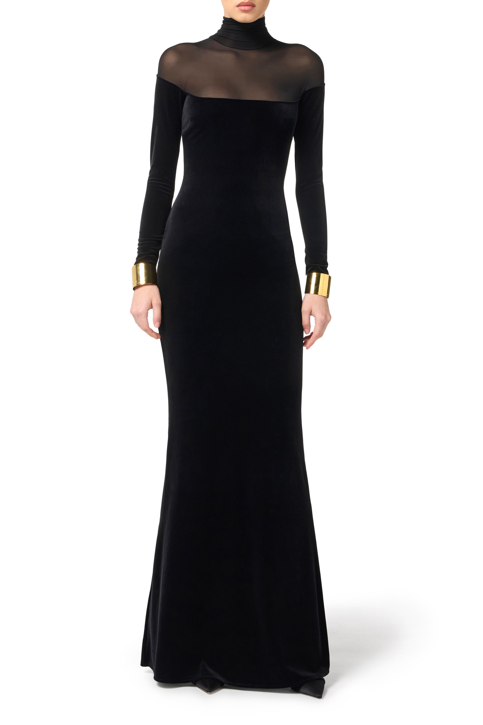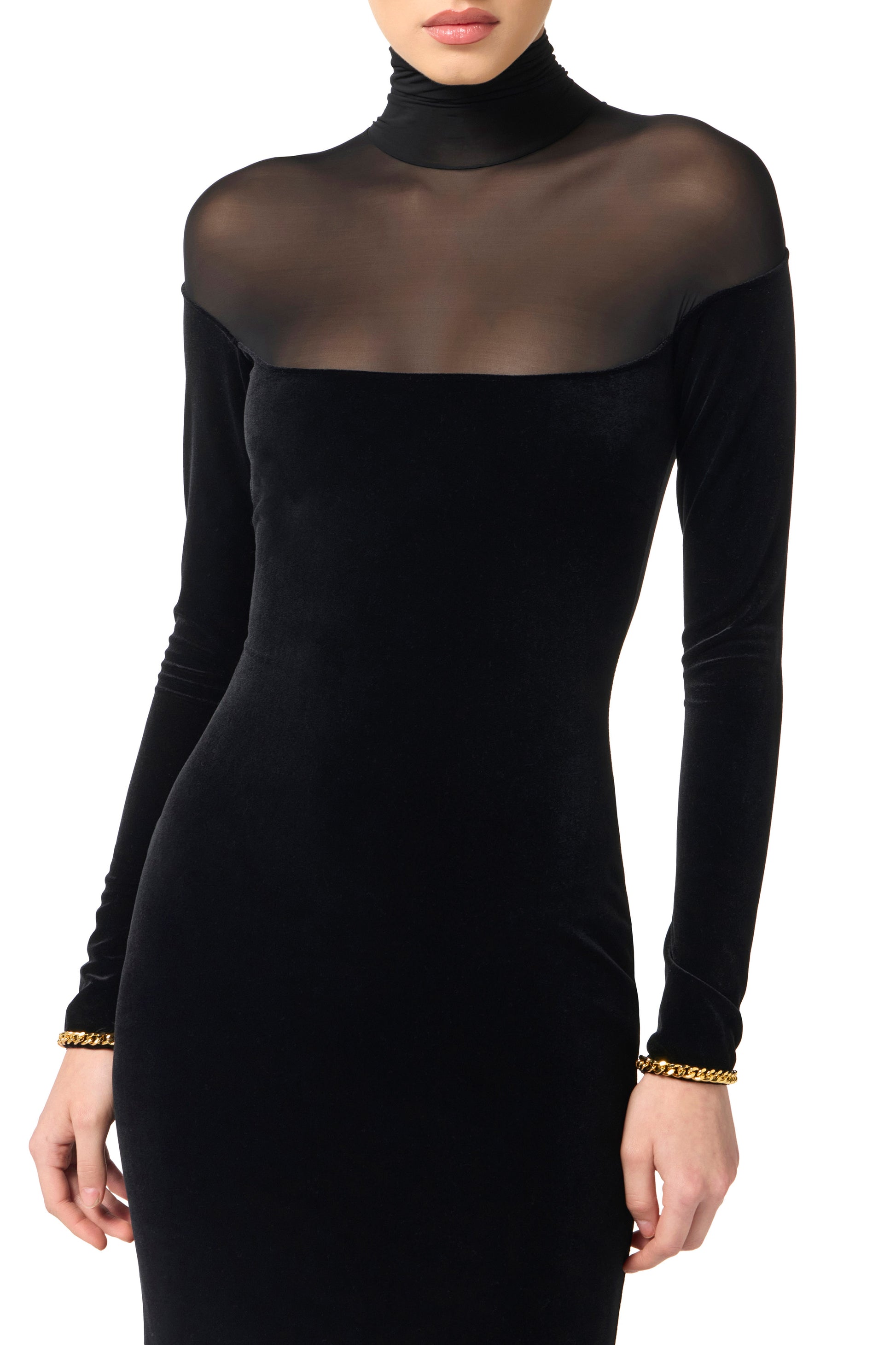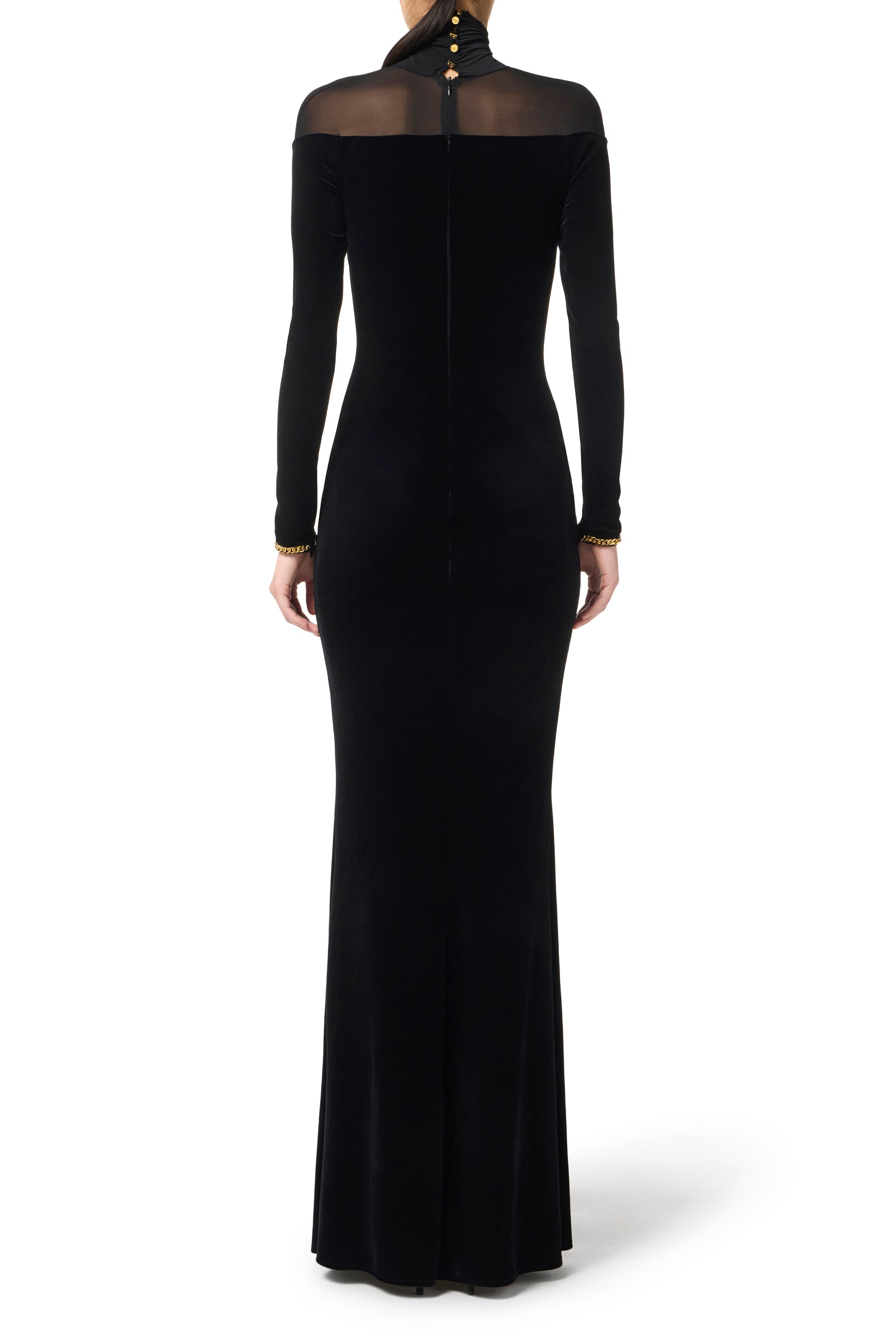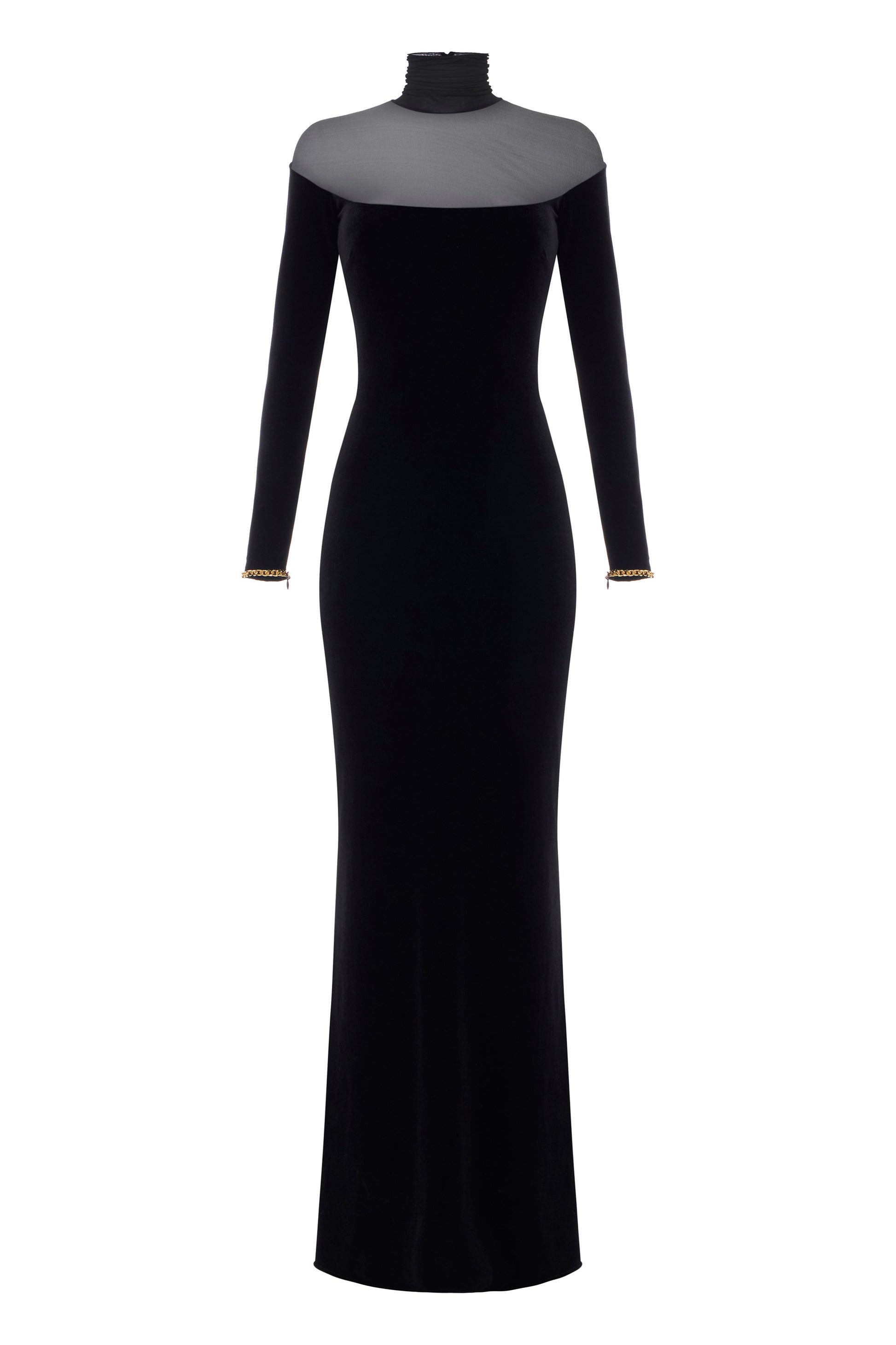 Slim fit velvet evening dress. The dress stands out for its high collar and shoulders made of semi-transparent jersey. It is embellished with jewel chain details that illuminate the cuffs. With a wraparound silhouette, it has a slightly mermaid-like skirt that gives a sensual flow.