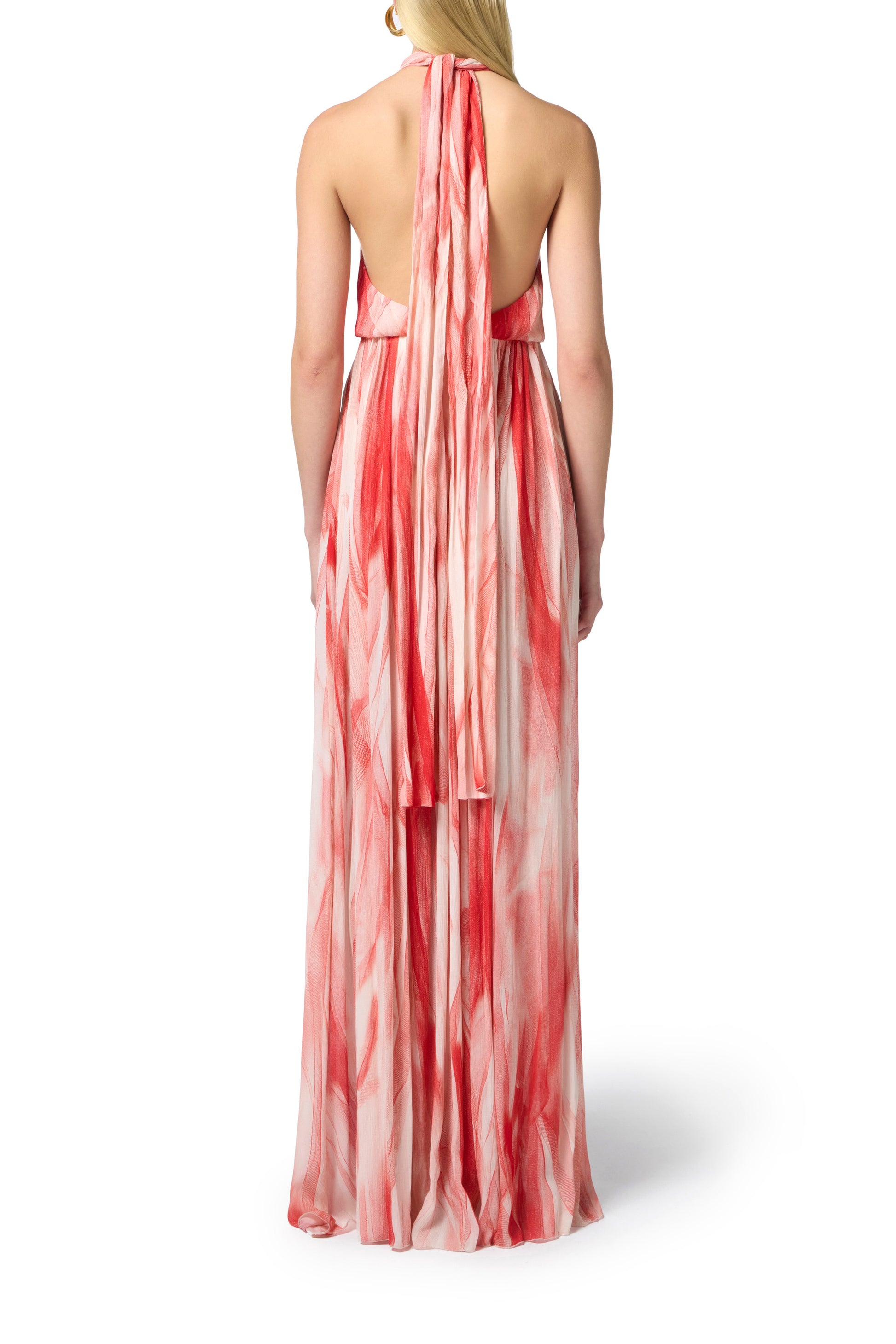 Evening dress in viscose fabric. The dress features bare shoulders with a sash to tie at the neck and stands out for the all-over print that recreates the ethereal effect of overlapping tulle. A final touch of light is provided by the logo on the neckline. Regular fit.