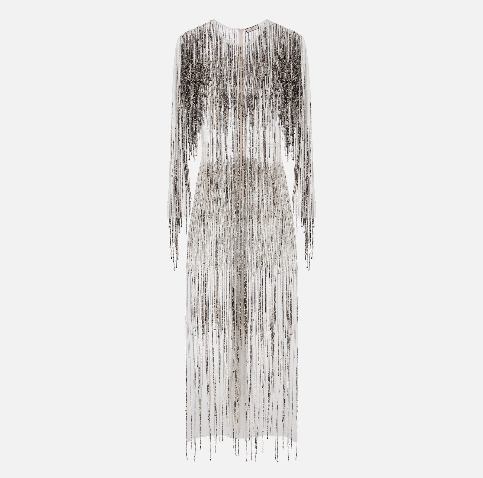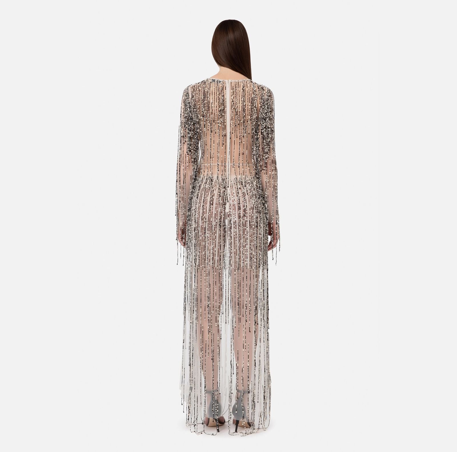 Long tulle dress, entirely covered with hand-embroidered two-tone fringes.