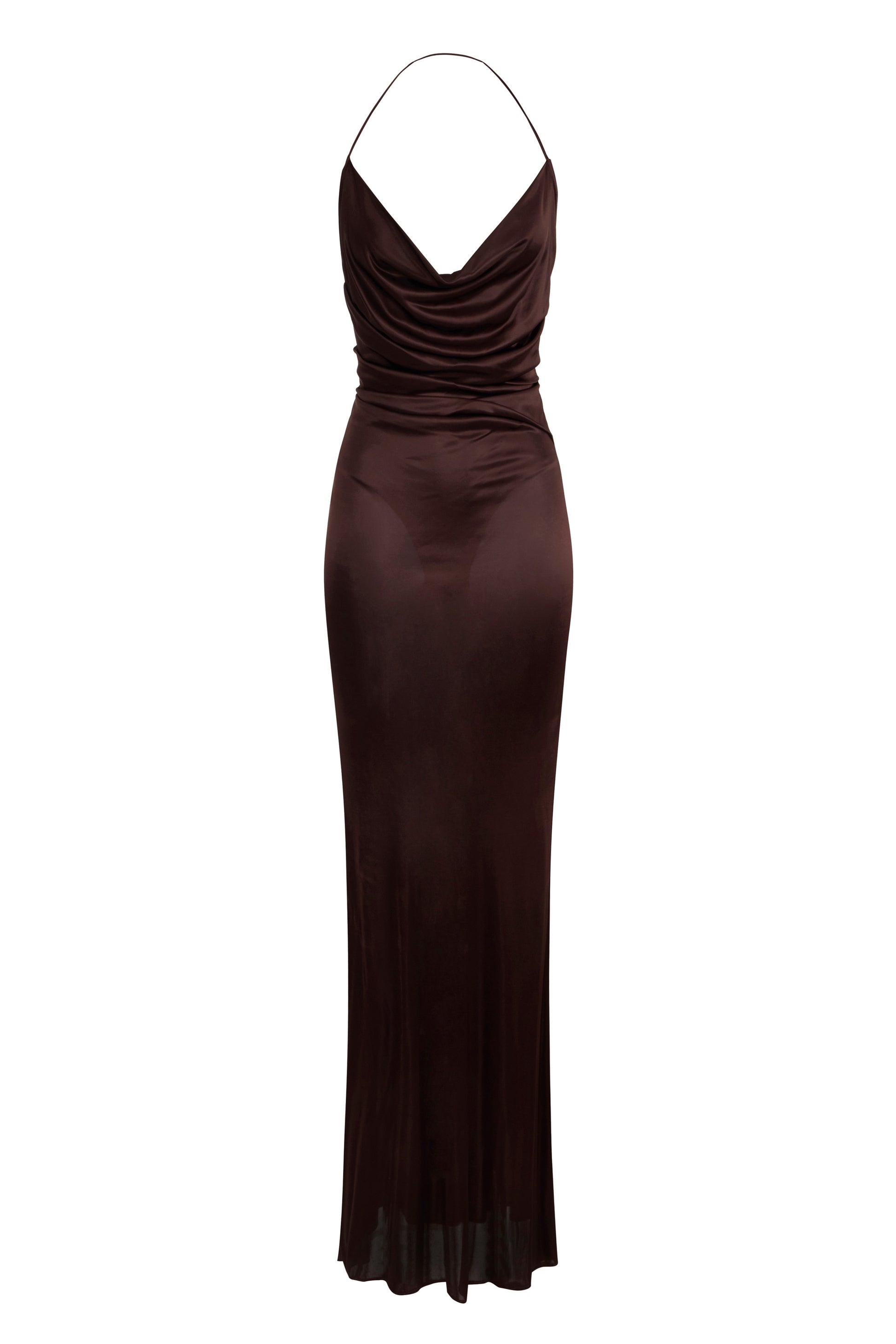 Evening jersey dress. The dress has tubular straps embellished with golden metal logo decorations on the front and back, creating a low neckline highlighting the back.
