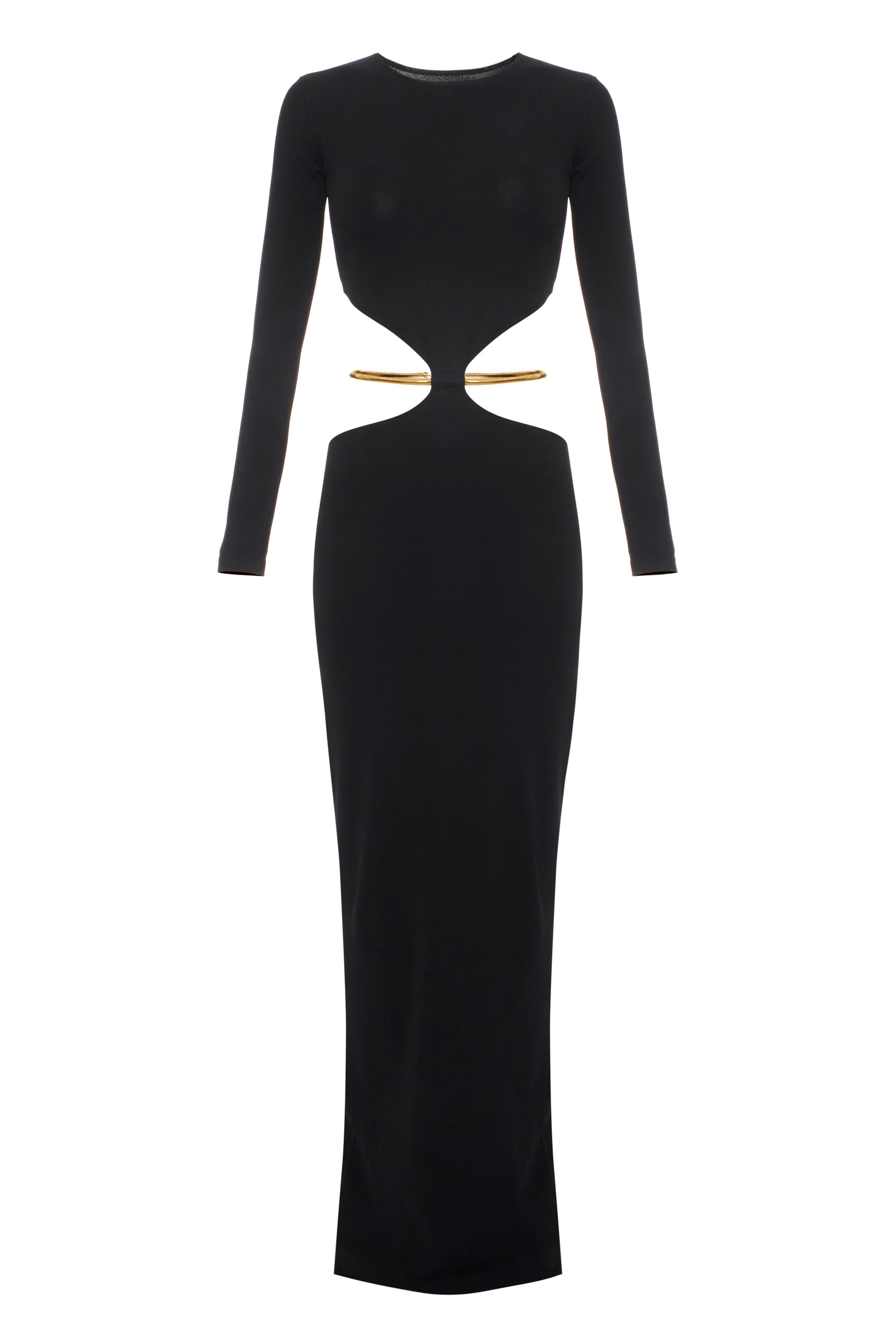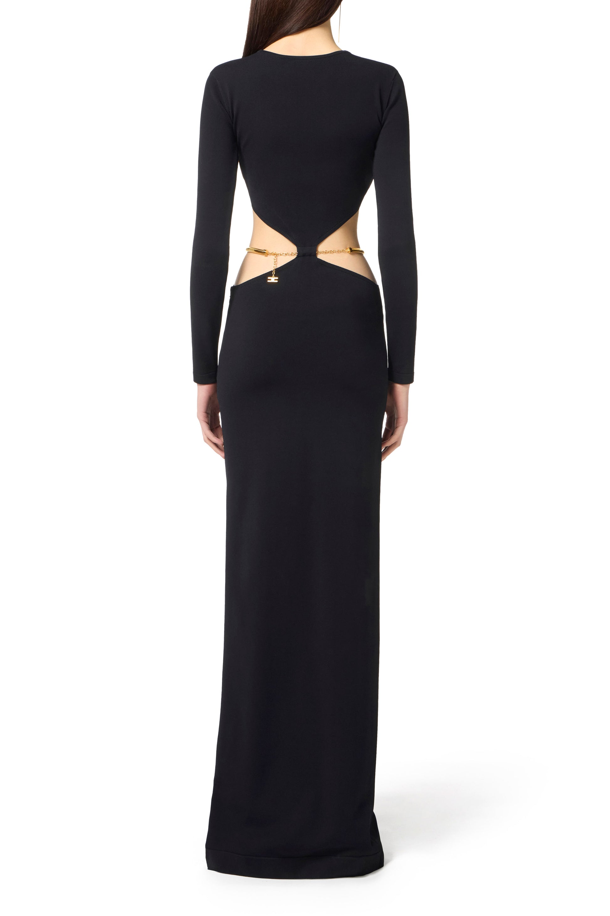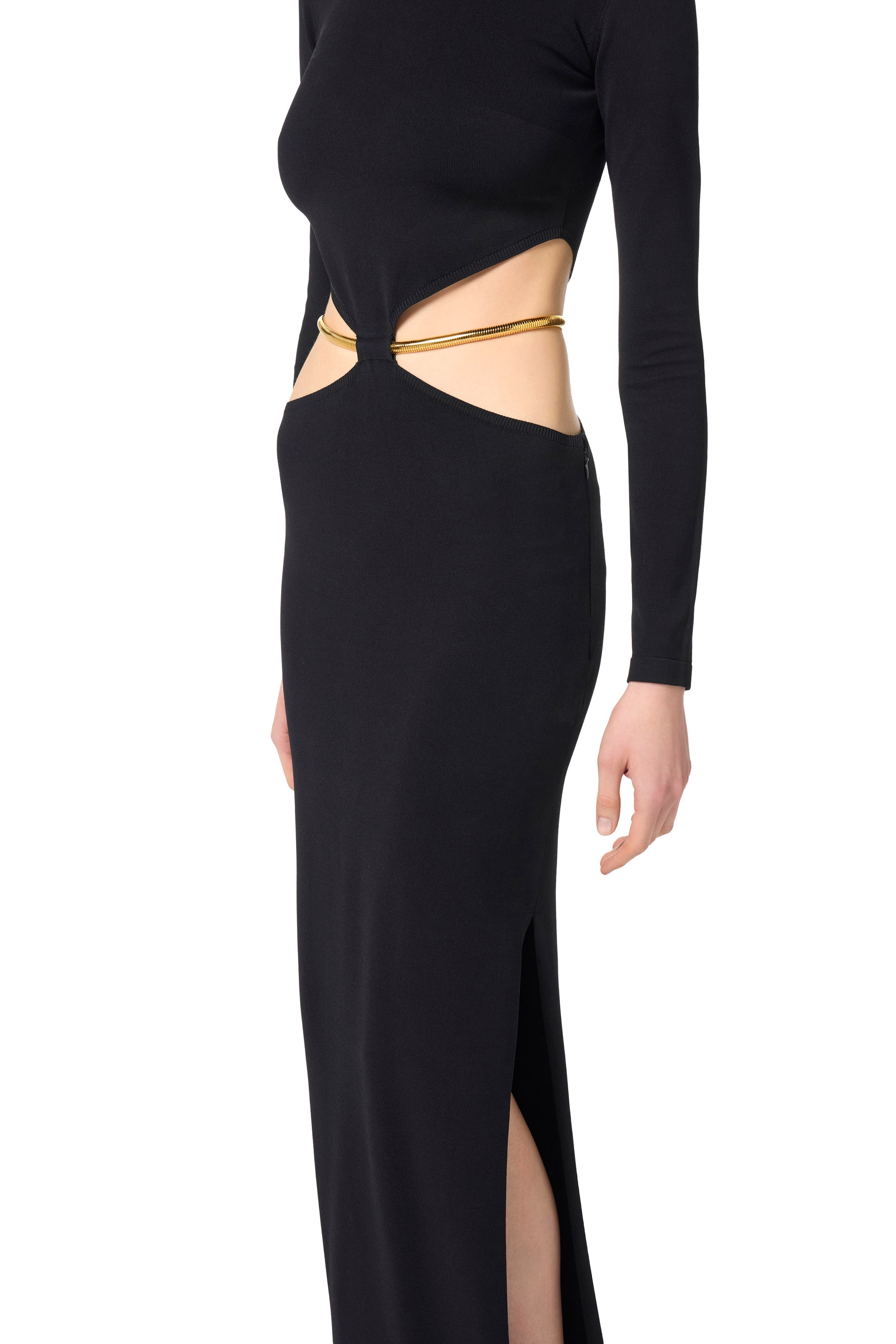 Evening dress in knit fabric with slim fit. The dress has a crew neck, long sleeves and is characterised by cut-outs at the waist that reveal the hips, embellished by the removable and flexible snake patterned belt for more styling options.