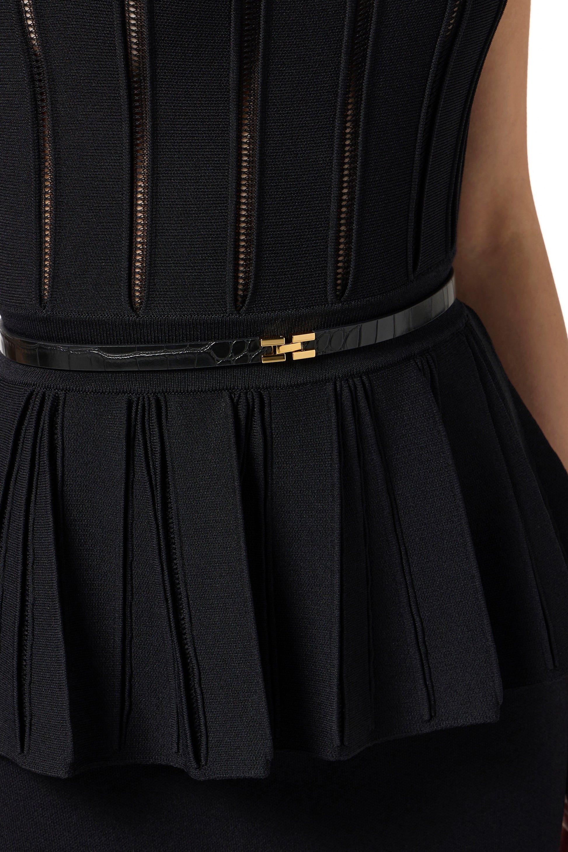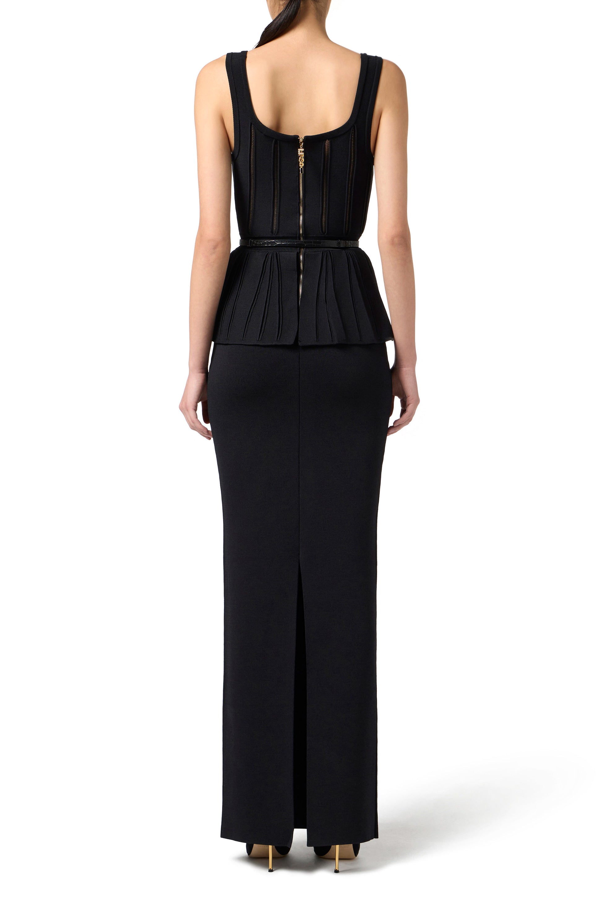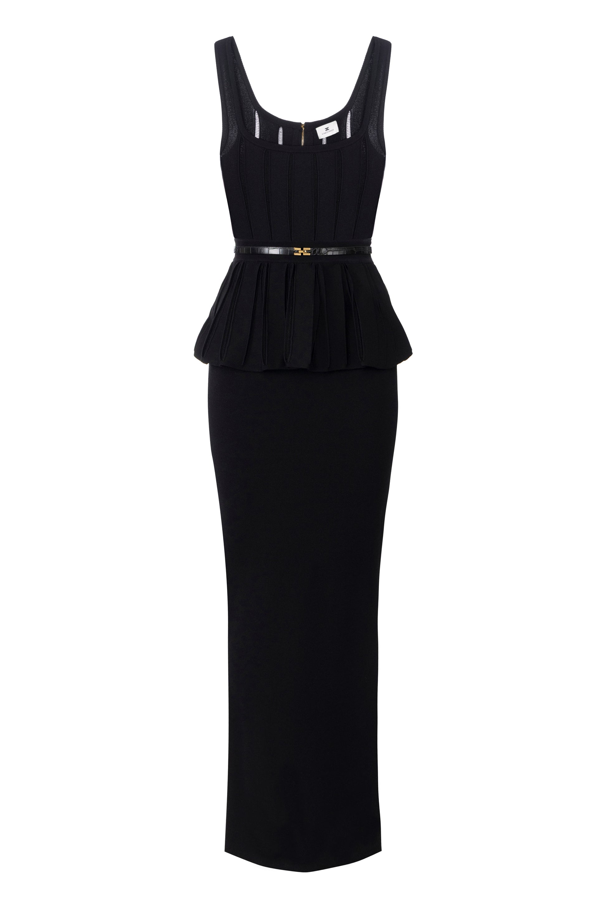 Evening dress in knit viscose fabric. The sleeveless dress has a square neckline and straight knitted pencil skirt. It stands out for its openwork embroideries that open harmoniously into a peplum, giving delicate bustier inspirations. The waistline is emphasised by the belt with logo detail.