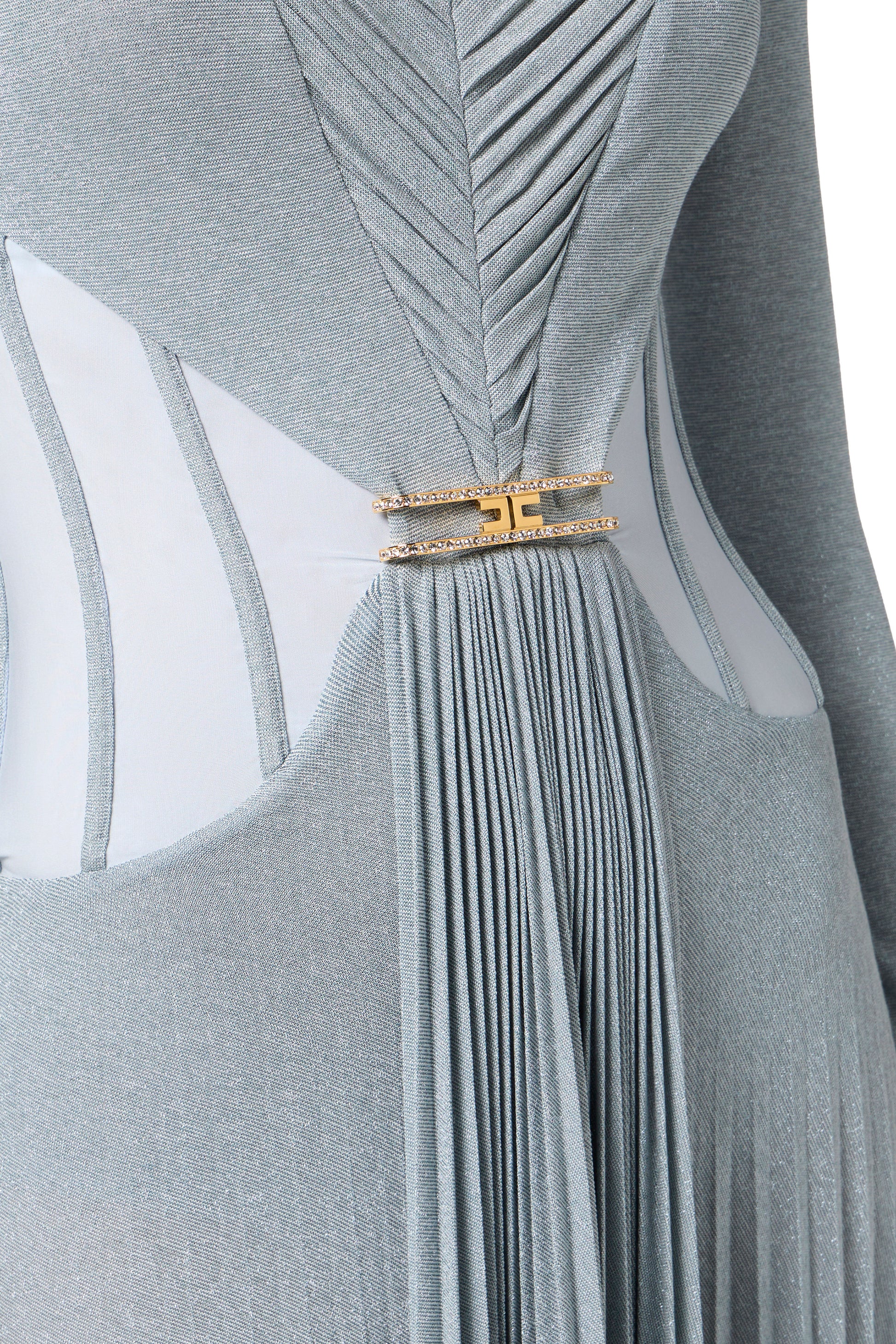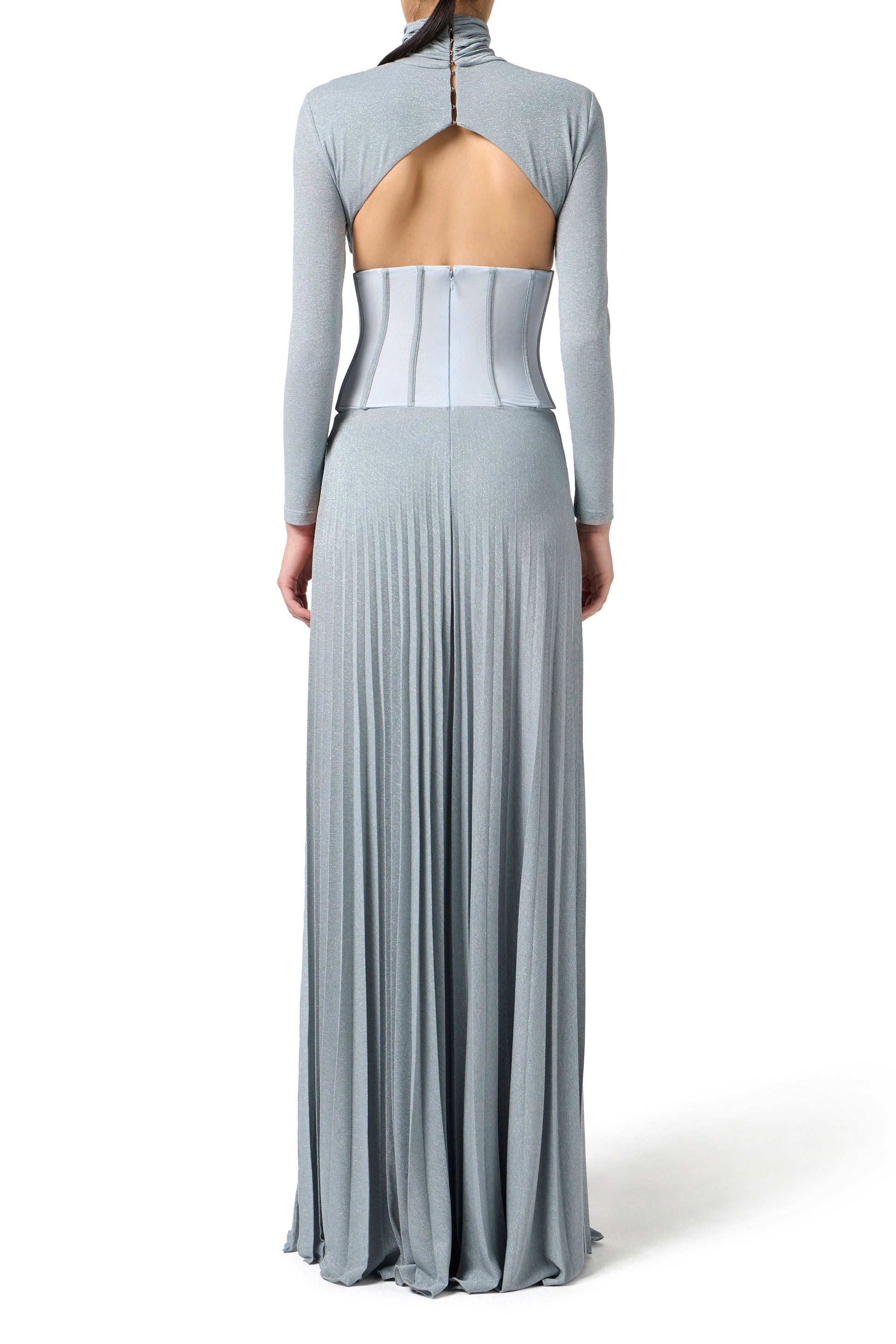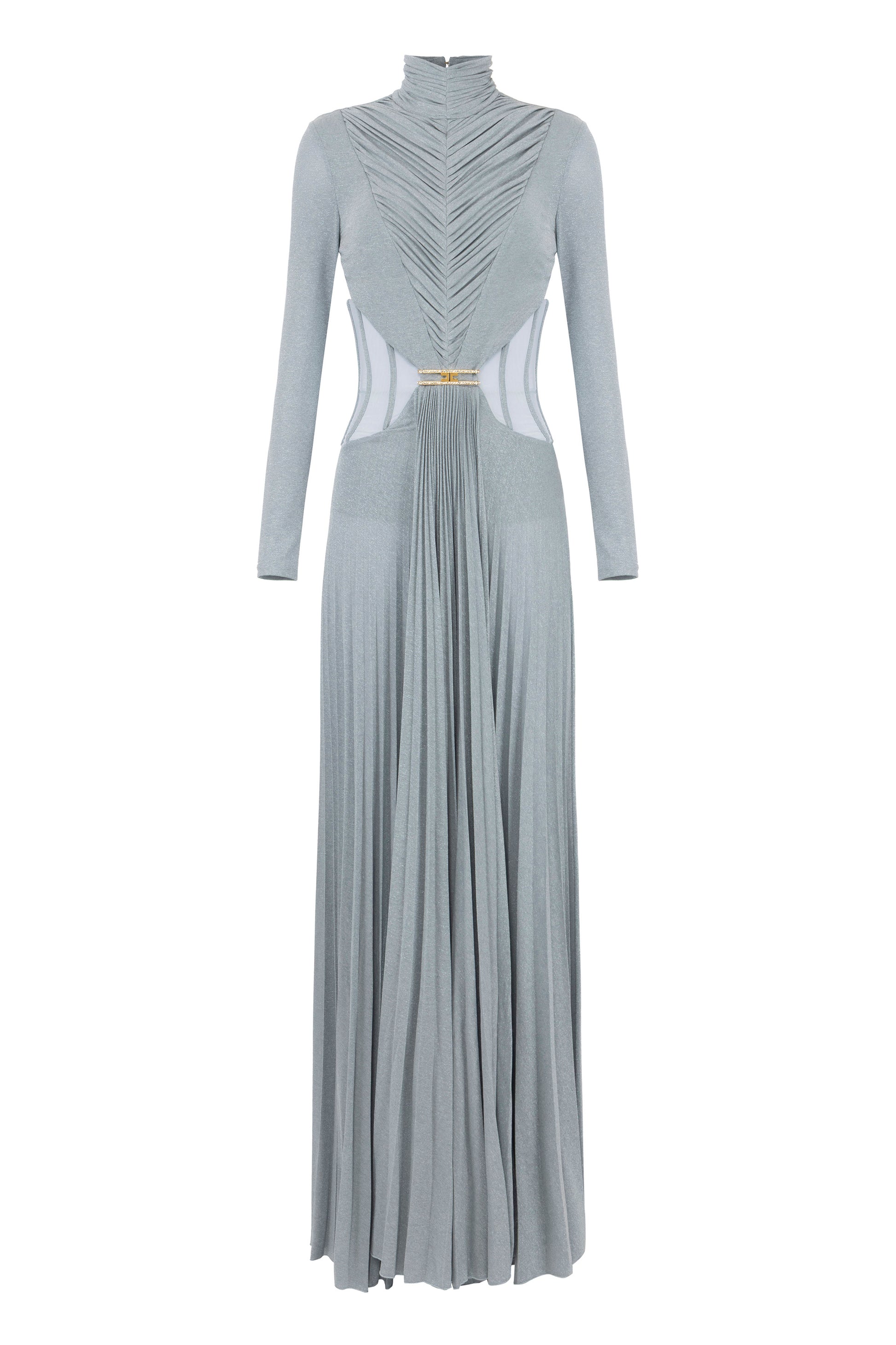 Evening dress in lurex jersey fabric with slim fit. The dress is characterised by elaborate draping held in place with a jewel accessory that designs the figure with herringbone patterns on the bust and finishes like a tail on the skirt. The hips reveal a matching inner corset. Skirt with sunray pleating and slit.