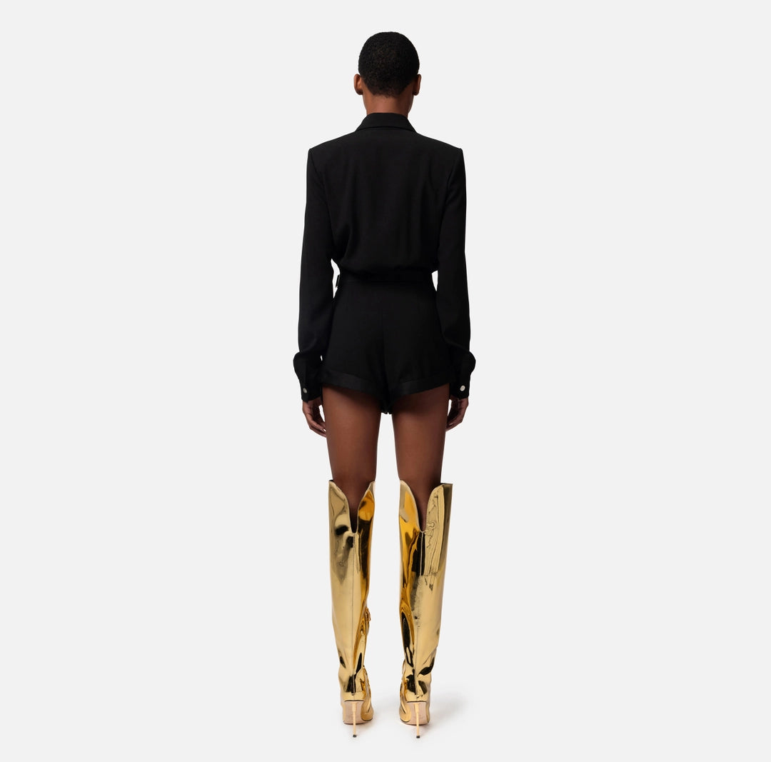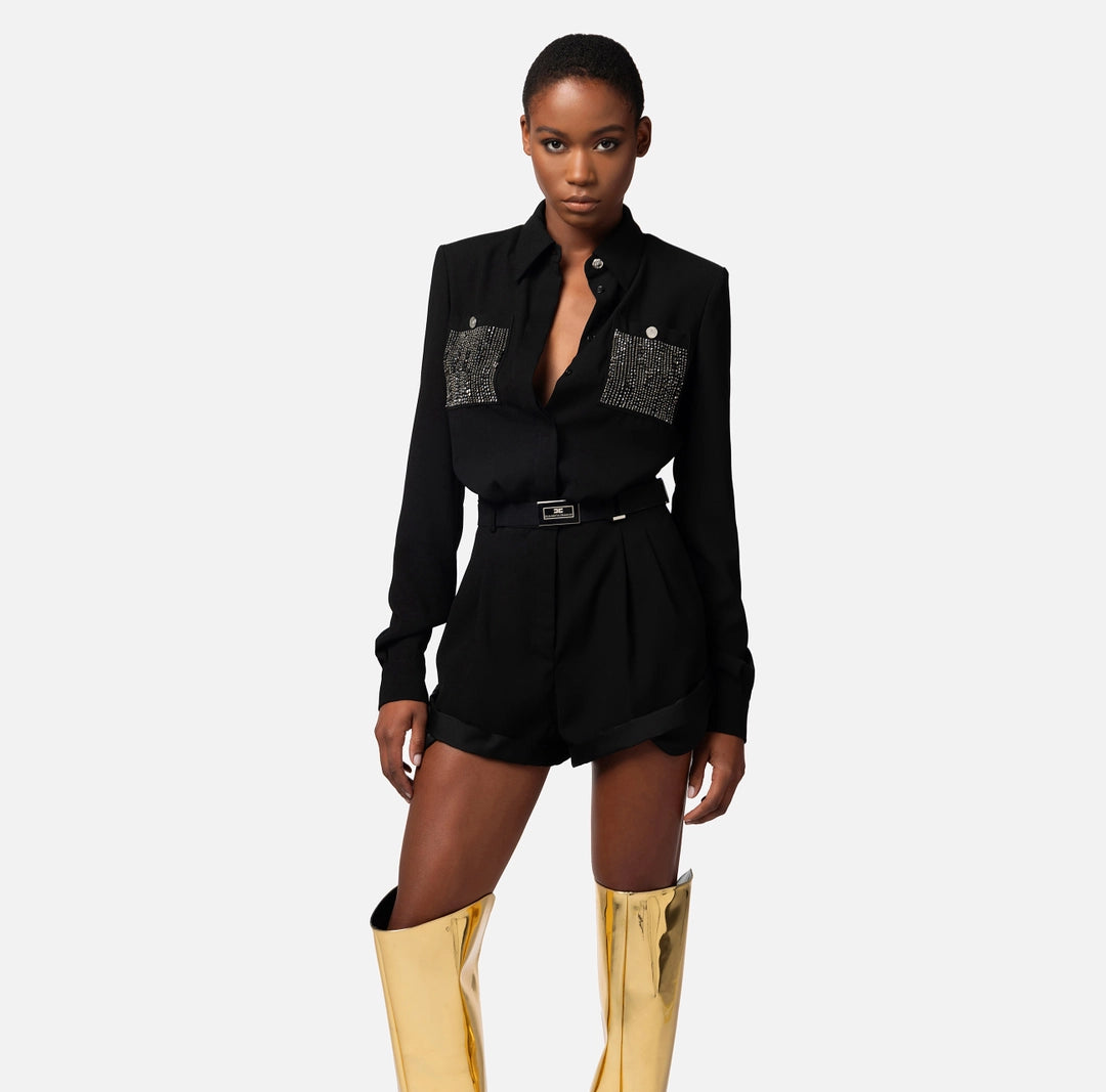 Romper suit in crêpe fabric with a shirt-style design and chest pockets embroidered with bugle beads. The waistline is emphasised by an elasticated belt with golden metal logo buckle over the shorts.