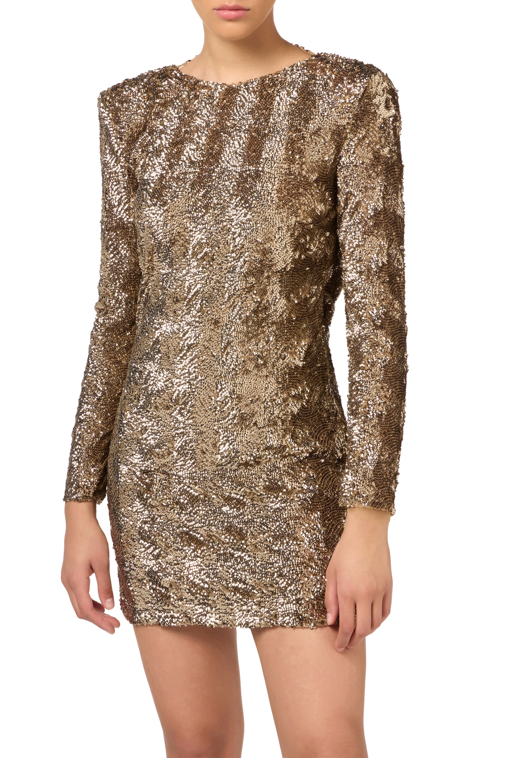 Boxy mini-dress made of tulle entirely hand-embroidered with concave sequins with chevron pattern. It features a keyhole neckline on the back, long sleeves and structured shoulders.