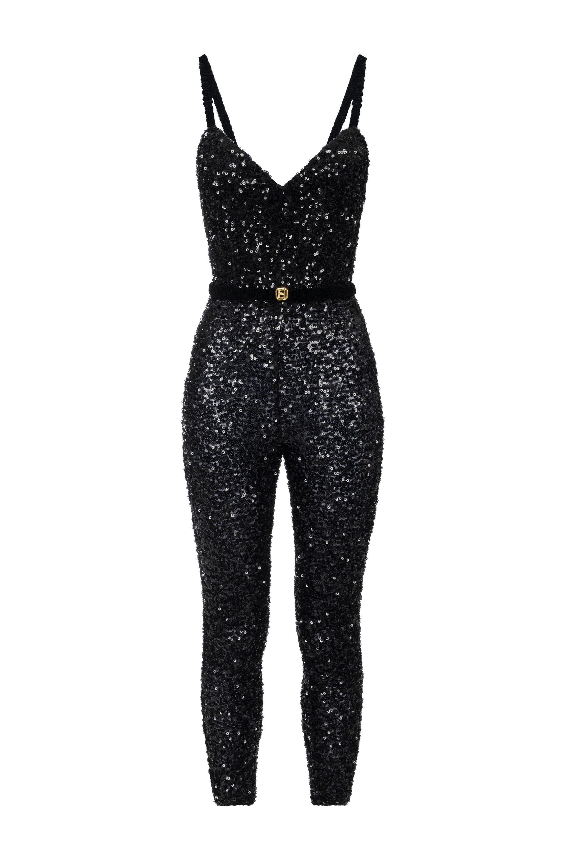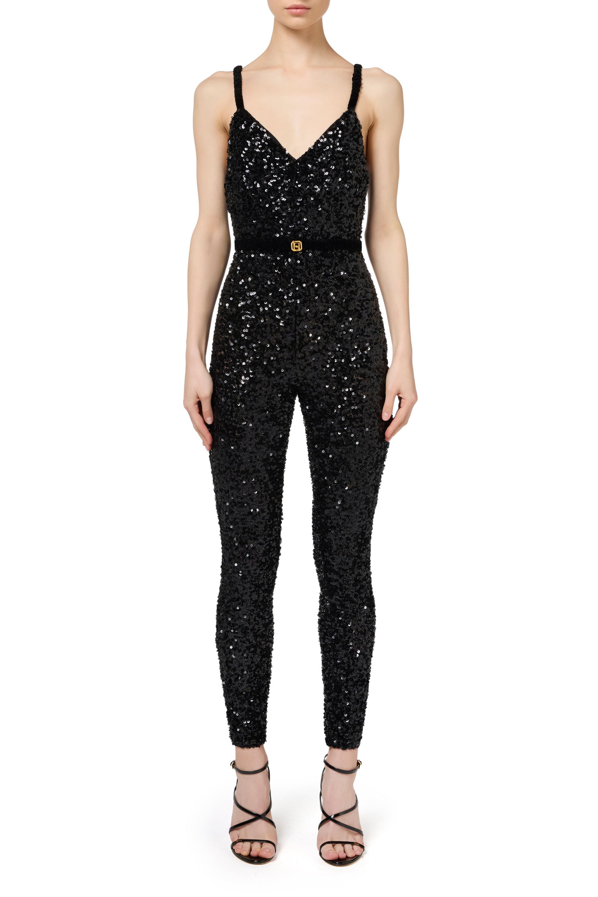 Sequin jumpsuit consisting of top with sweetheart neckline, gathered velvet straps and skinny trousers. The waist is emphasised by an elastic belt with golden metal logo plaque.