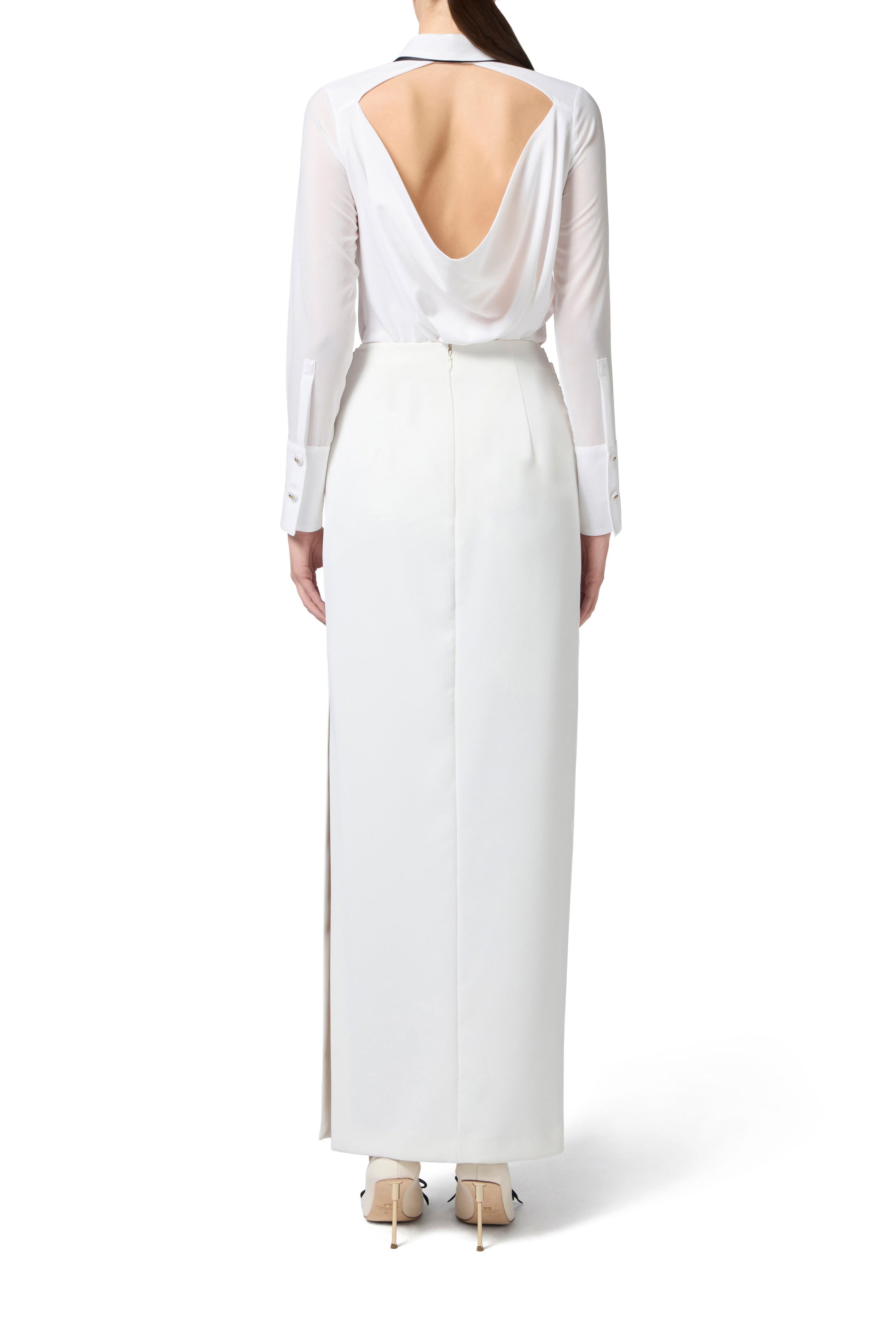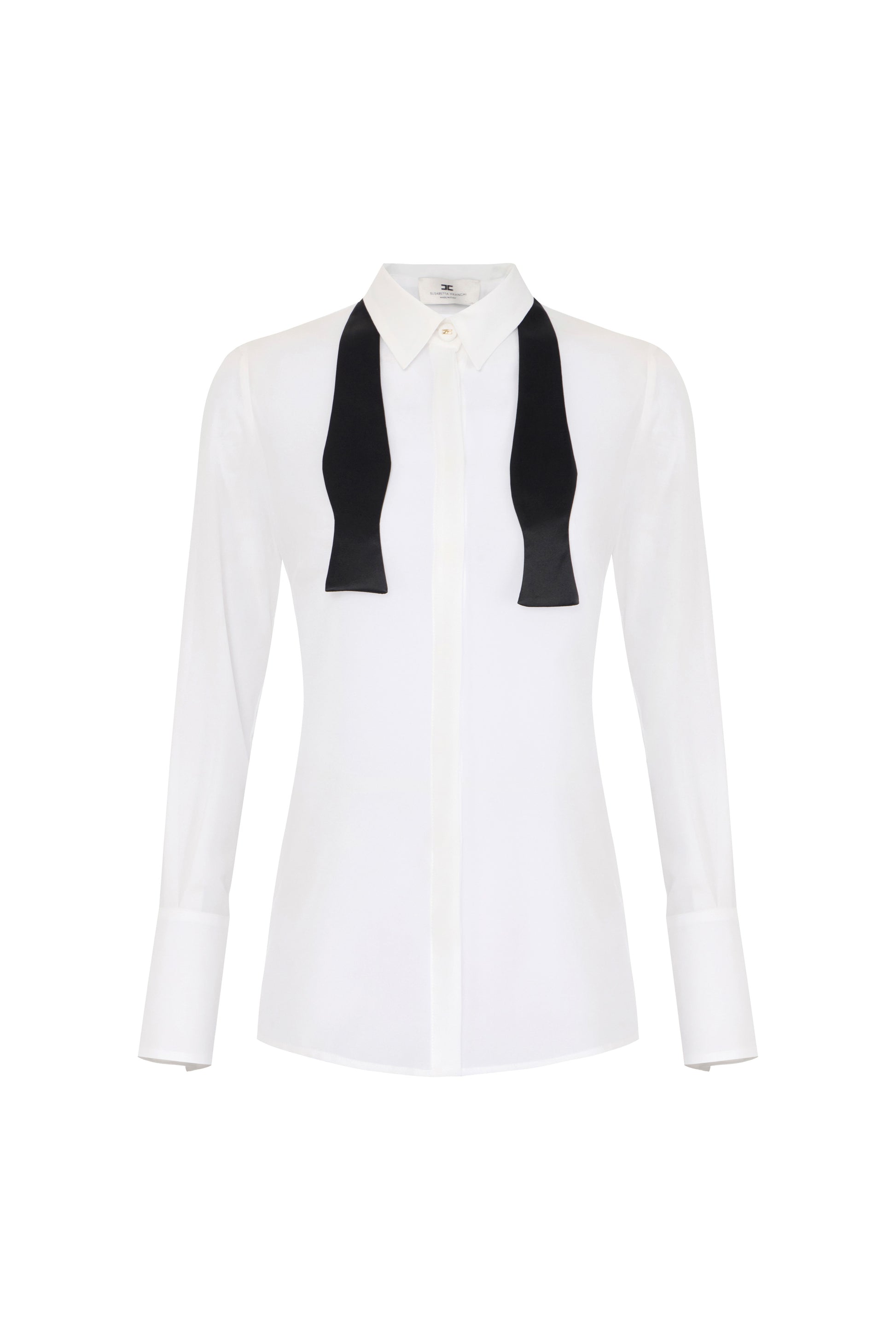 Shirt in georgette fabric with long sleeves and regular collar. The back reveals an opening that leaves part of it bare. The stylish detail is the tuxedo bow-tie that creates a balanced graphic contrast. Buttons with logo complete the garment. Slim fit.