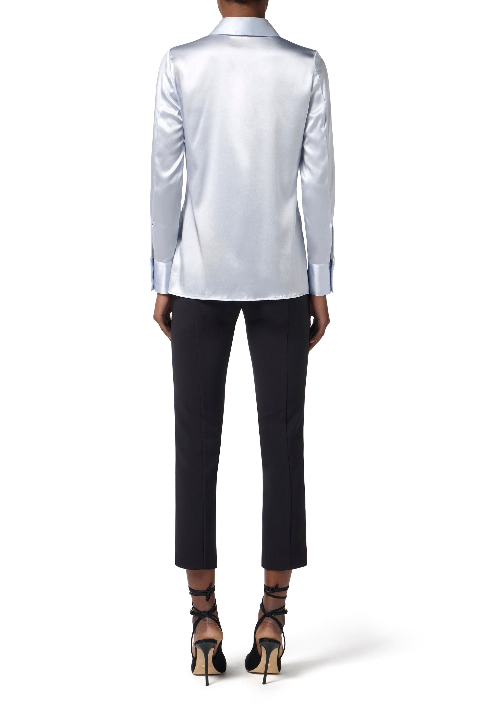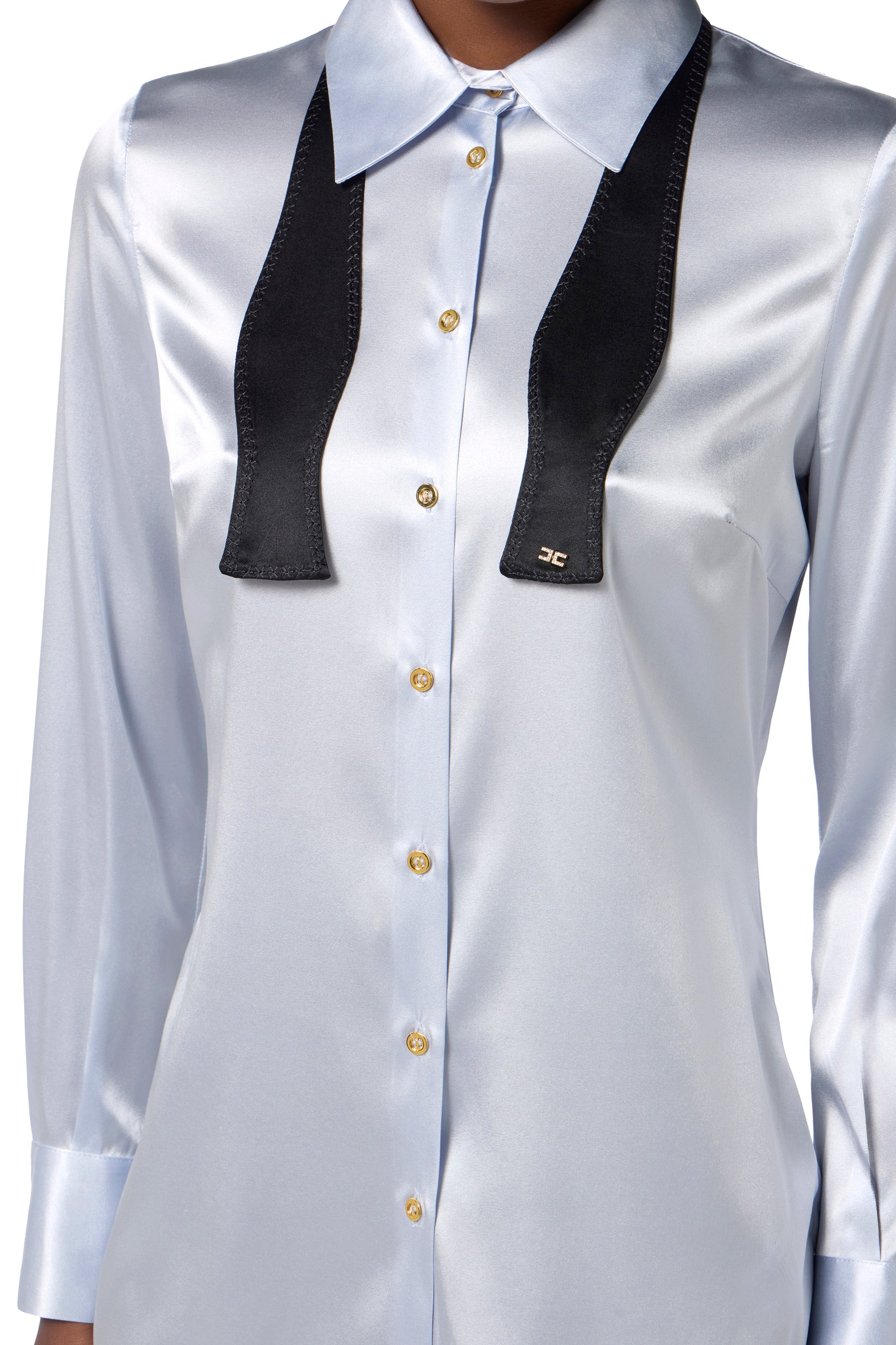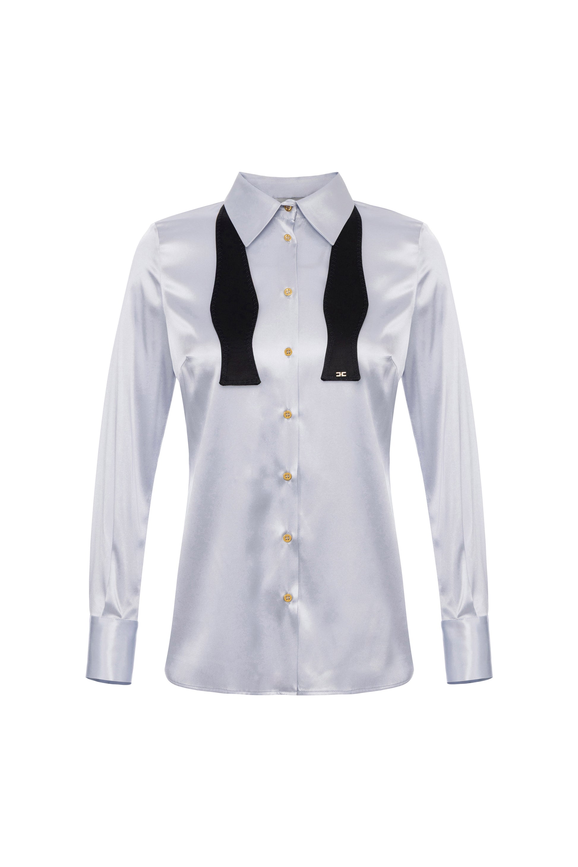 Silk satin blouse with slim fit. The collar is enriched by the open bow tie with zigzag stitching and embellished with a jewel detail with a rhinestone logo.