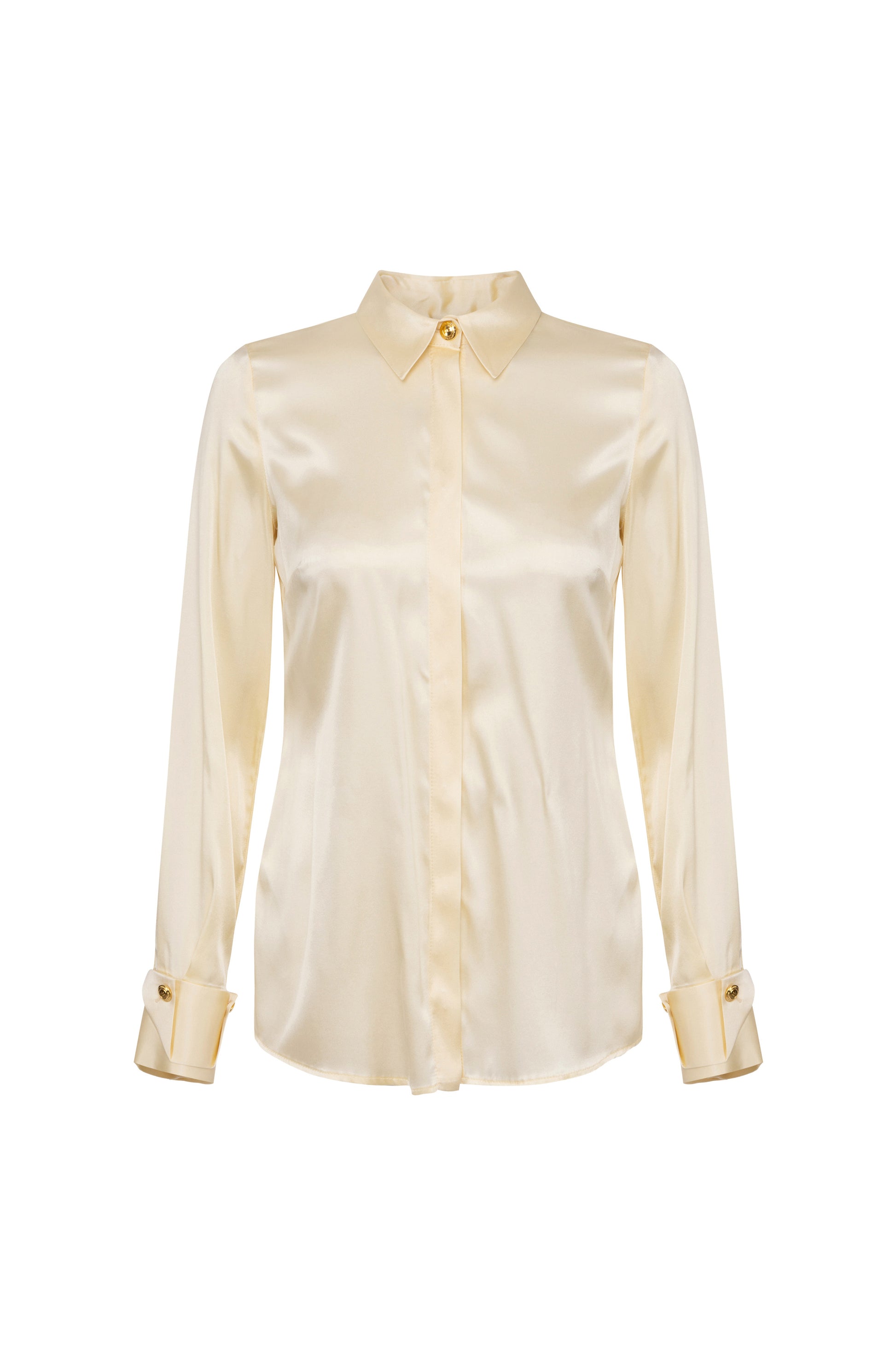 Silk satin blouse with loose fit. The garment has a collar and long sleeves with double cuffs embellished with golden metal logo buttons.