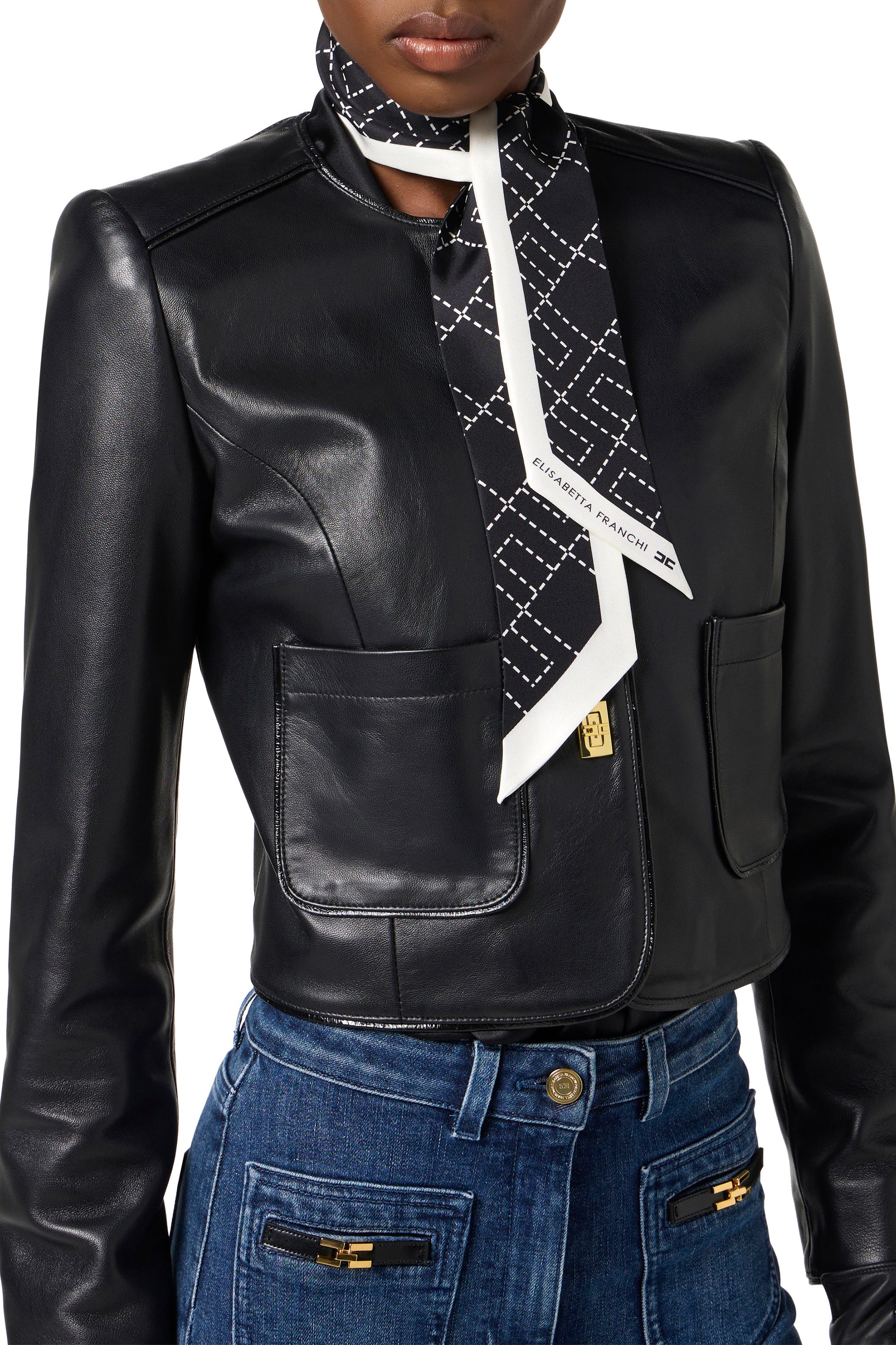 Long and thin silk twill foulard scarf. The all-over print recreates a sophisticated logo pattern, the contrasting solid-colour band lends definition.