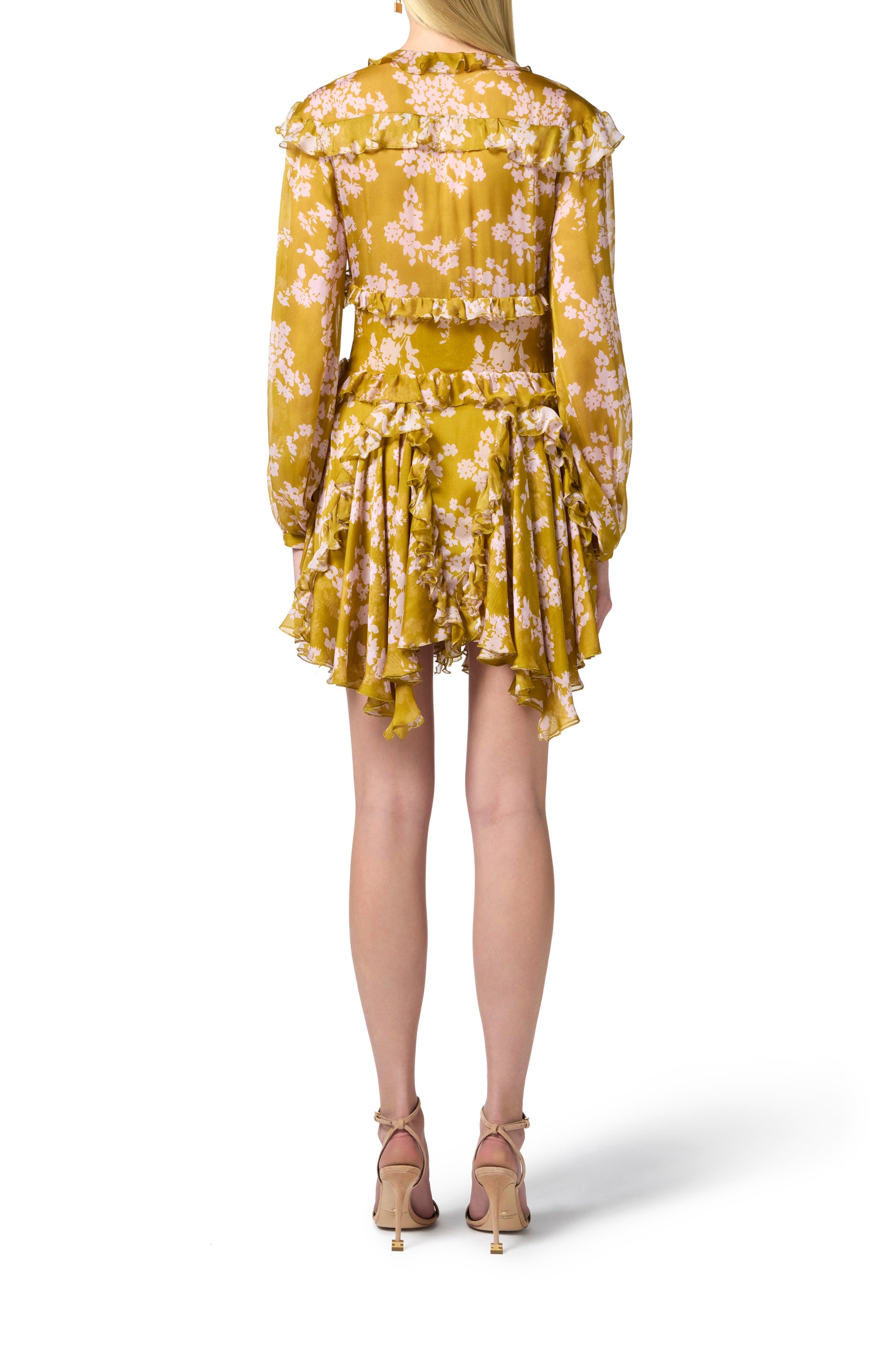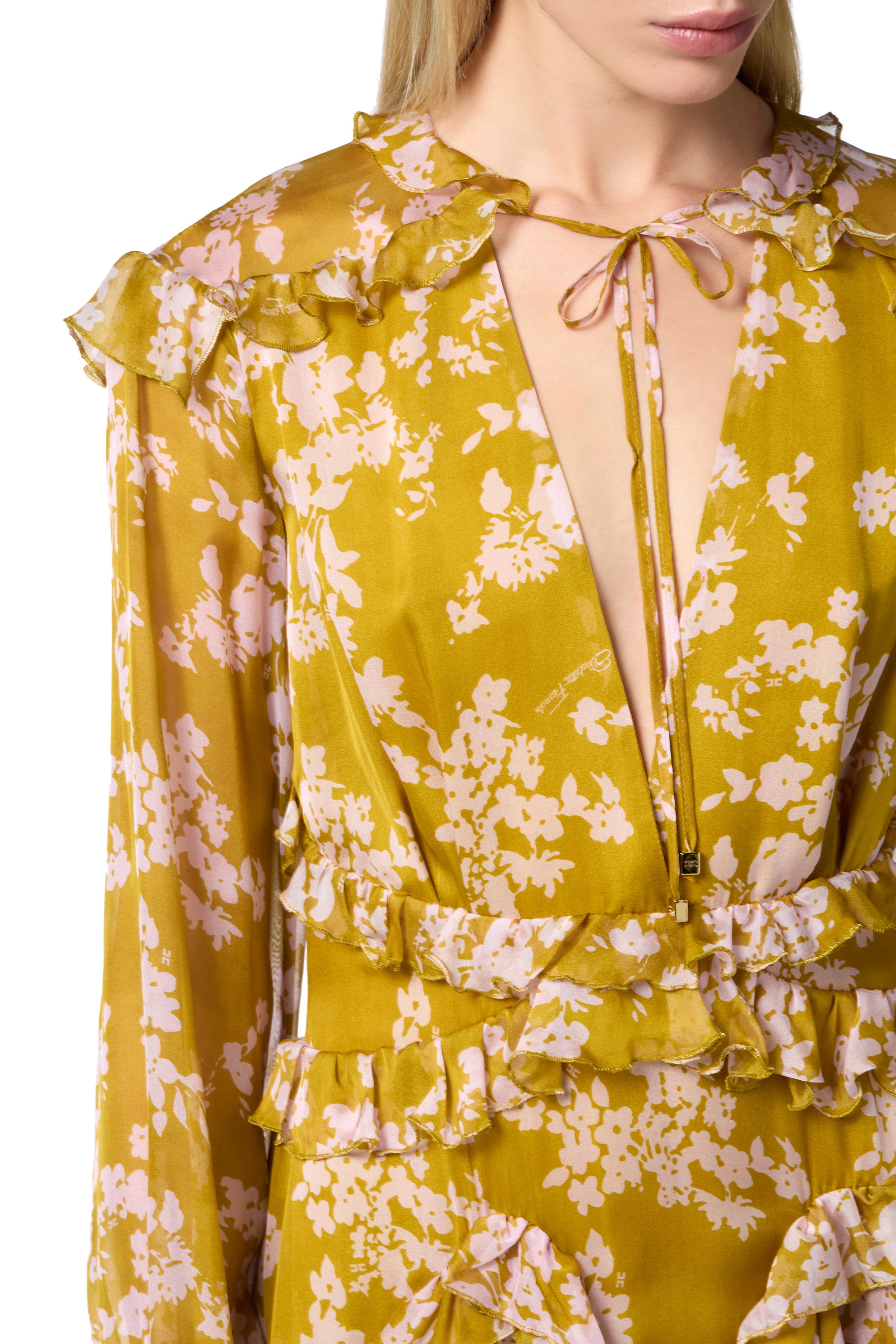 Silk voile printed dress with ruffles