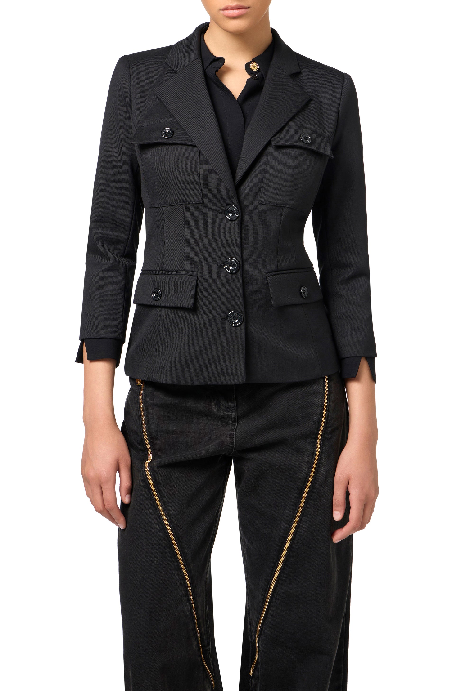 Cool wool jacket with single-breasted fastening and 3/4 sleeves. It features double patch and flap pockets with horn-effect logoed buttons.