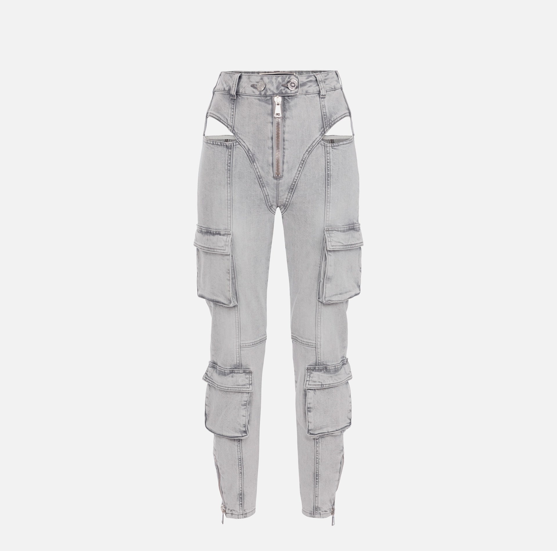 Regular waist stretch cotton skinny jeans with pockets. They feature a cut-out pattern at the waist and zip at the bottom.