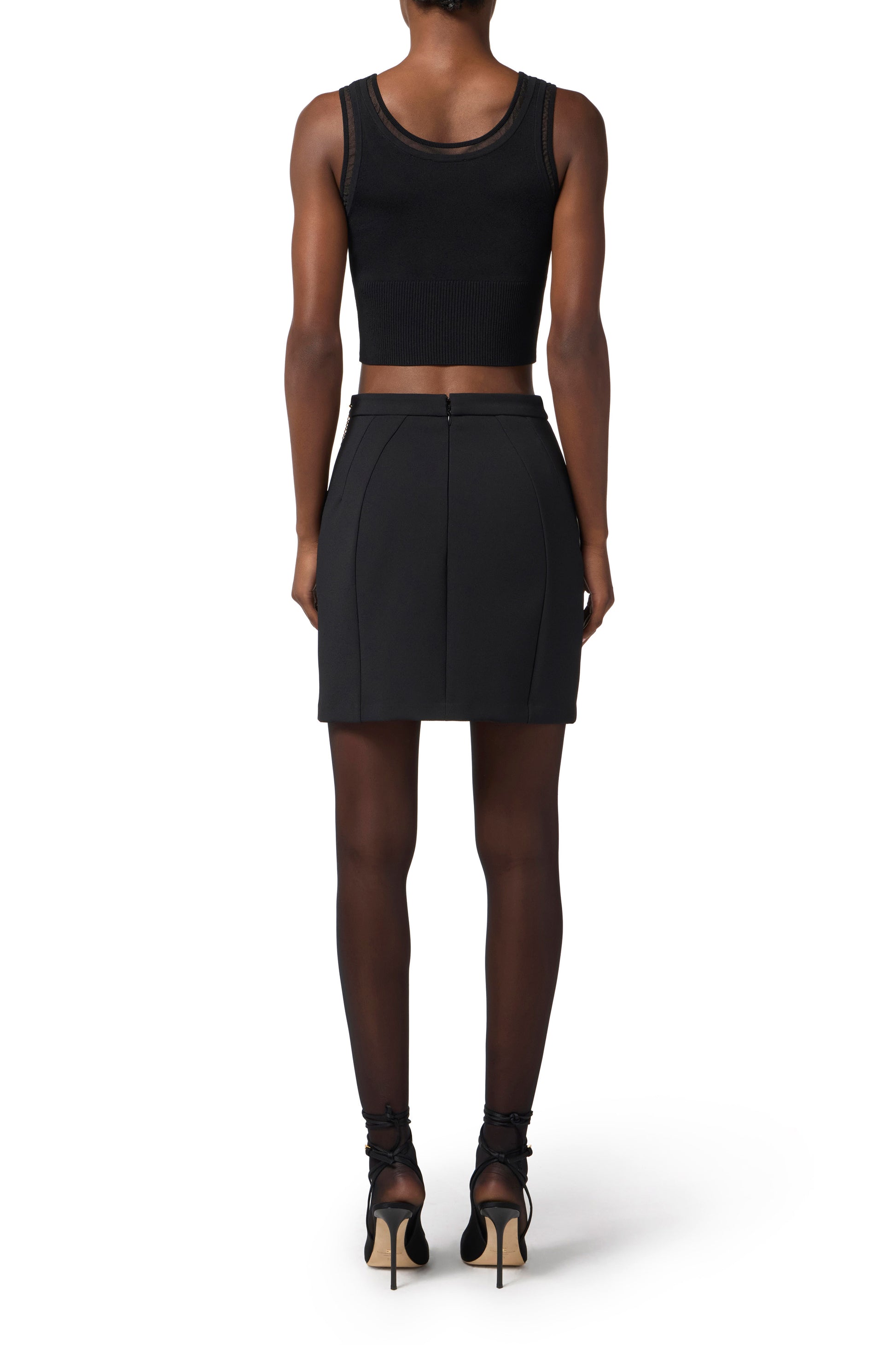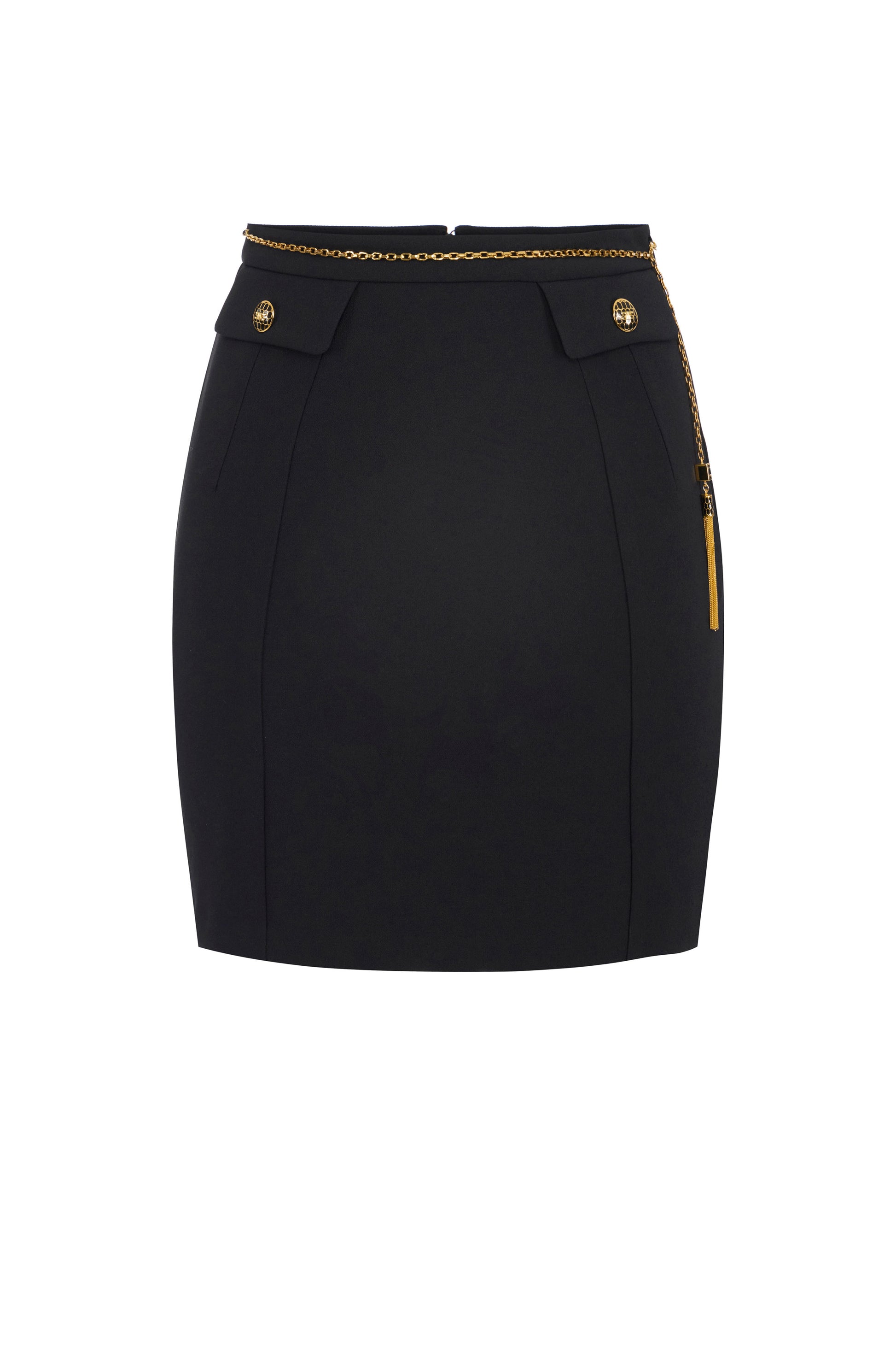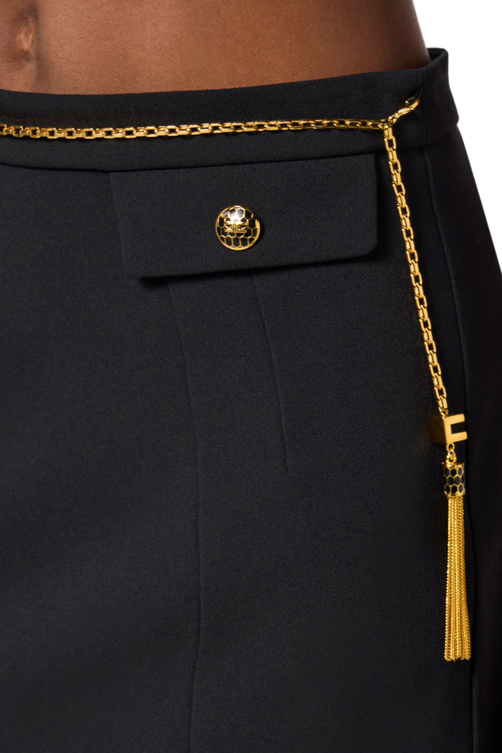 Slim fit skirt in double-layer crêpe fabric. It features precious details such as the chain belt with tassel made of golden metal. The flaps are decorated with enamelled logo buttons and snake-inspired patterns.