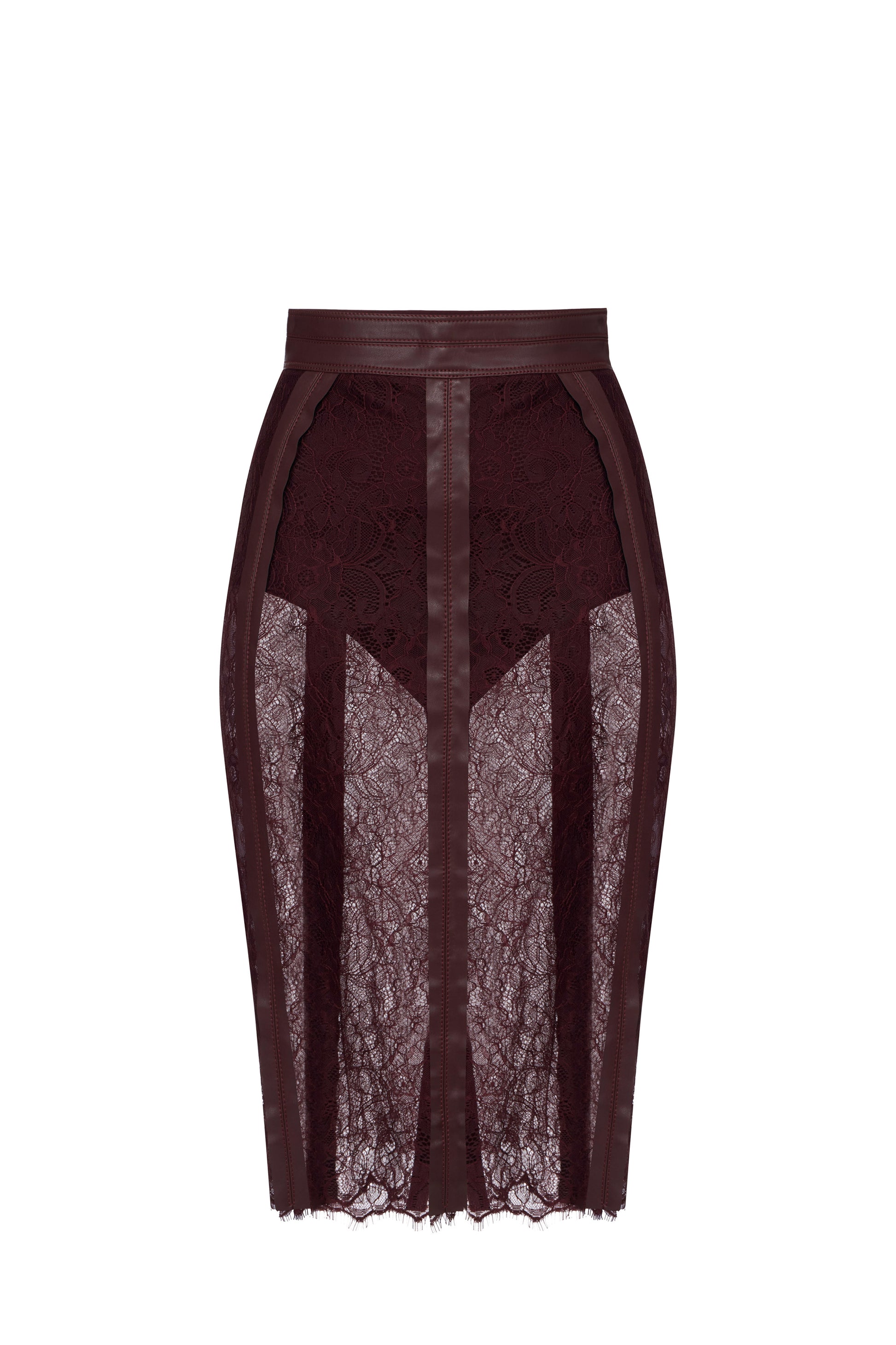 Midi skirt with a slim fit. It is characterised by rich floral lace texture, defined by raised inserts such as vertical ribbons that give structure to the garment and create contrasting textures. The label with logo on the back of the waist completes this garment.