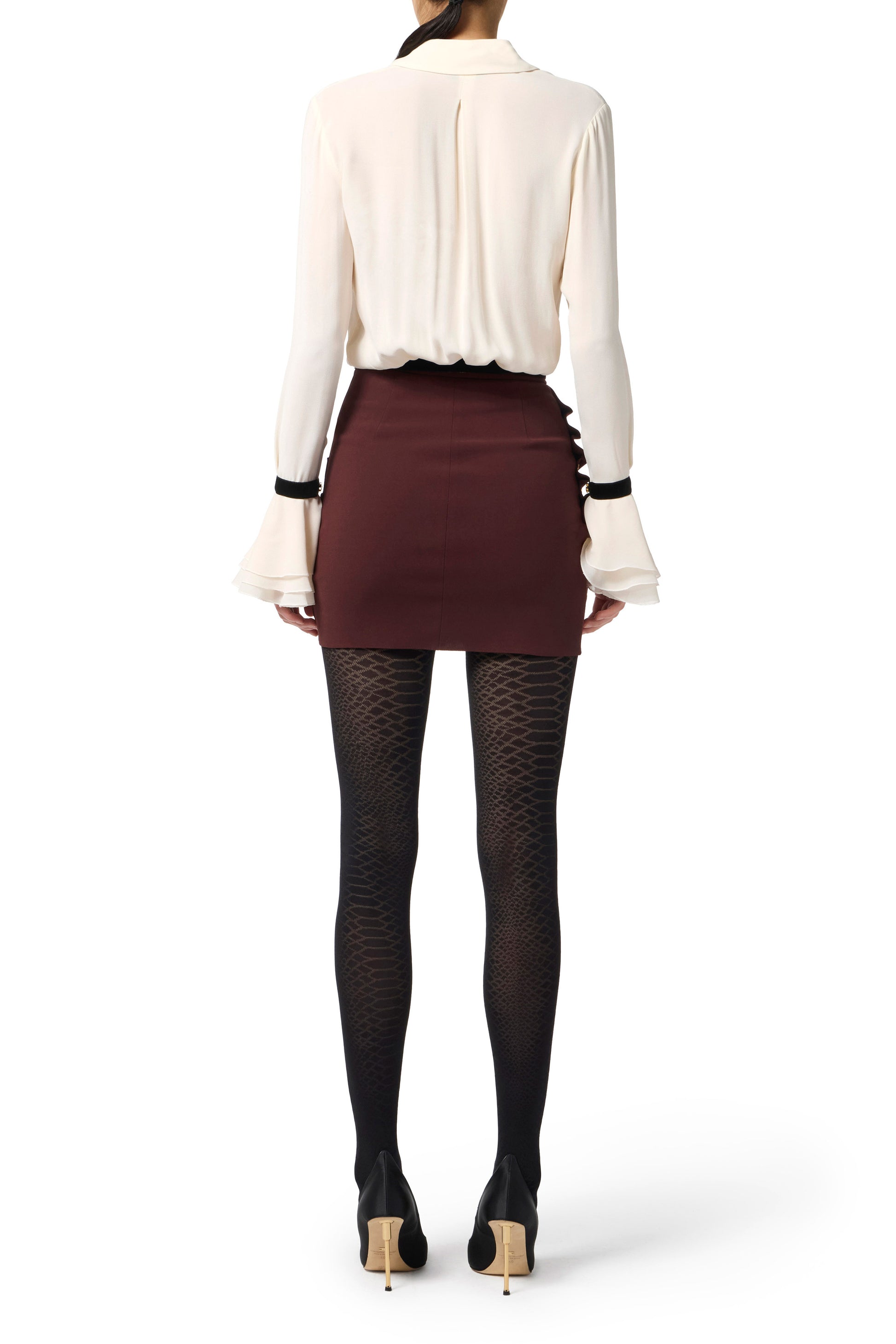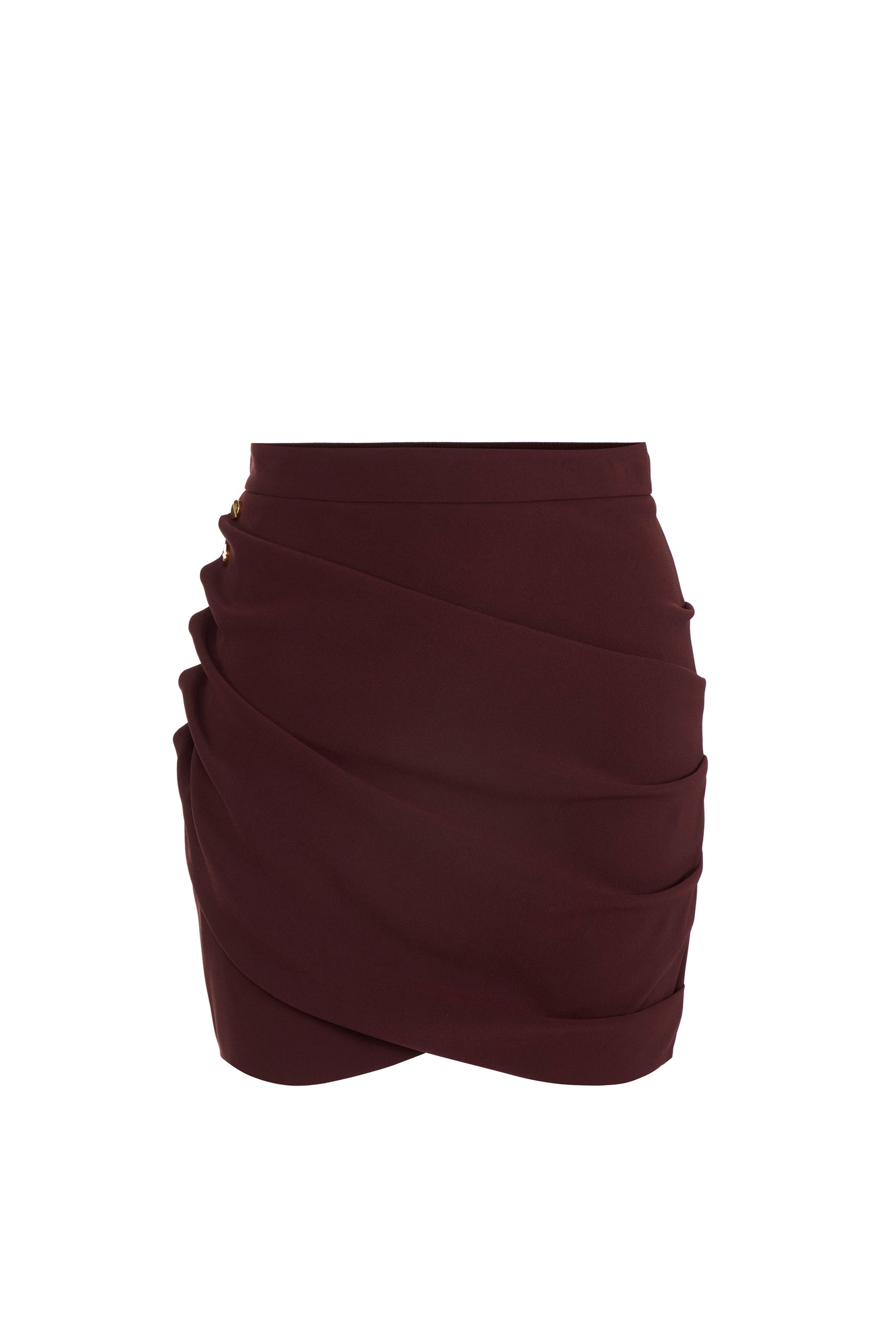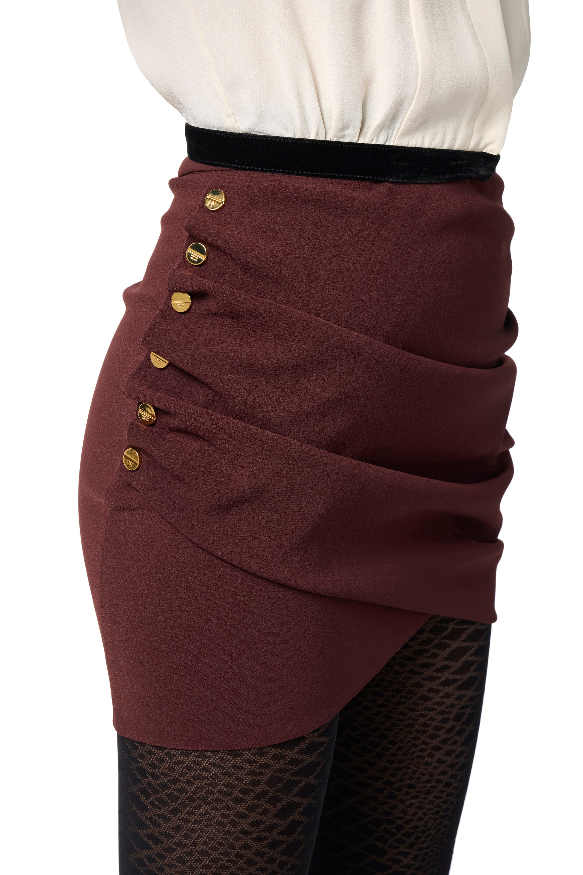 Skirt in lightweight crêpe fabric with slim fit. It is characterised by draping that creates movement, held together with golden metal logo buttons on one side.