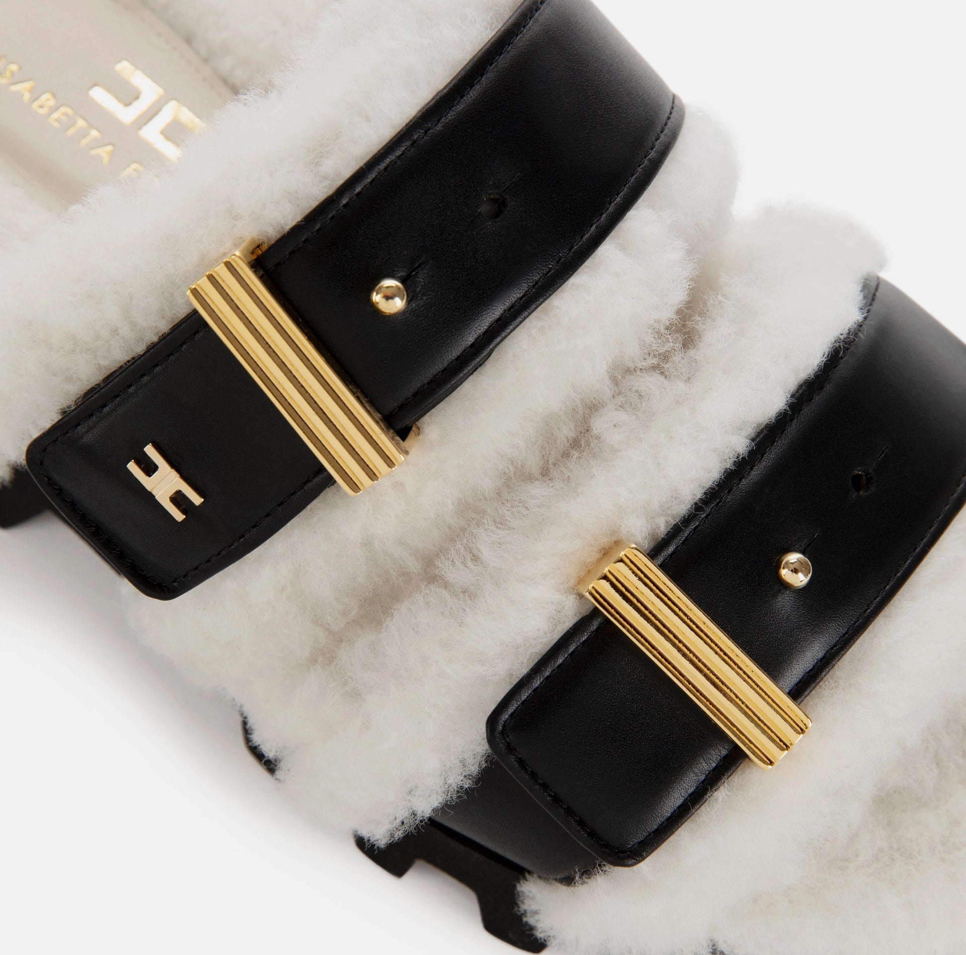 Sheepskin slide sandal on a maxi lug sole. It features 2 adjustable buckle straps, metal loops with golden metal logo rivet detail