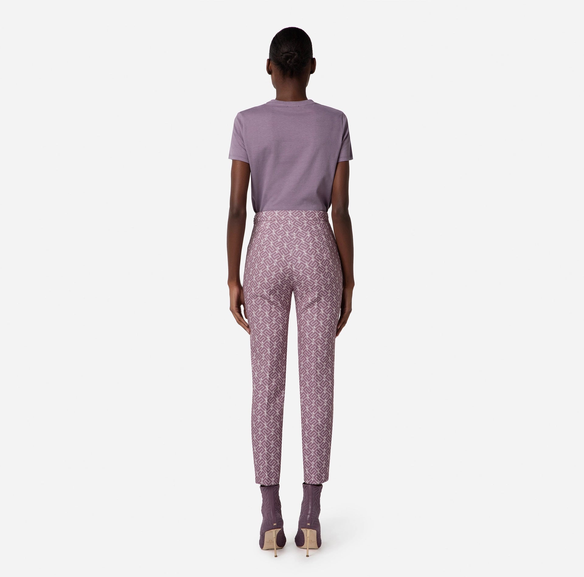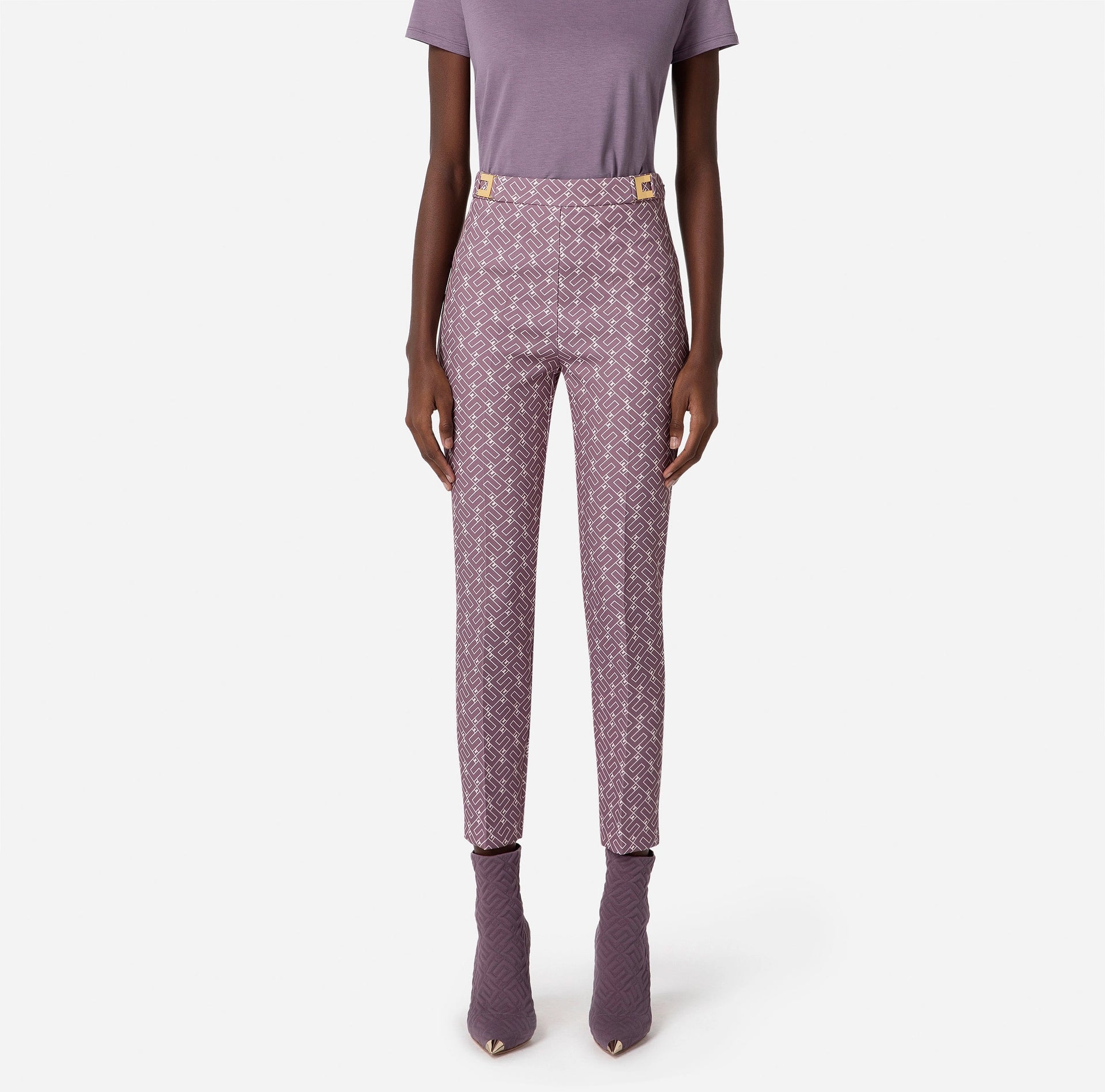 High waist cigarette trousers in double layer stretch crêpe with all-over logo print. Application of golden metal logo plaques on the sides