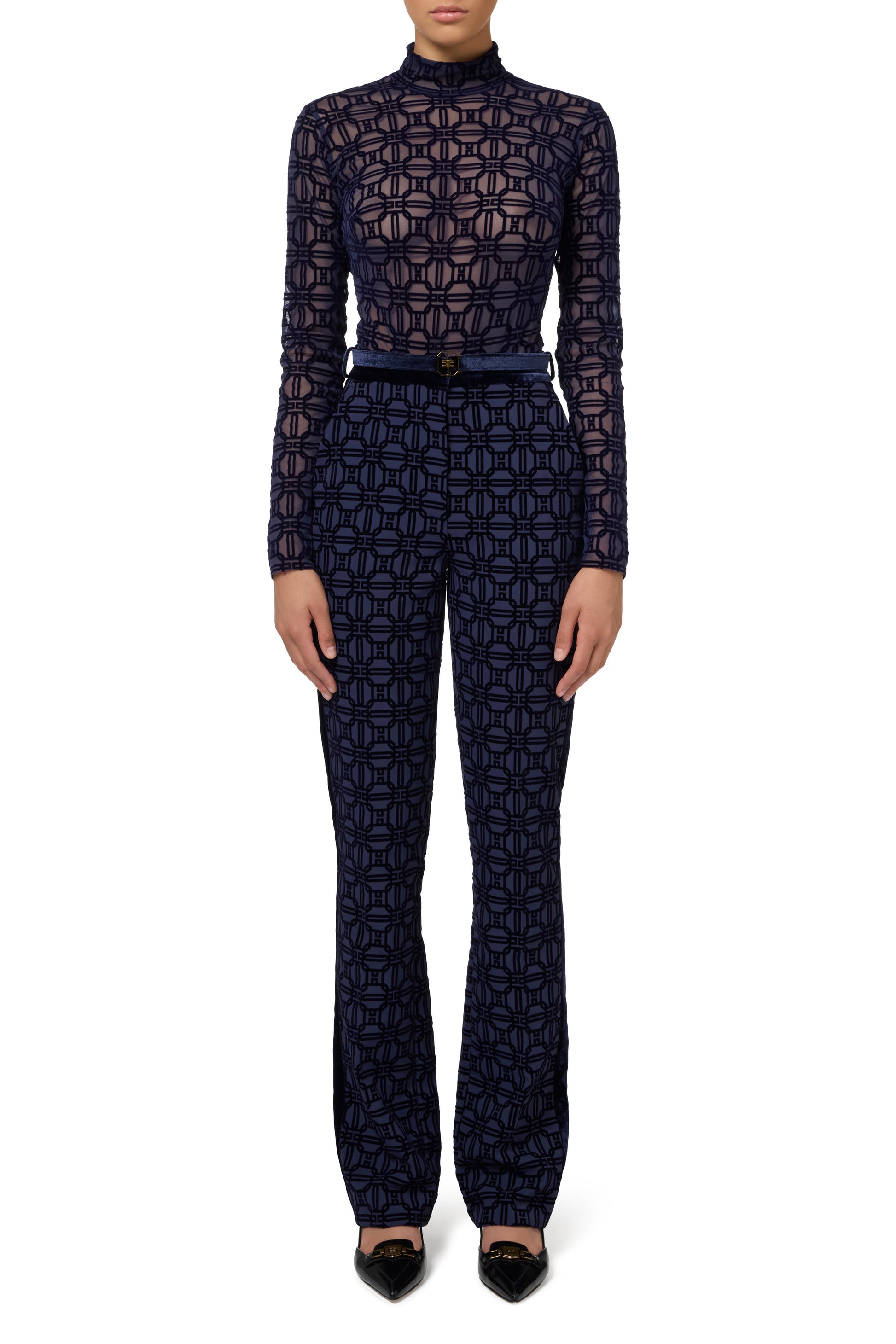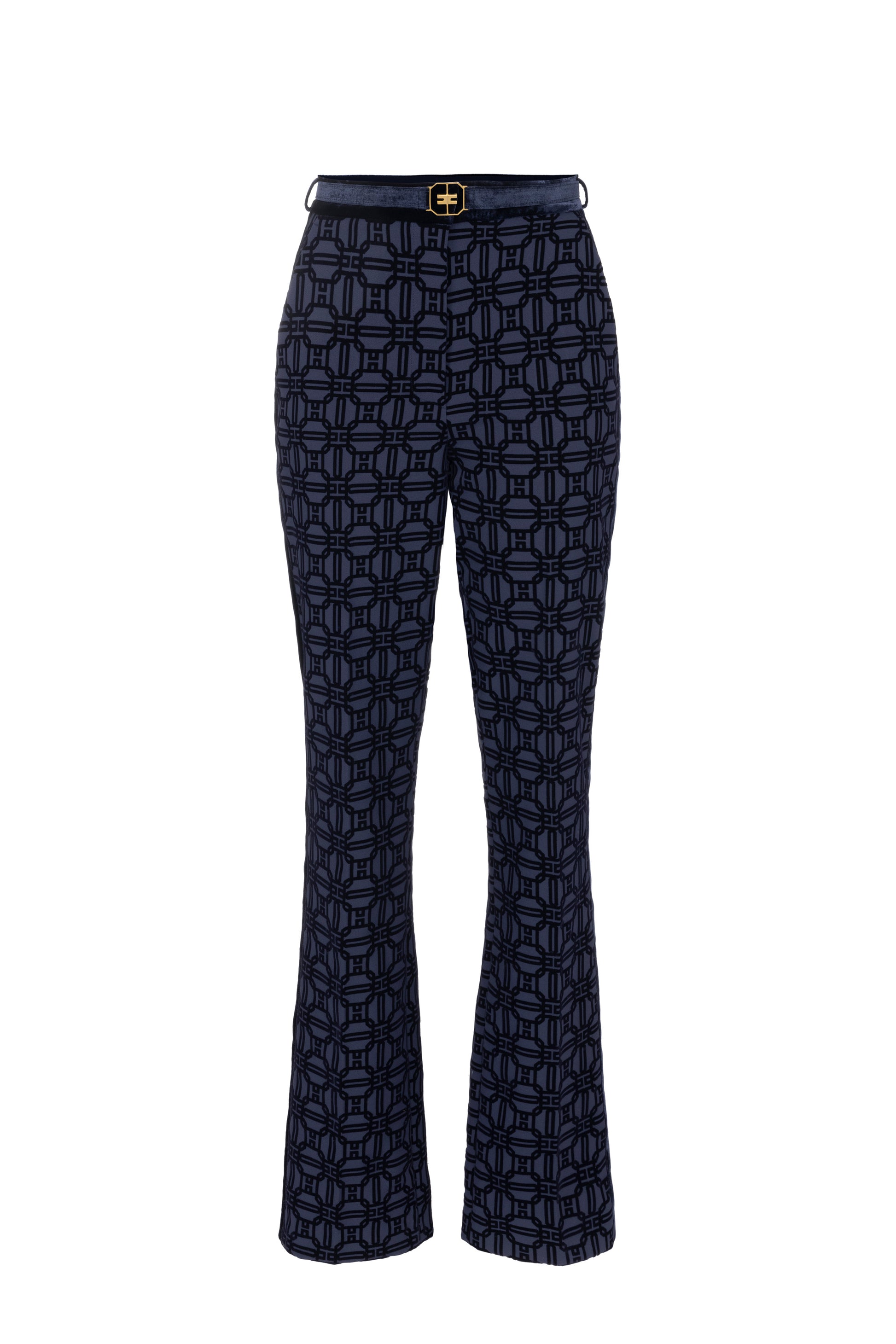 Straight trousers in all-over flock print crêpe fabric and velvet side bands with slant pockets on the front. The waist is emphasised by a velvet belt with golden metal buckle.