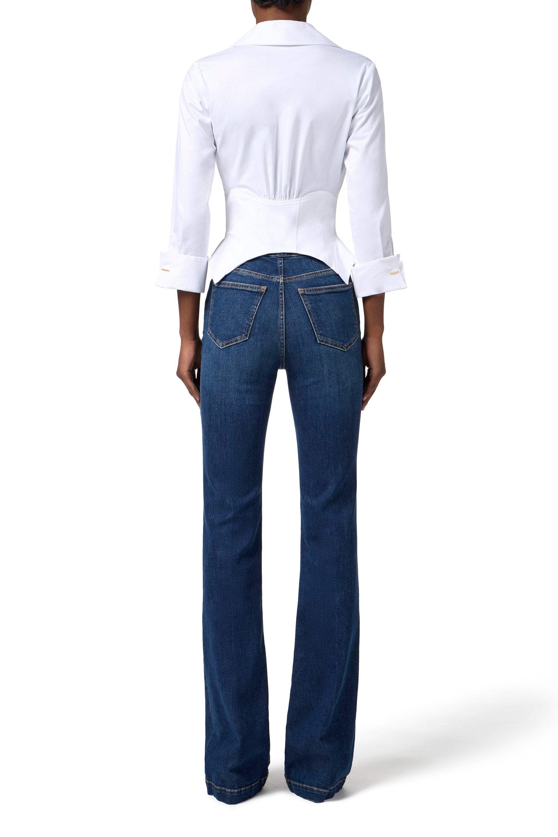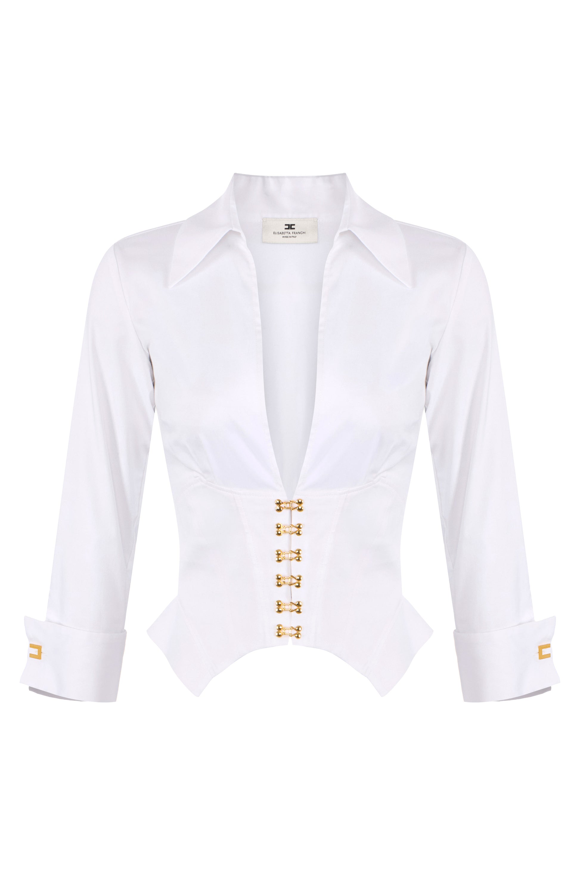 Shirt in stretch cotton fabric with slim fit. It has a collar with v-neck and ¾ sleeves embellished with cufflinks with logo. It features a bustier construction overlapping the waist, decorated with golden metal claps and side flaps.