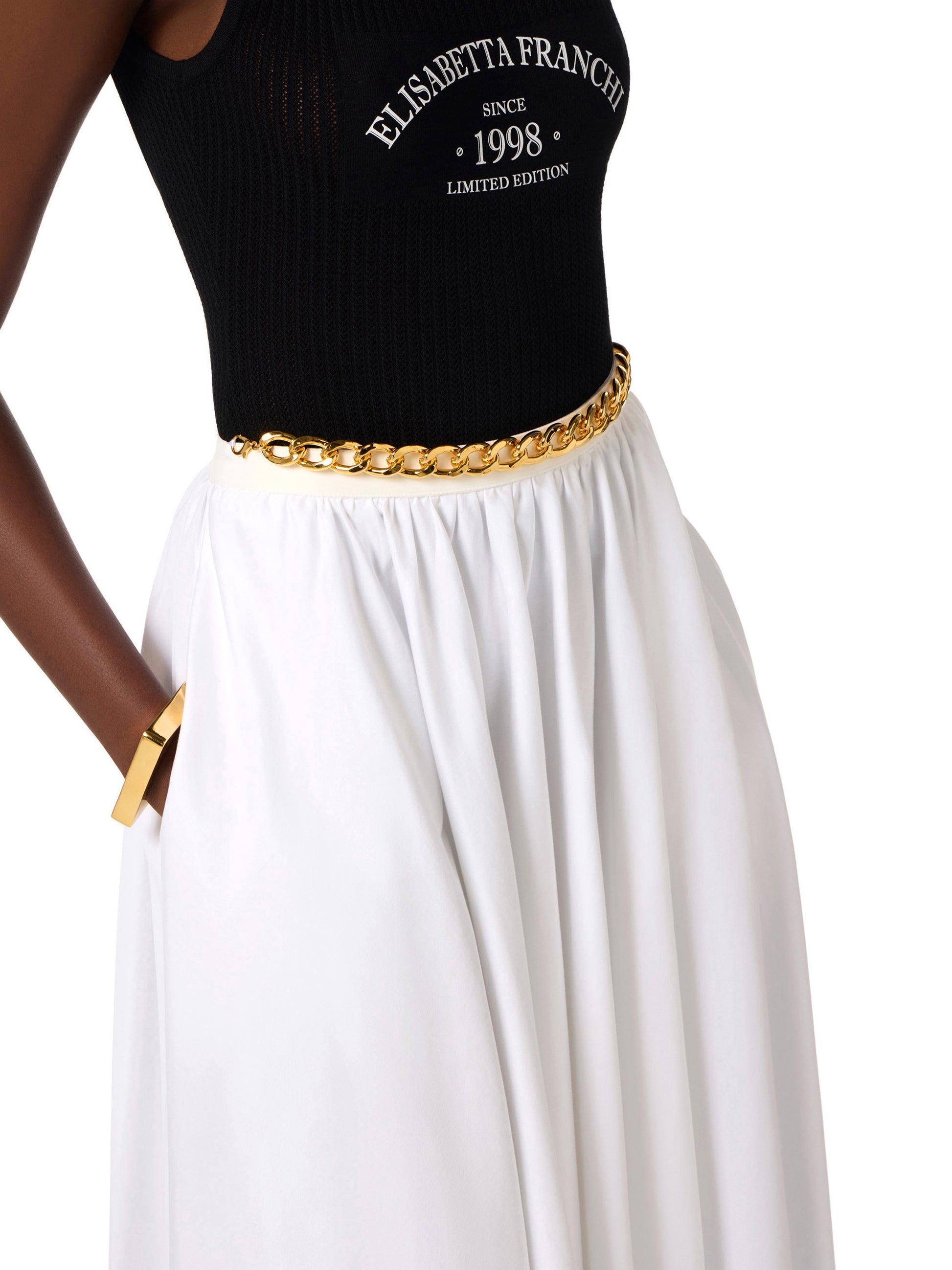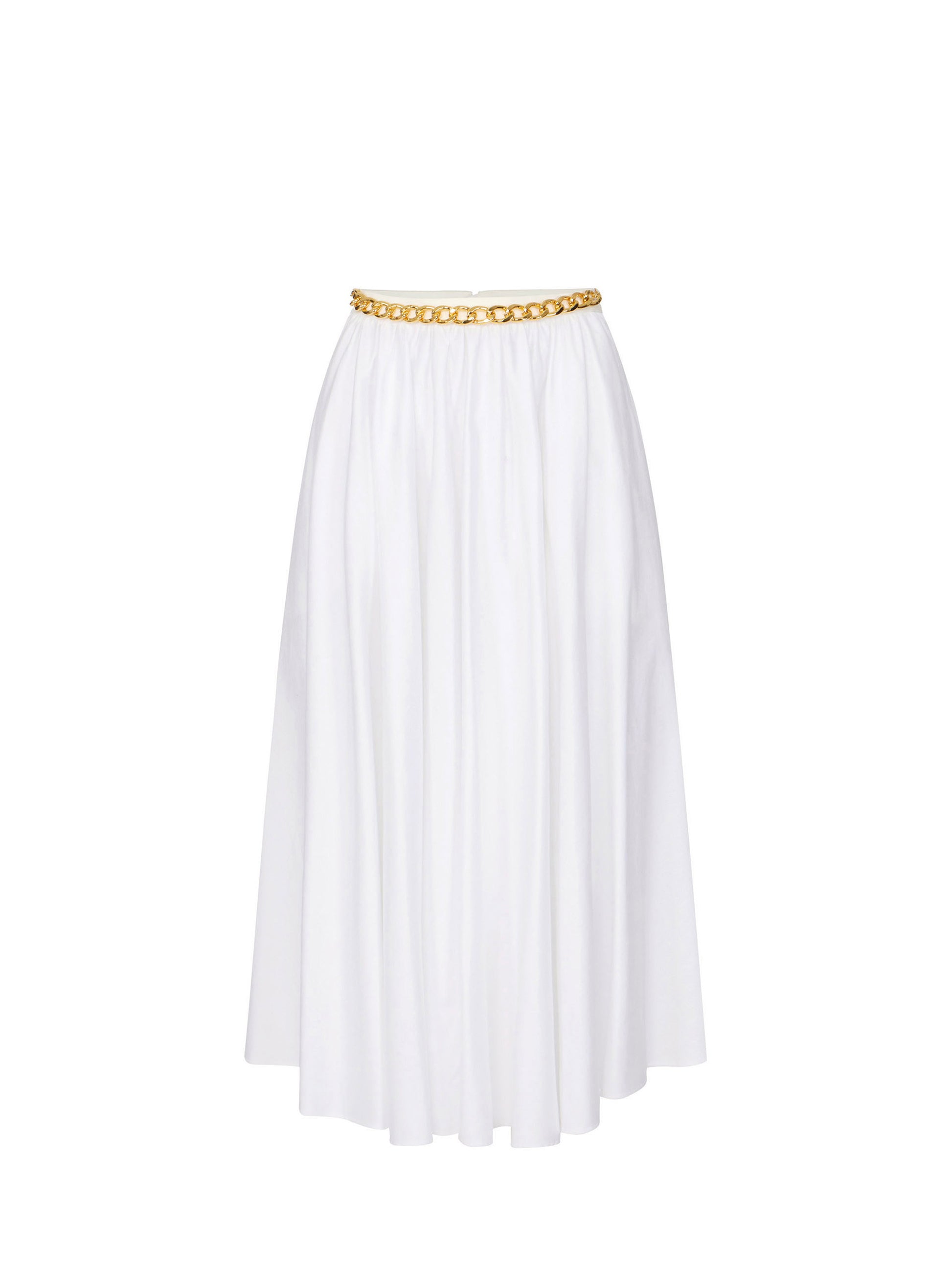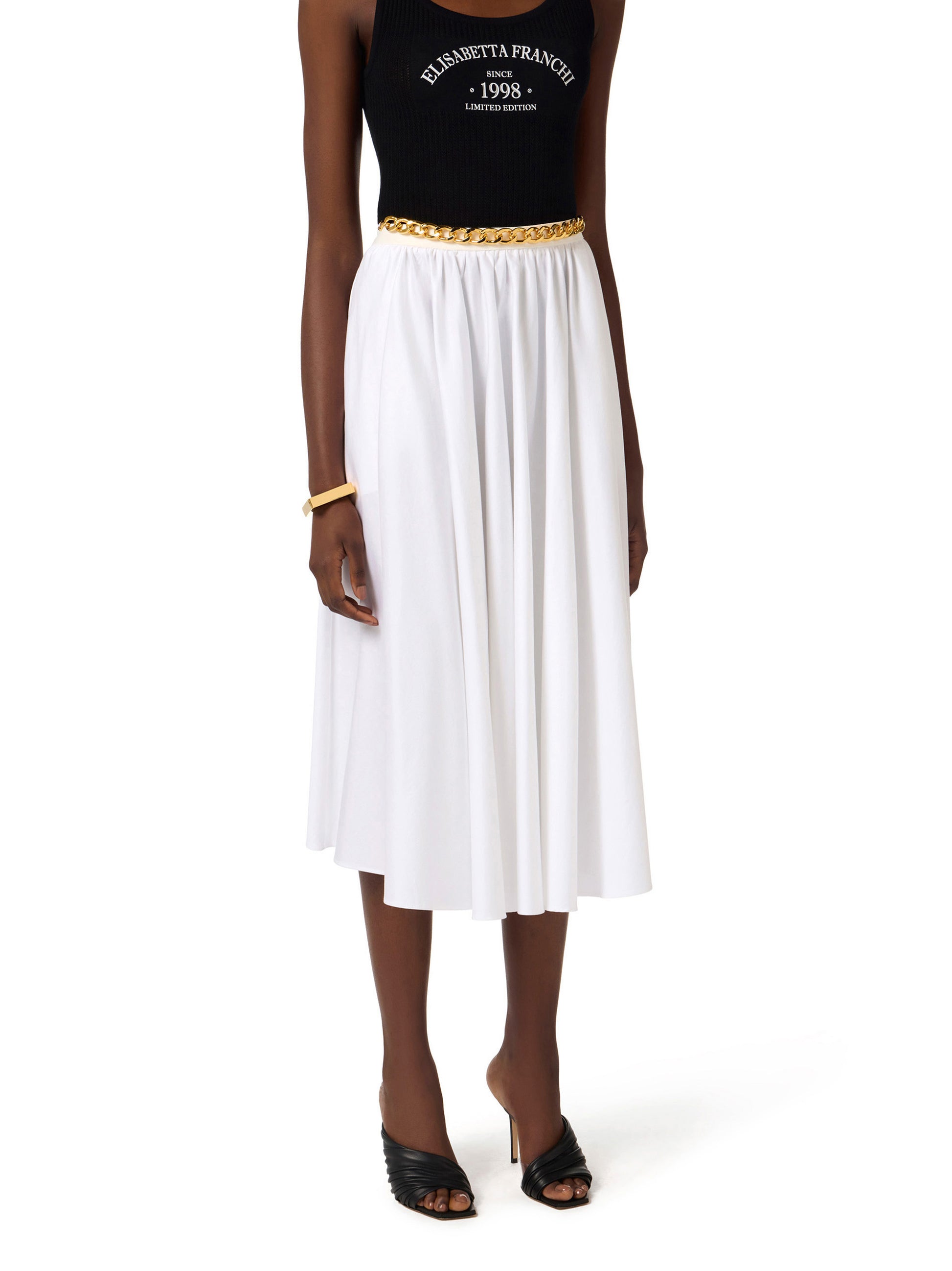 Stretch cotton skirt. The circle design adds movement to the garment refined silhouette. The waistline is decorated with a jewel chain, featuring a removable logo charm with snap-hooks. Regular fit.