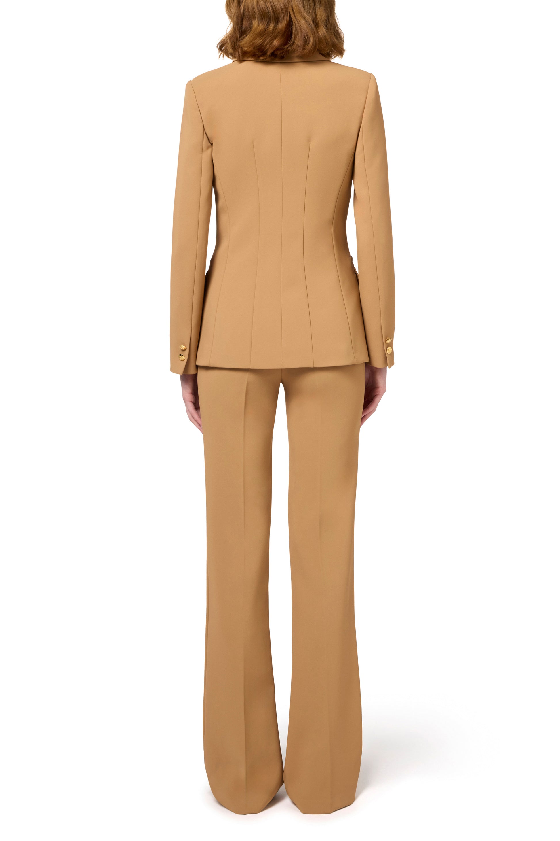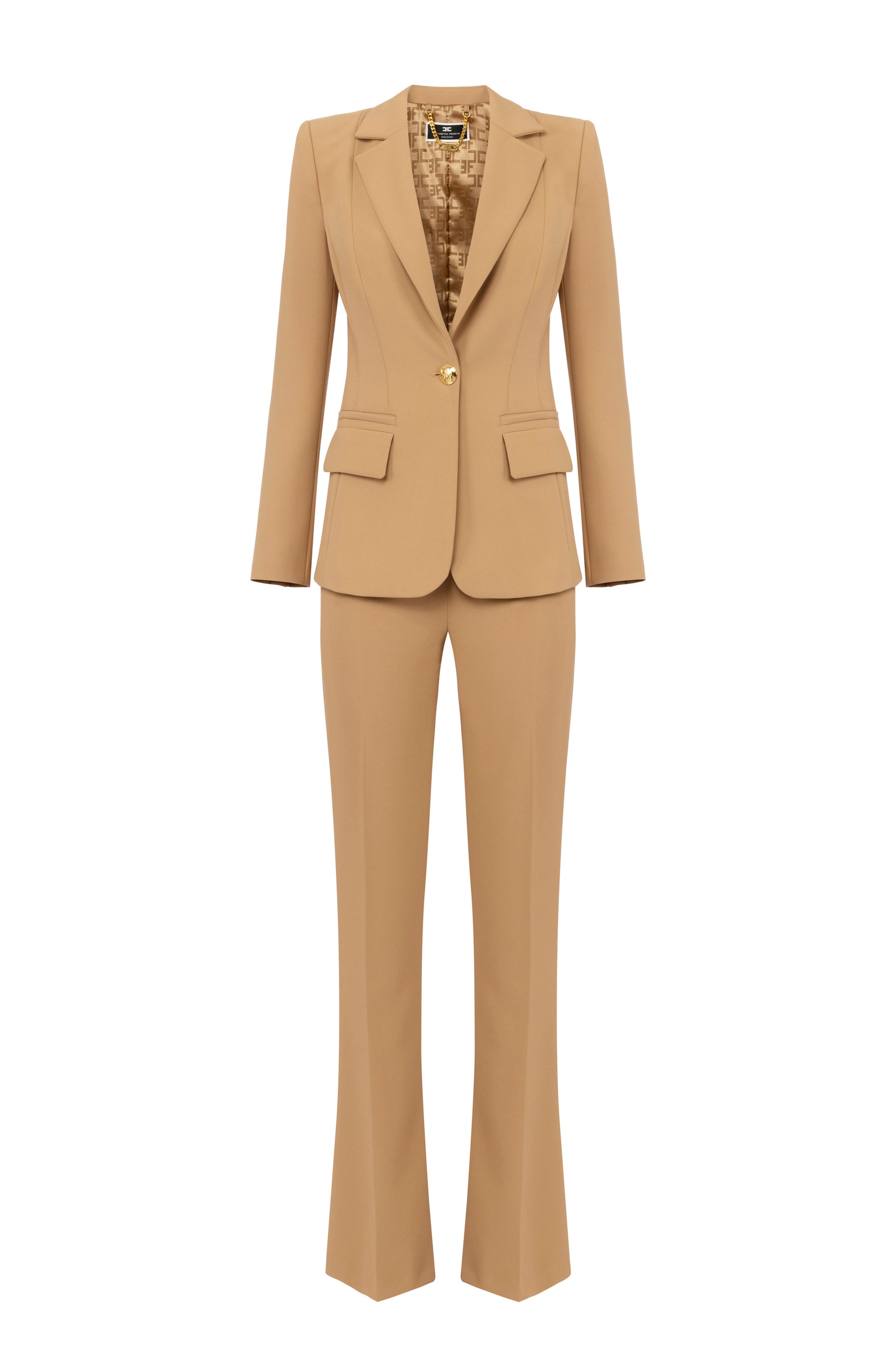 Stretch crêpe suit consisting of a fitted jacket with single-breasted fastening and welt and flap pockets. Straight trousers slightly flared at the bottom with logo rivet on the waistband.
