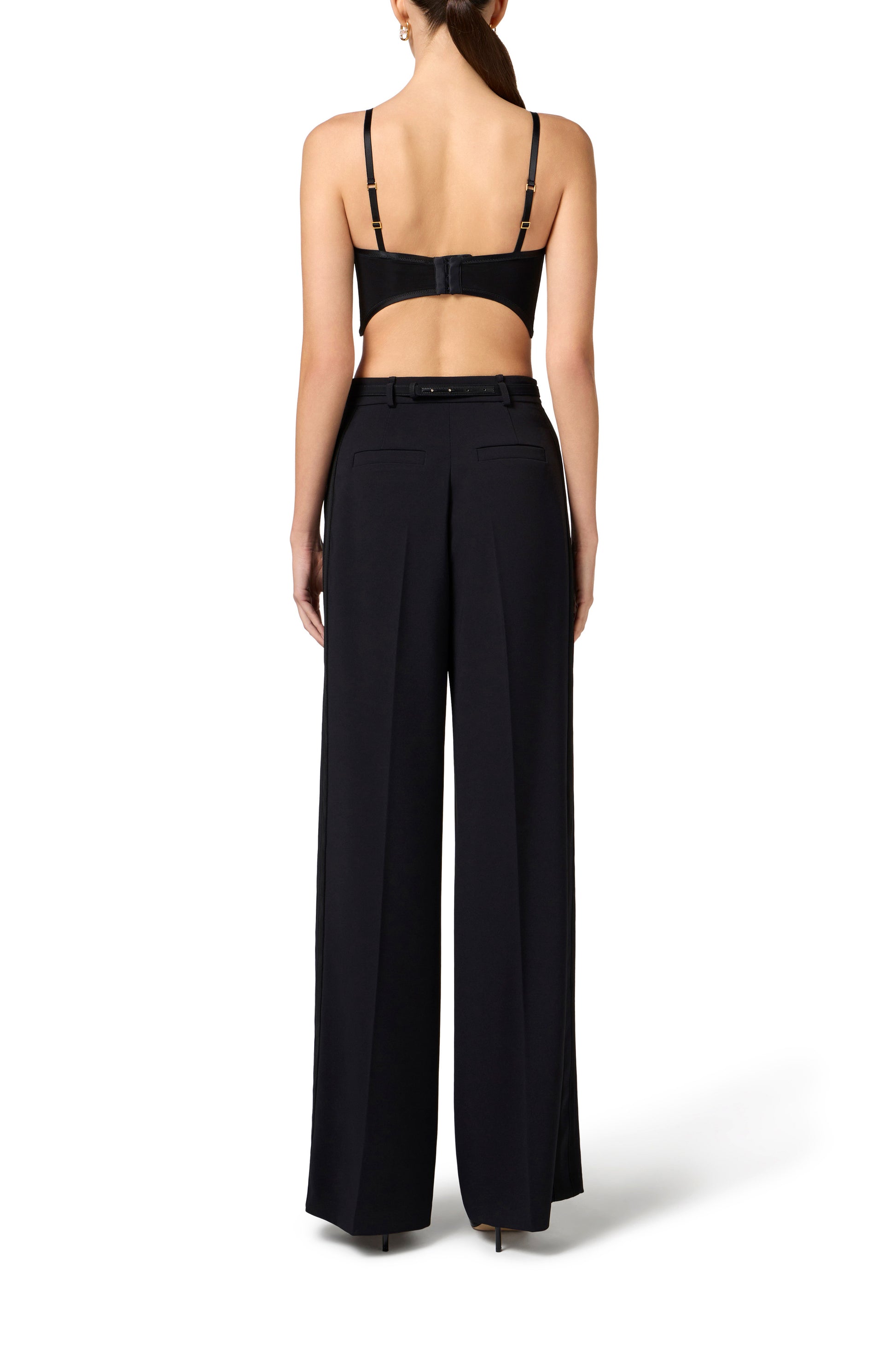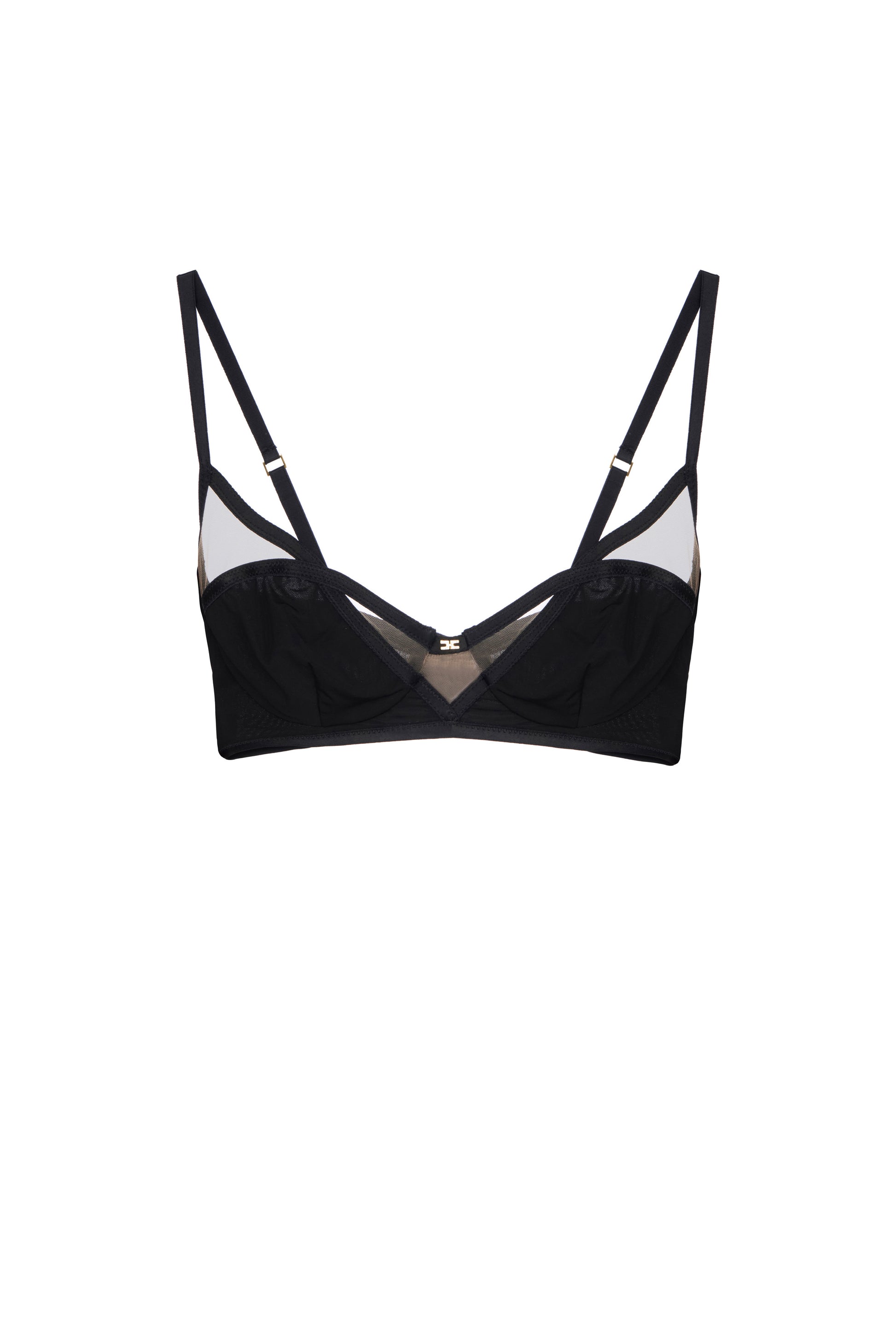 Stretch organza bra with adjustable straps and hook fastening at the back. It stands out for the tulle inserts that create particular plays of transparency. The central logo with rhinestones adds a touch of light.