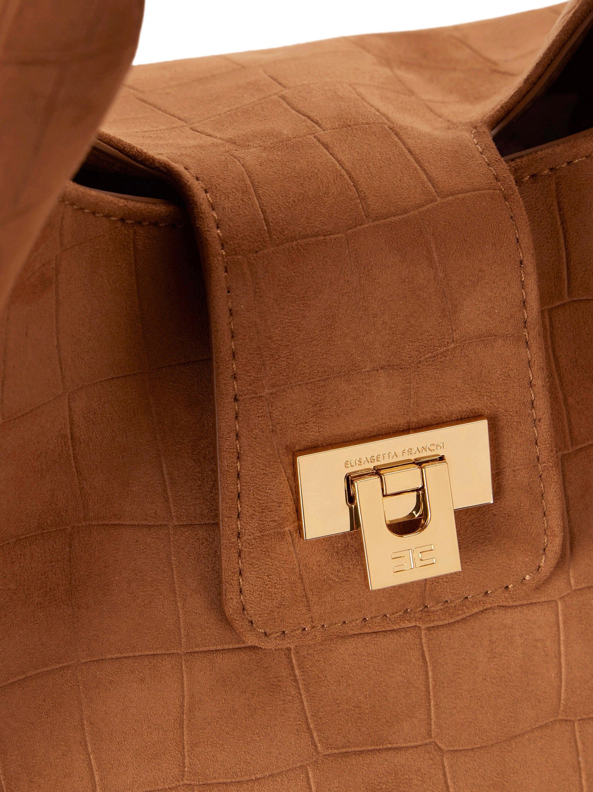 Hobo bag made from suede with a crocodile print texture. The handles are decorated with golden metal intertwined chains. The closure is illuminated by a logo plaque.