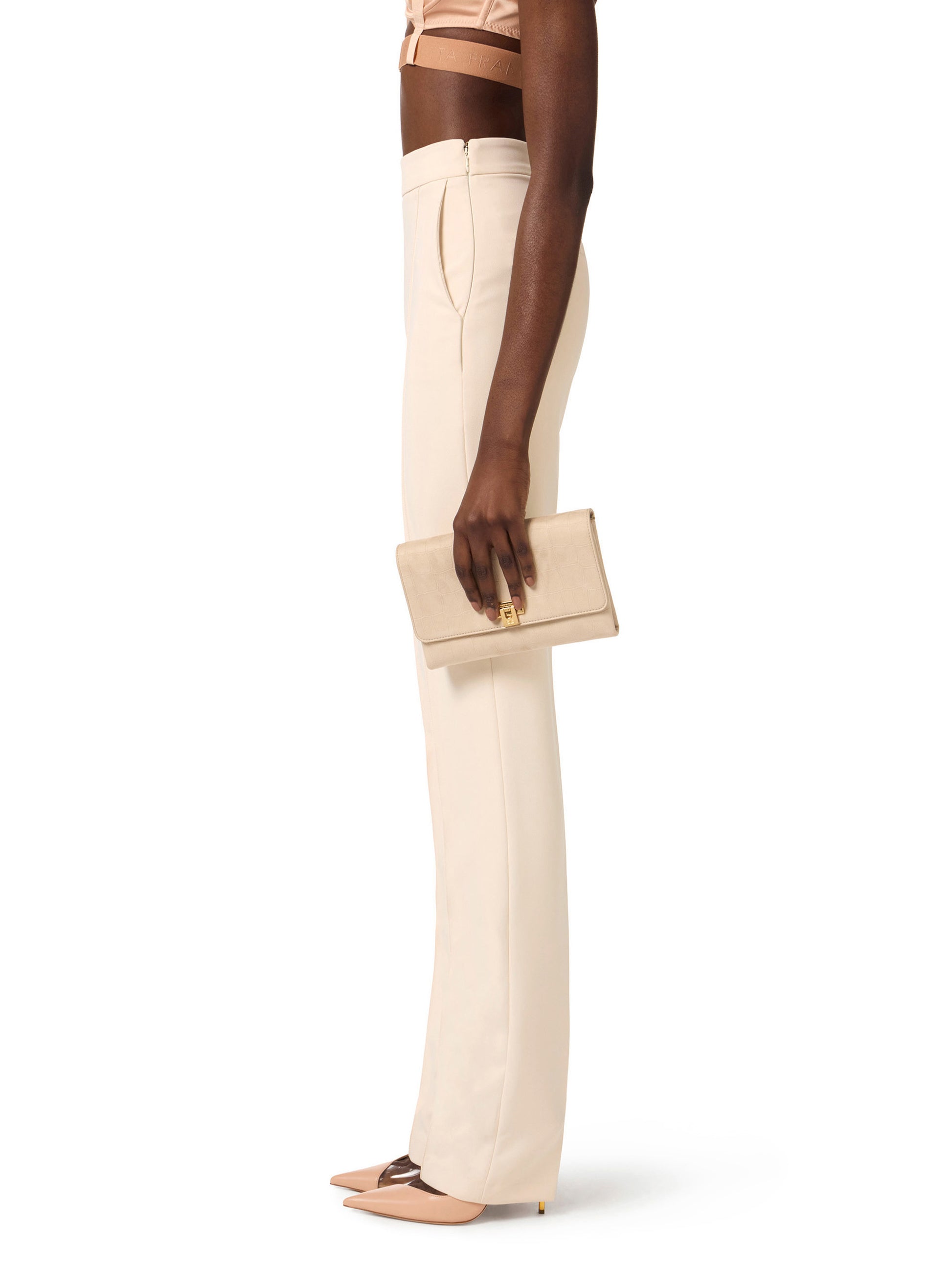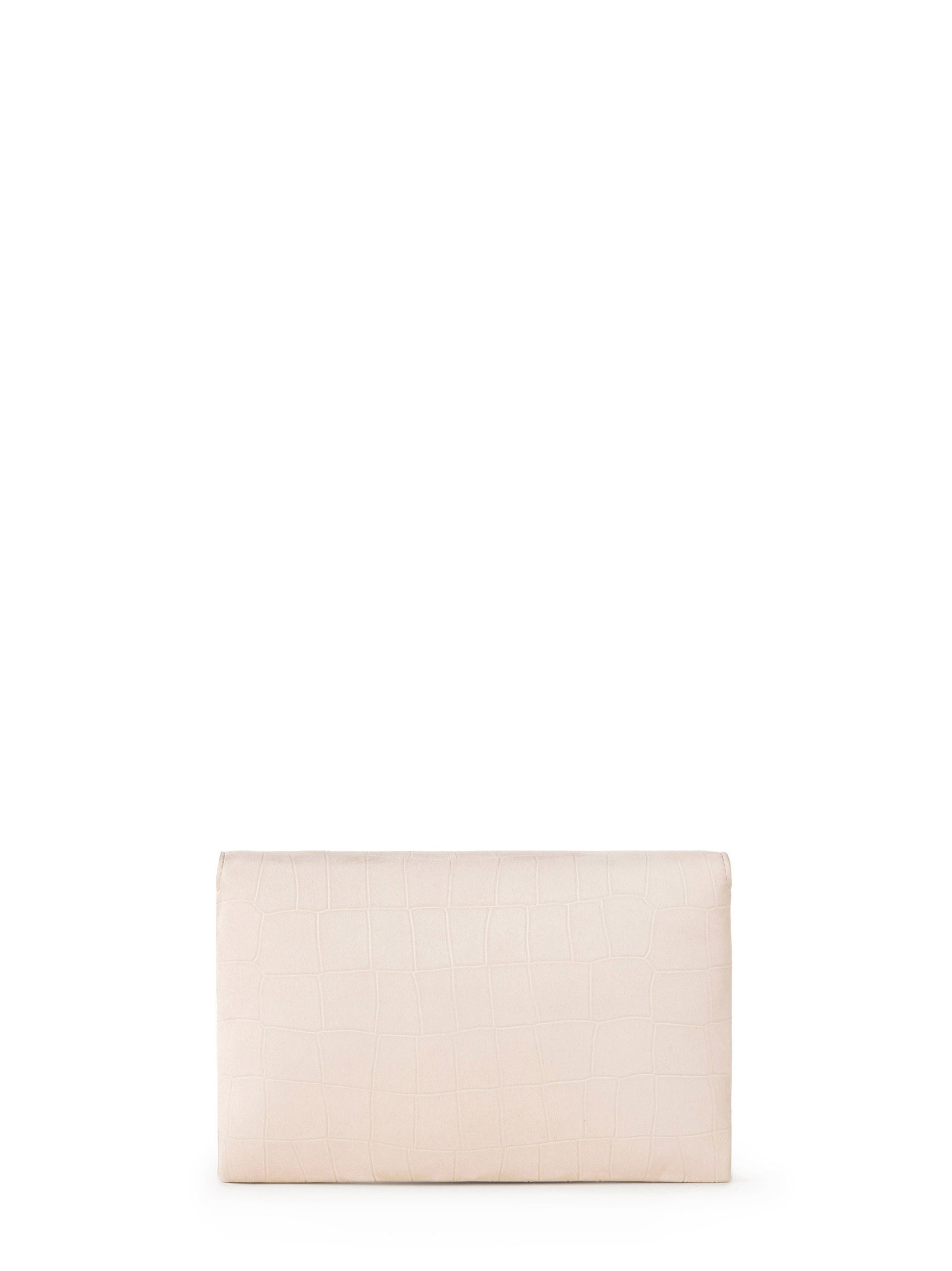 Suede bag. With a compact and minimalist shape, it has a woven shoulder strap and features a crocodile print texture. The closure is decorated by a logo detail.