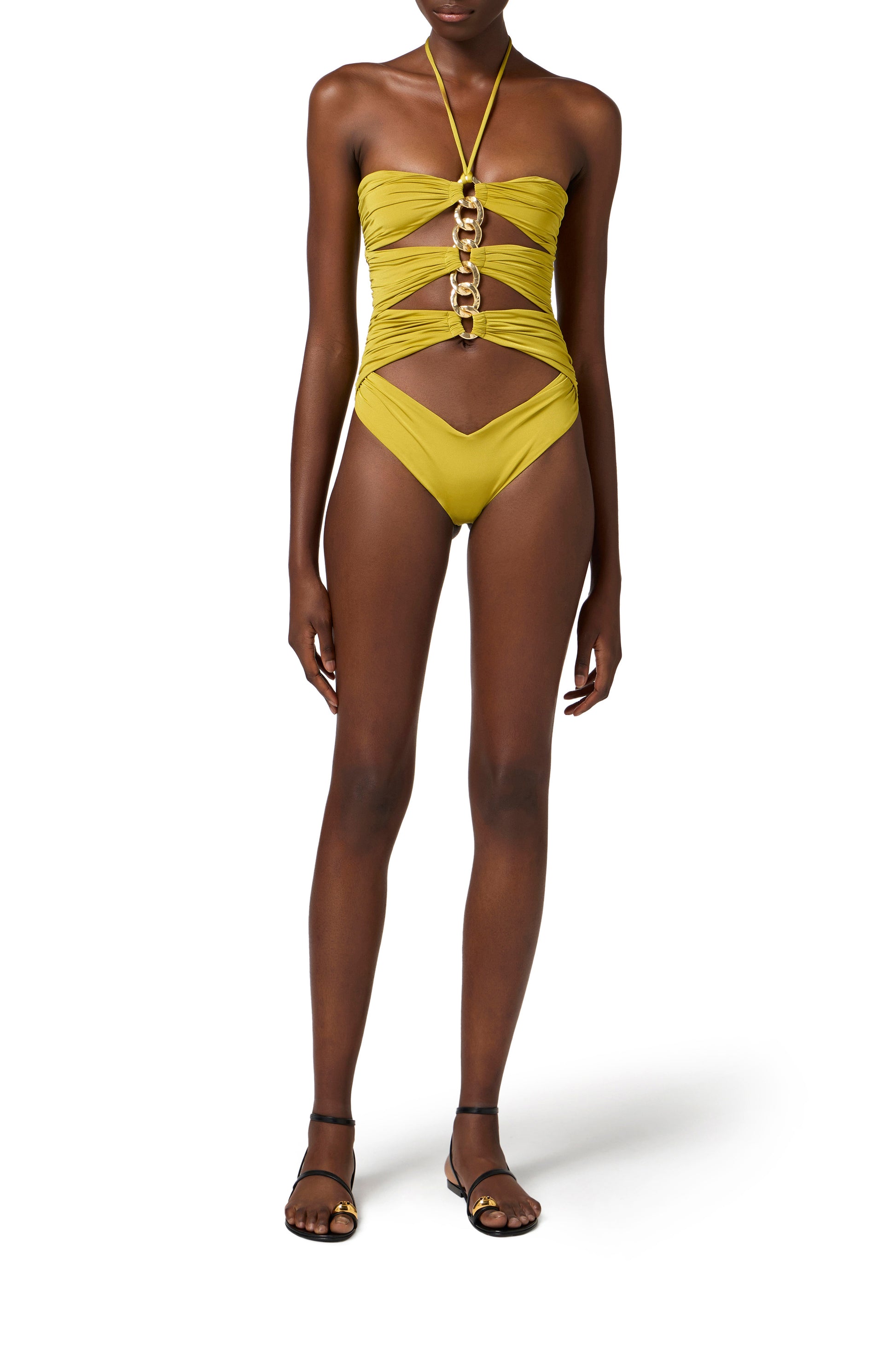 One-piece swimsuit made of shiny Lycra, with a central draped pattern embellished with a golden metal chain.