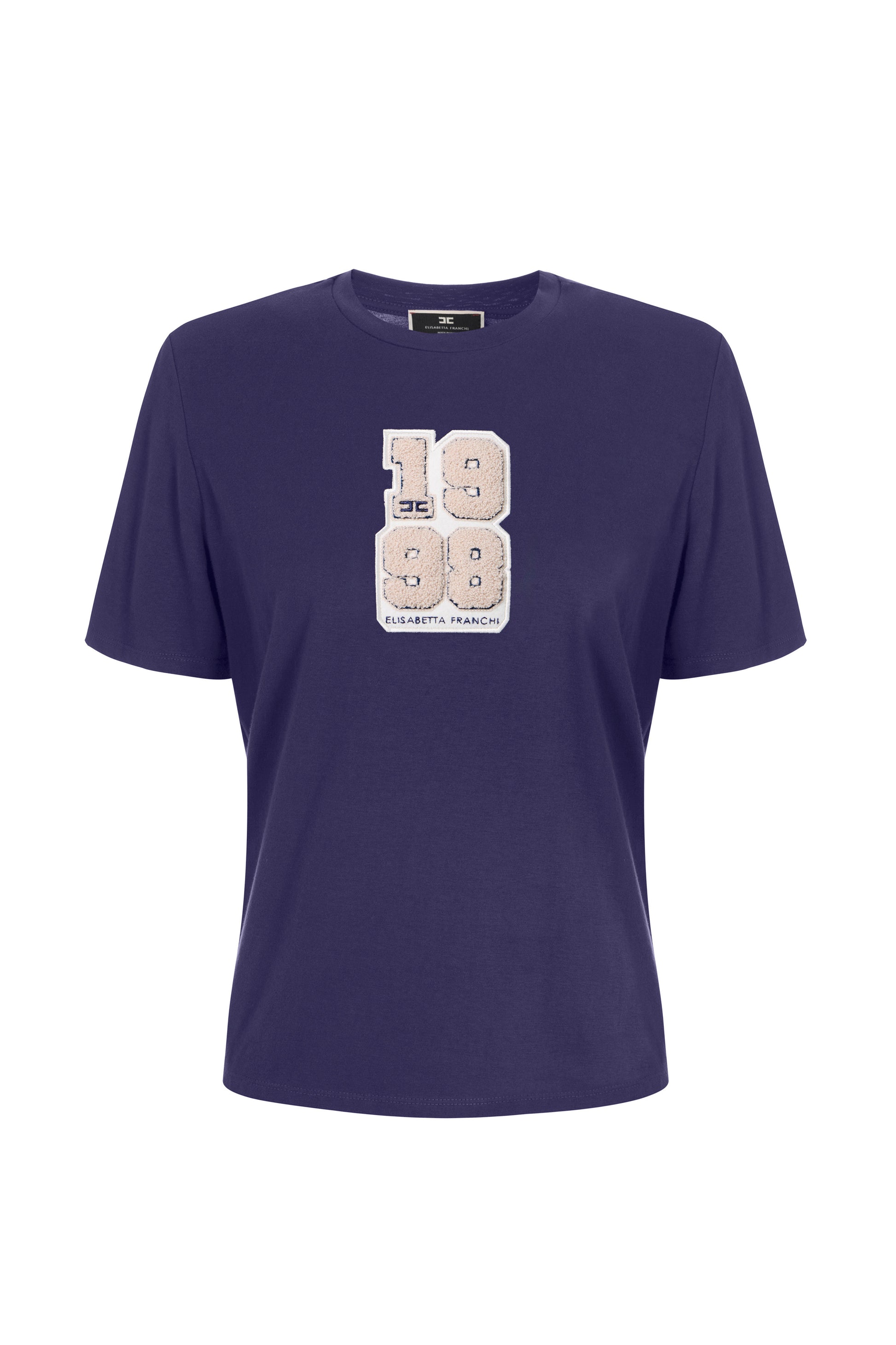 Cotton jersey T-shirt with college-style logo patch in contrasting colour. It features structured shoulders.