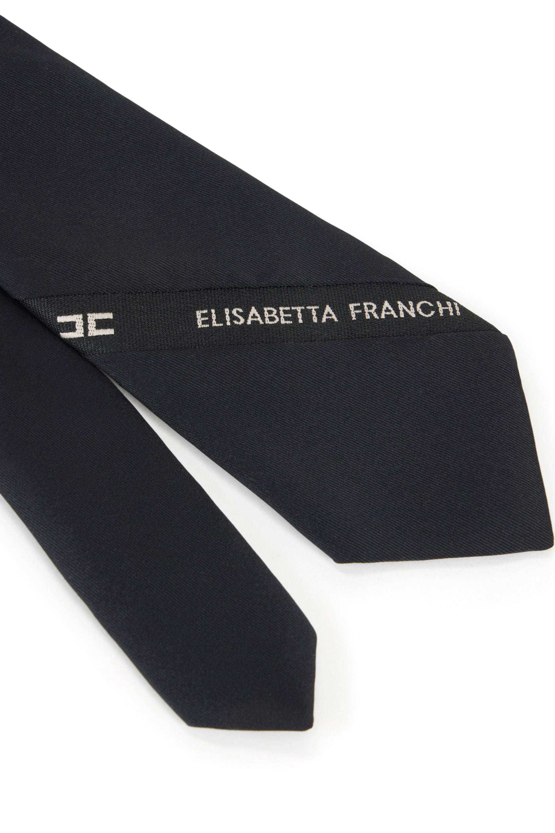 Twill tie. The diagonal ribbon with contrasting logo inlaid at the bottom personalises the accessory.