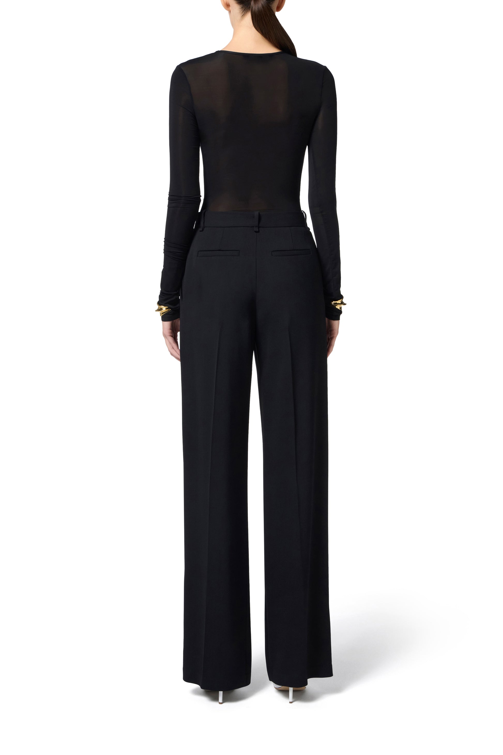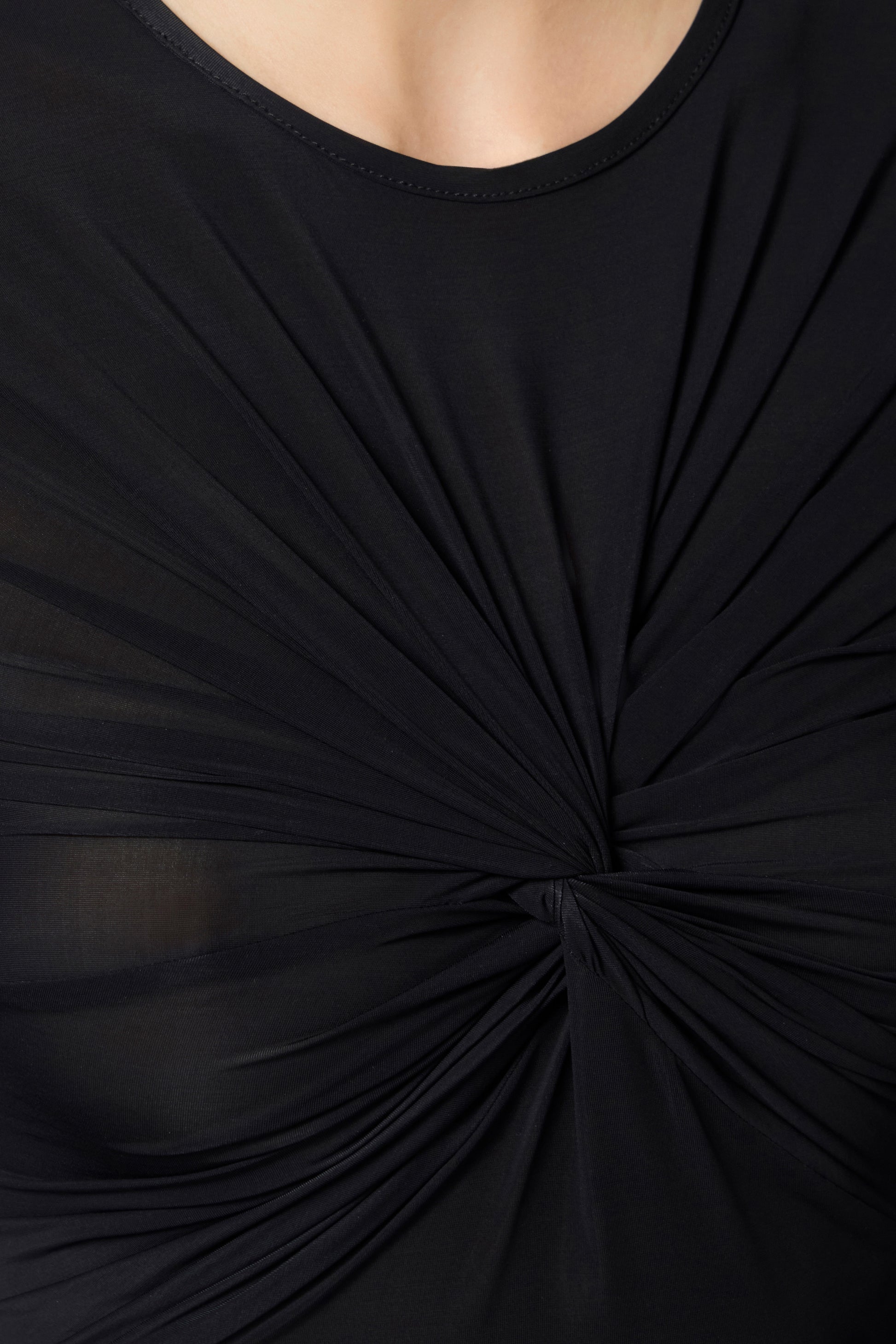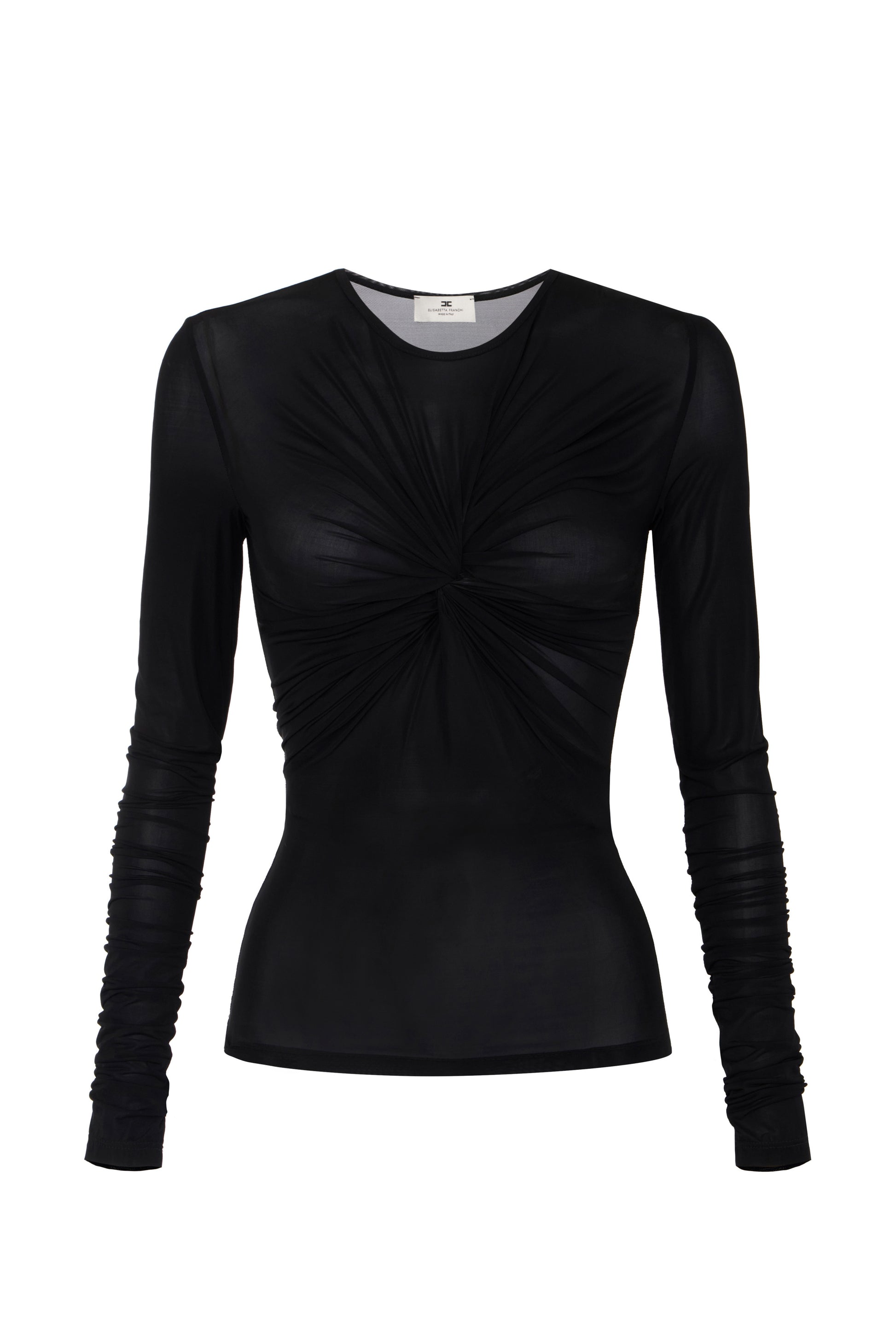 Long-sleeved top with crew neck. The central knot creates a drape pattern that radiates over the bust, giving a sinuous silhouette. Slim fit.