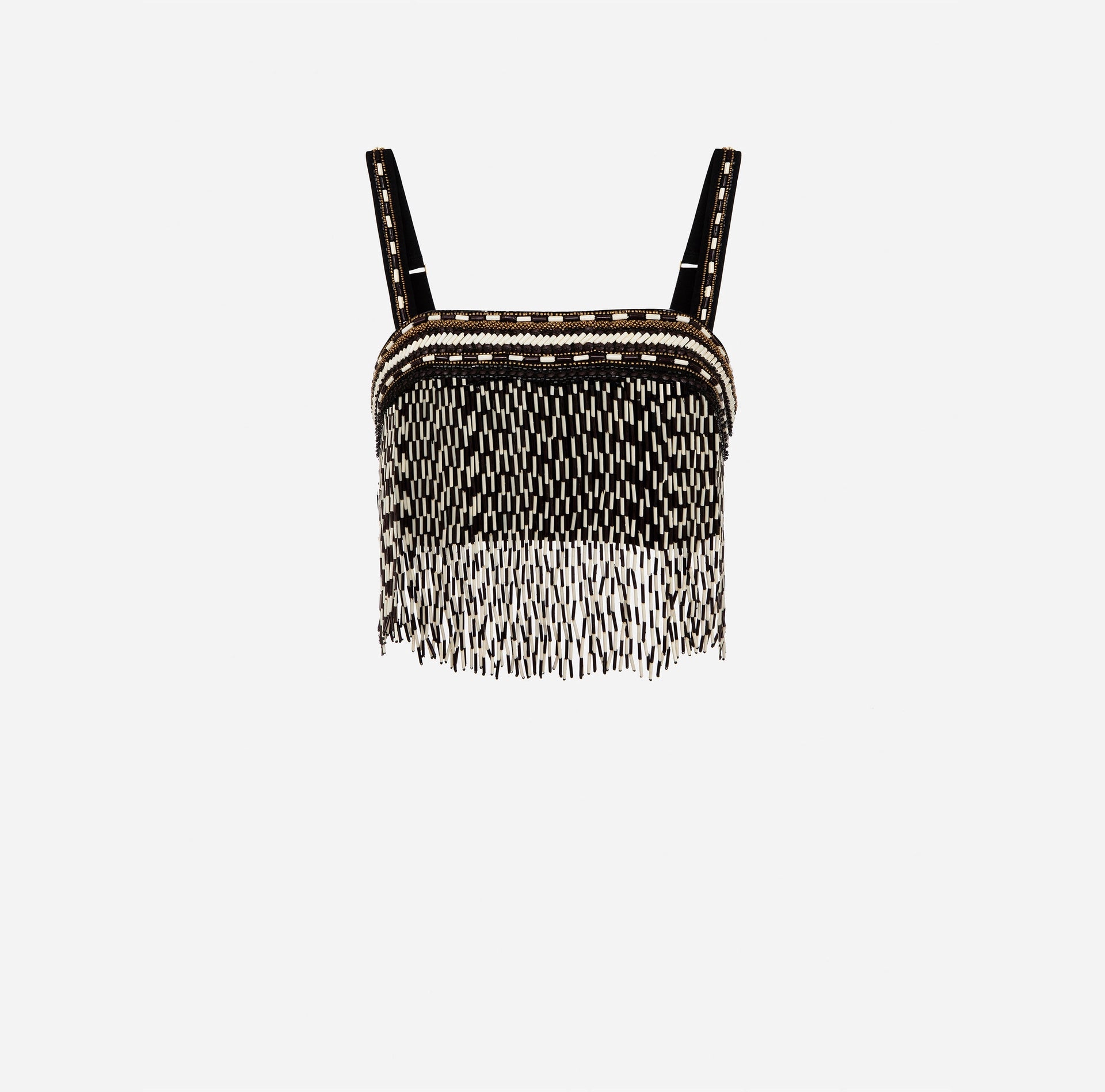 Top with shoulder straps and embroidered piping with chevron design where the two-tone matte-type fringe begins.